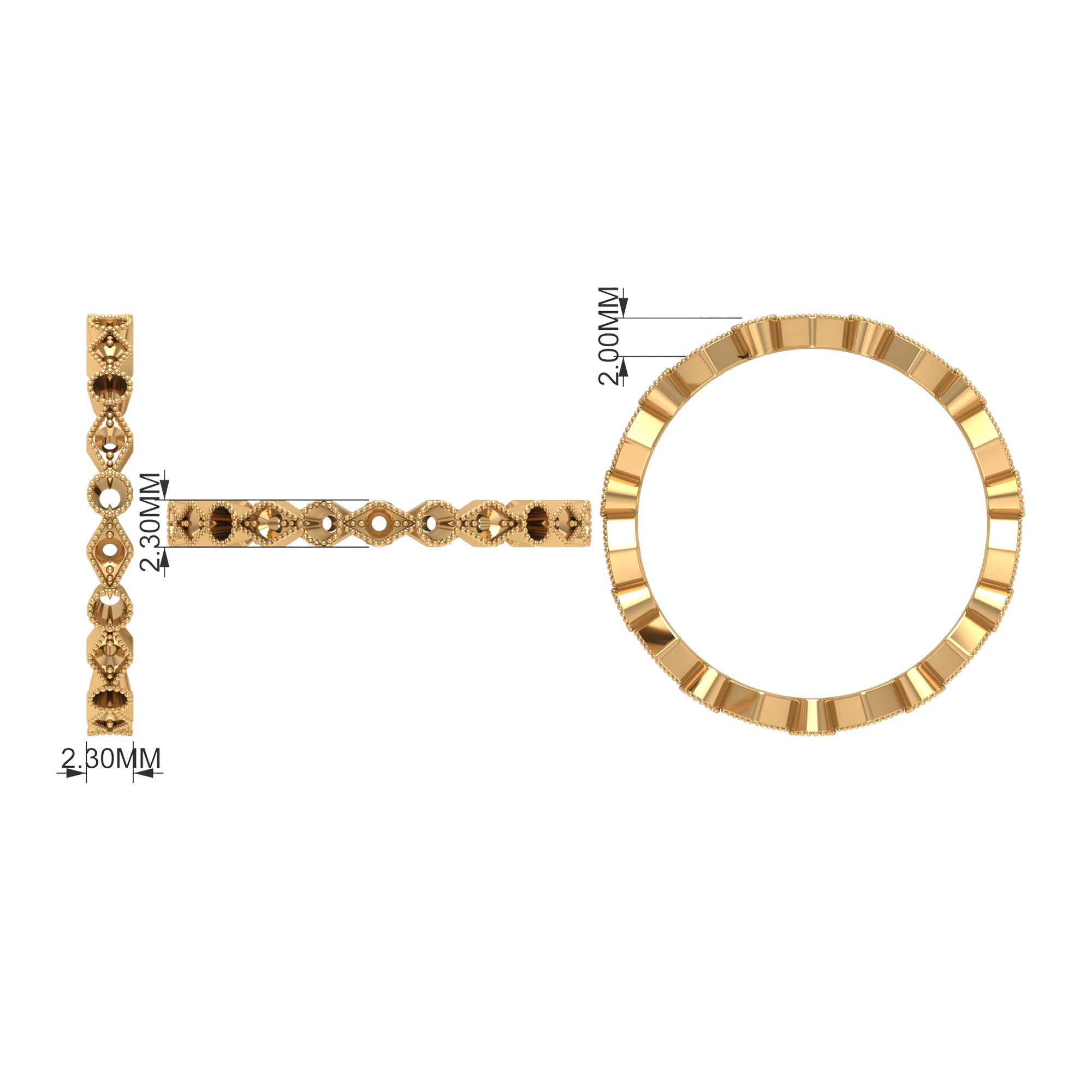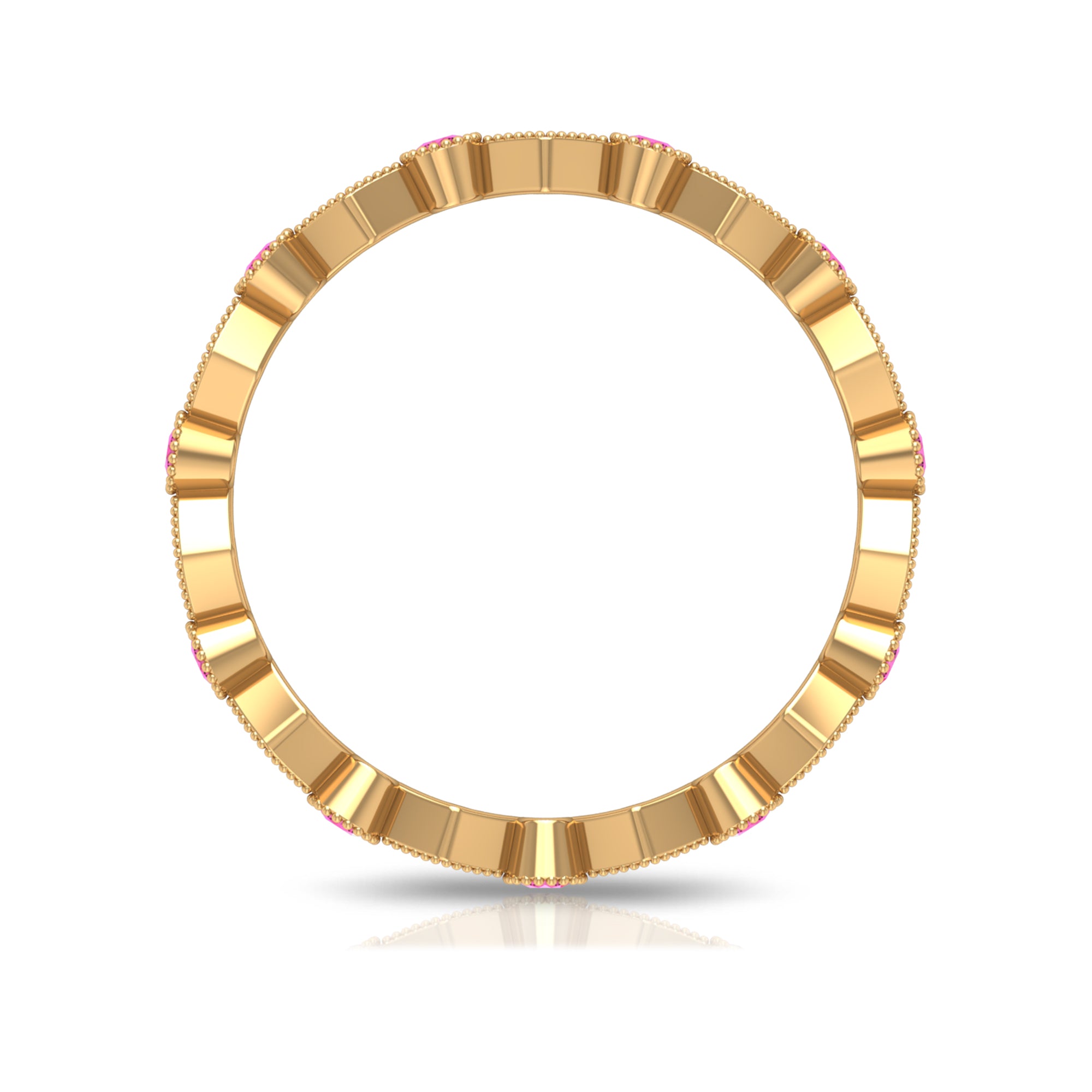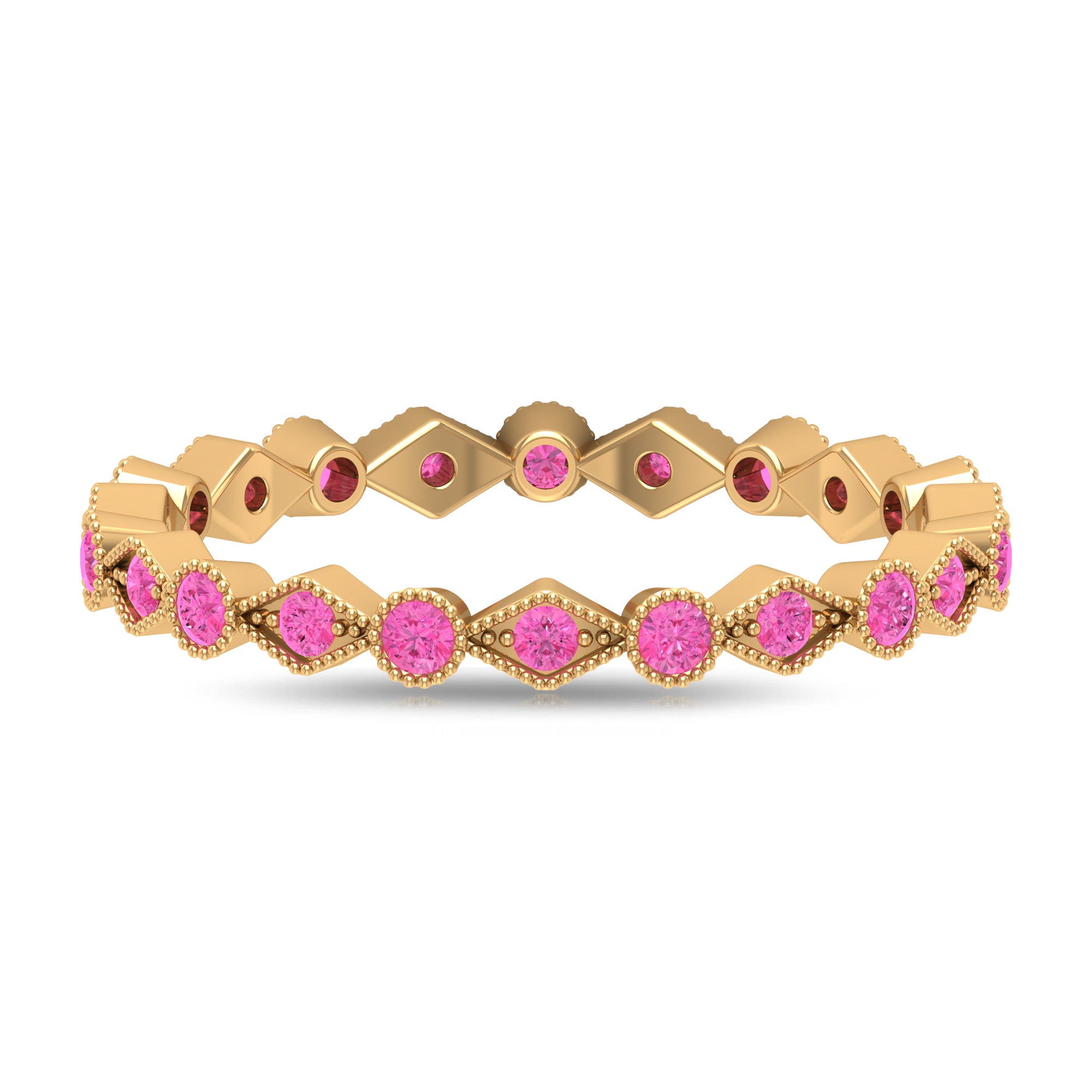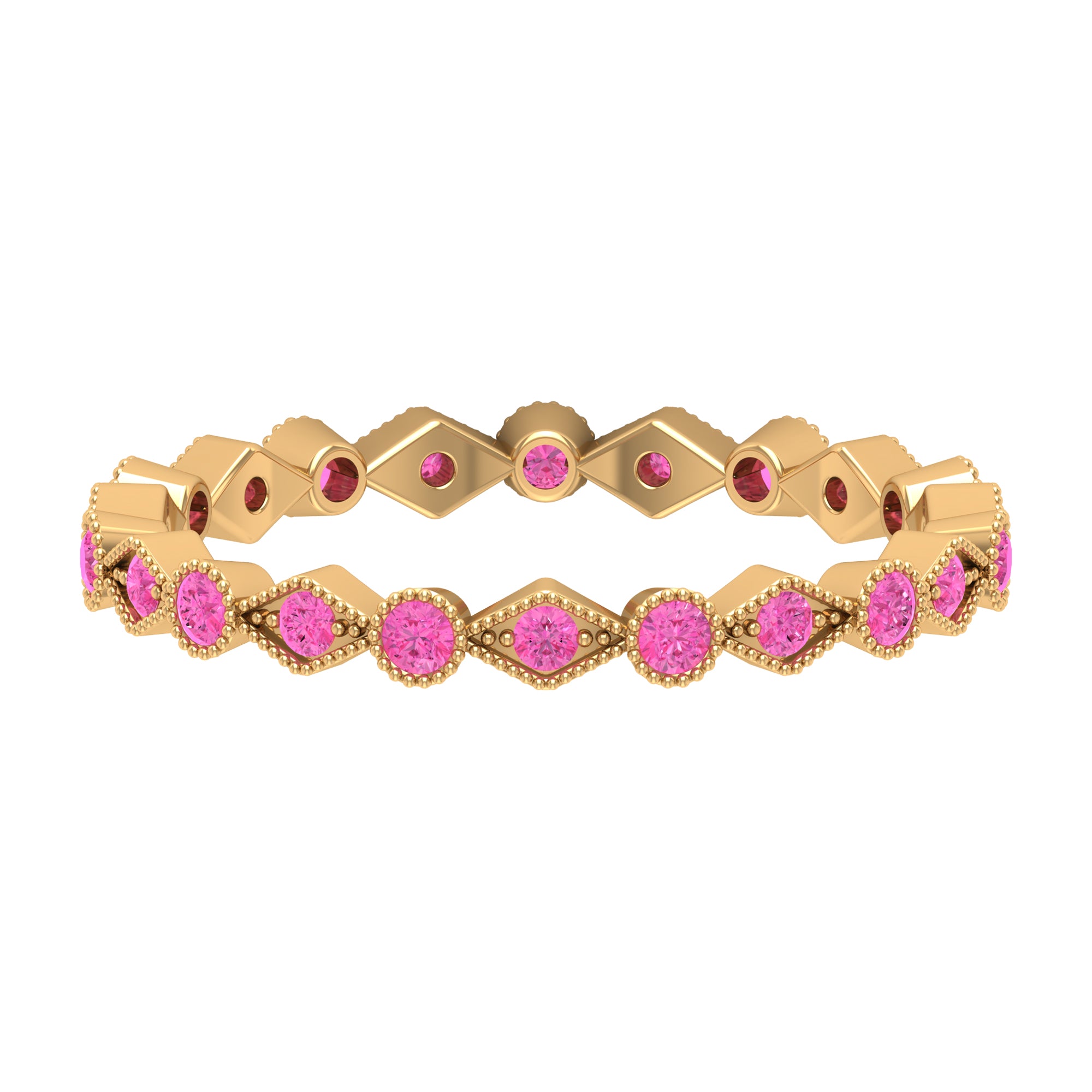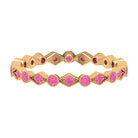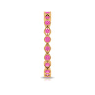 Combine this Fine Jewelry piece with your celebration attire to double the Joy. This unique Stackable Eternity Ring is embellished with Round Shape Created Pink Sapphire set on the entire ring in an alternate setting pattern. The solid Gold Ring is decorated with Gold Beaded Detailing.