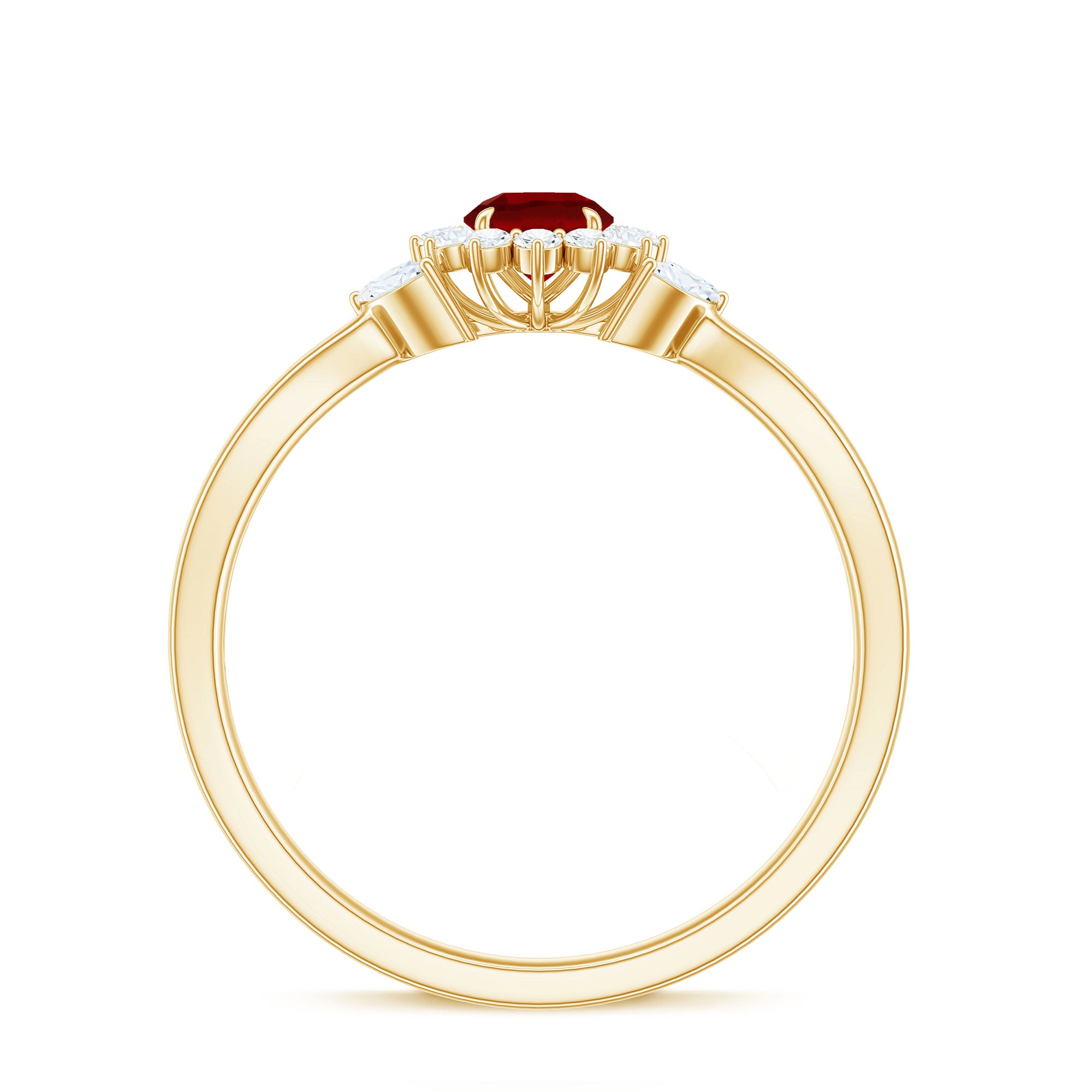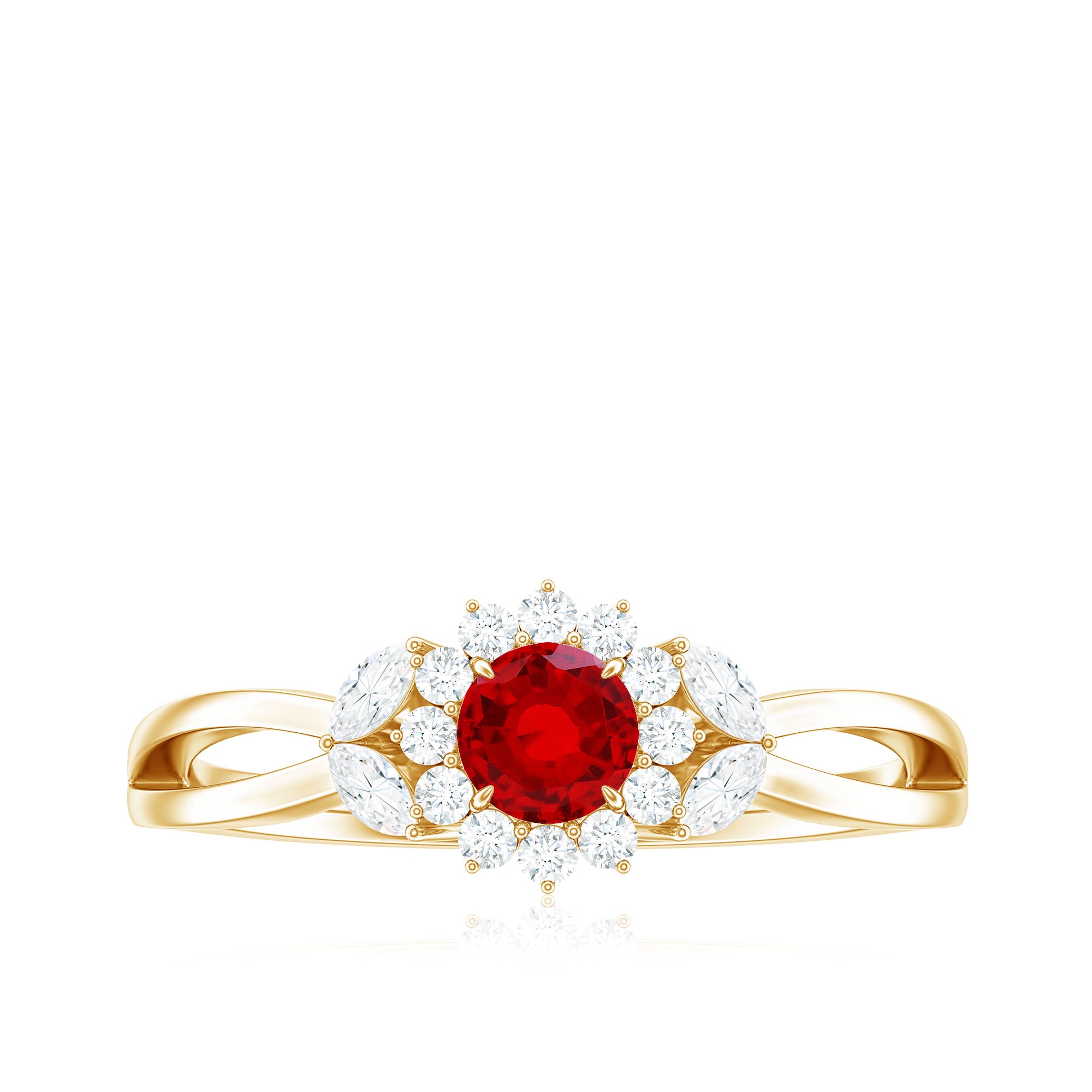 Indulge in the beauty of Lab Ruby Floral Promise Ring which is a testament to your commitment to creating exceptional jewelry for your lady love. Elevate your style and celebrate love and elegance with this Floral Engagement Ring that makes the perfect piece to adorn your finger with timeless beauty and grace. Adorned with 4 mm Round Shaped Lab Ruby in Claw Setting with the Halo of Moissanite. To create a Stunning and eye-catching design this Marquise Moissanite in the form of leaves adds a touch of elegance to this ring. In a simple yet captivating way the Split Shank on the ring adorns your romantic wedding with elegant floral and leaves. Natural themes lend to unique outcomes in jewelry, will make your engagement ring stand out from the crowd.