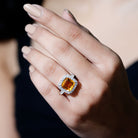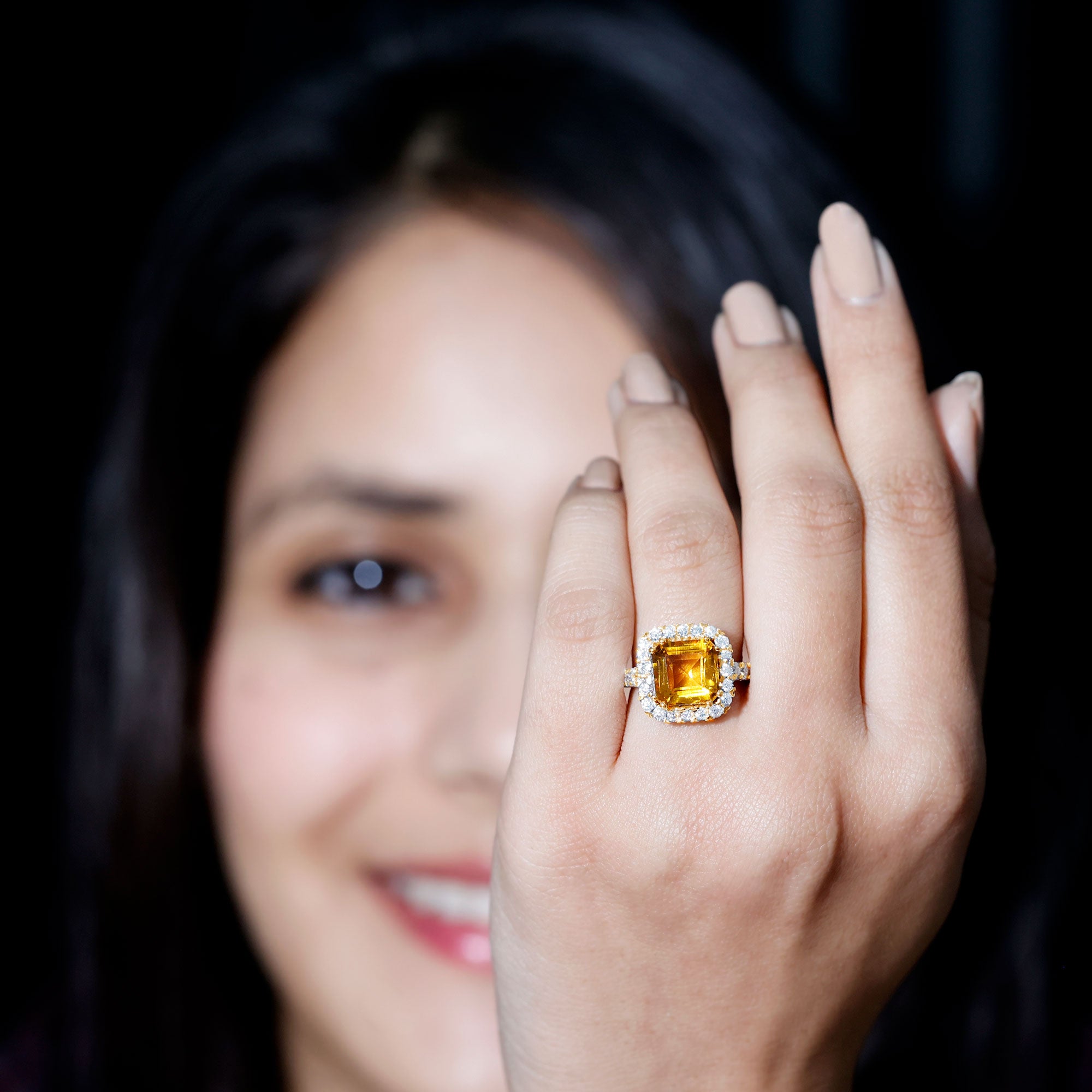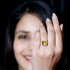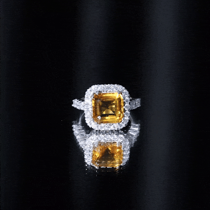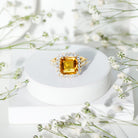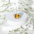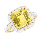 The Engagement Ring is a stunning piece of jewelry that is sure to captivate anyones attention. Featuring an Asscher Cut Lab Created Yellow Sapphire additionally, Round Moissanites studded as Halo and side stones. . This Created Sapphire Ring is not only a perfect choice for an engagement or wedding ring, but it also makes a beautiful anniversary gift.