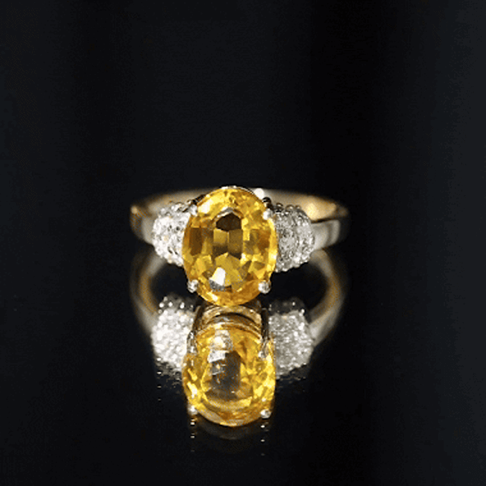 Elevate your style and make a striking impression at your special events with this exquisite Solitaire Engagement Ring. This ring features a captivating Oval Cut Created Yellow Sapphire placed gracefully on its unique shank in a prong setting. The addition of Round Brilliant Diamond stones forming a collar adds an opulent touch to this accessory, making it a must-have addition to your jewelry collection.