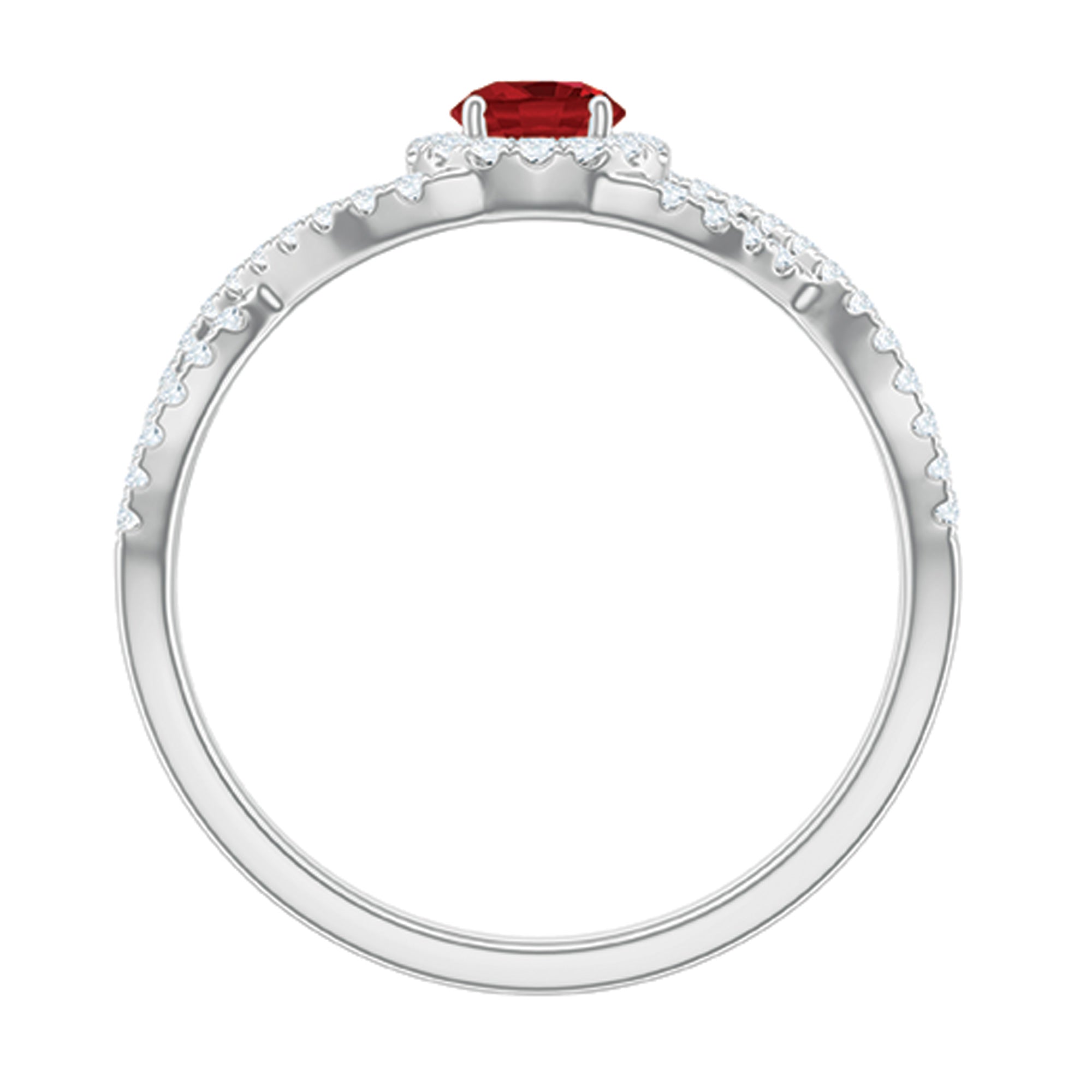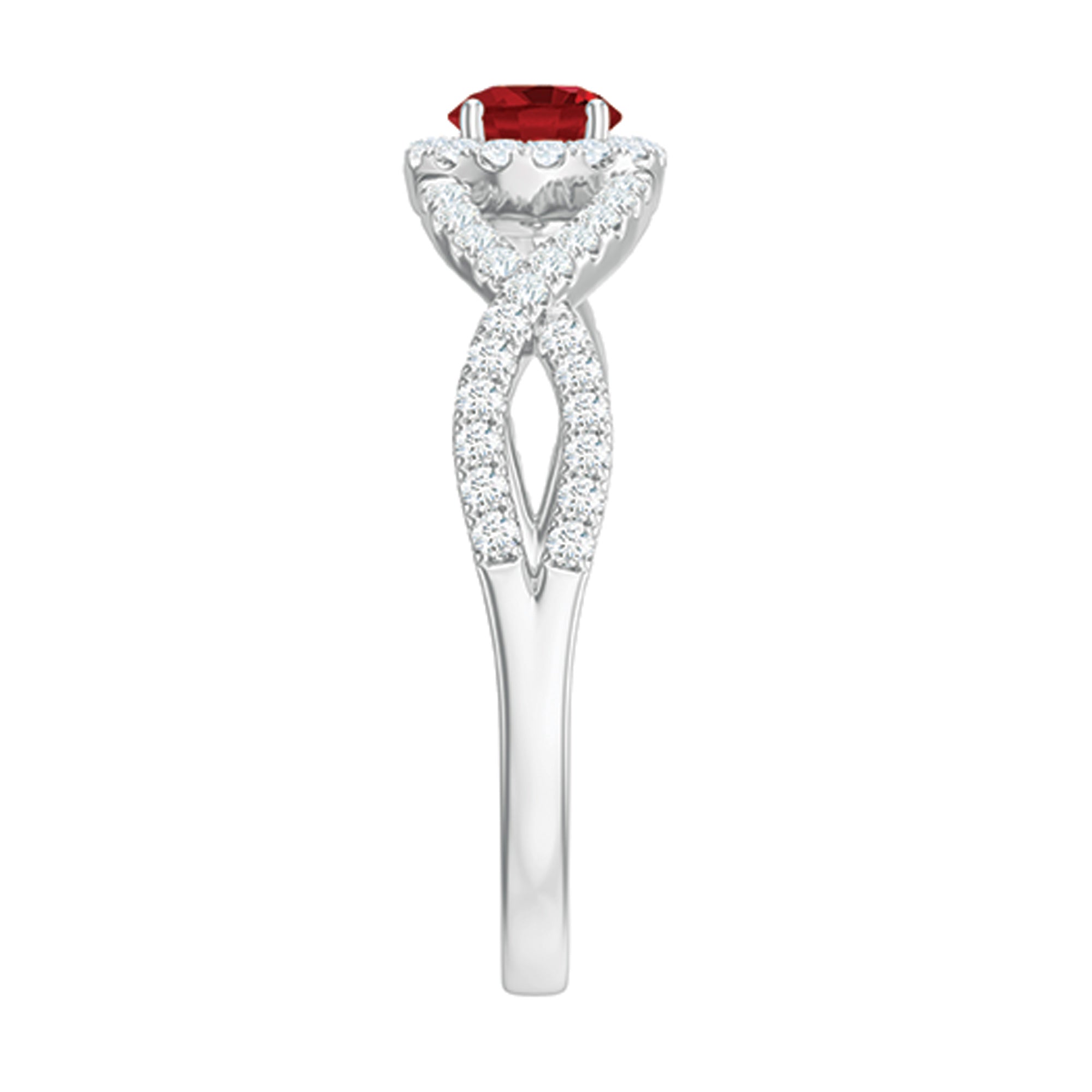 Criss Cross Shank Created Ruby and Diamond Halo Engagement Ring