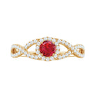 Adorn the finger of your special someone with this beautiful Lab Created Ruby Ring. Featuring a Round Shape ruby in a prong setting and accented with Diamond, this solid gold crisscross ring is a stunning piece of jewelry.