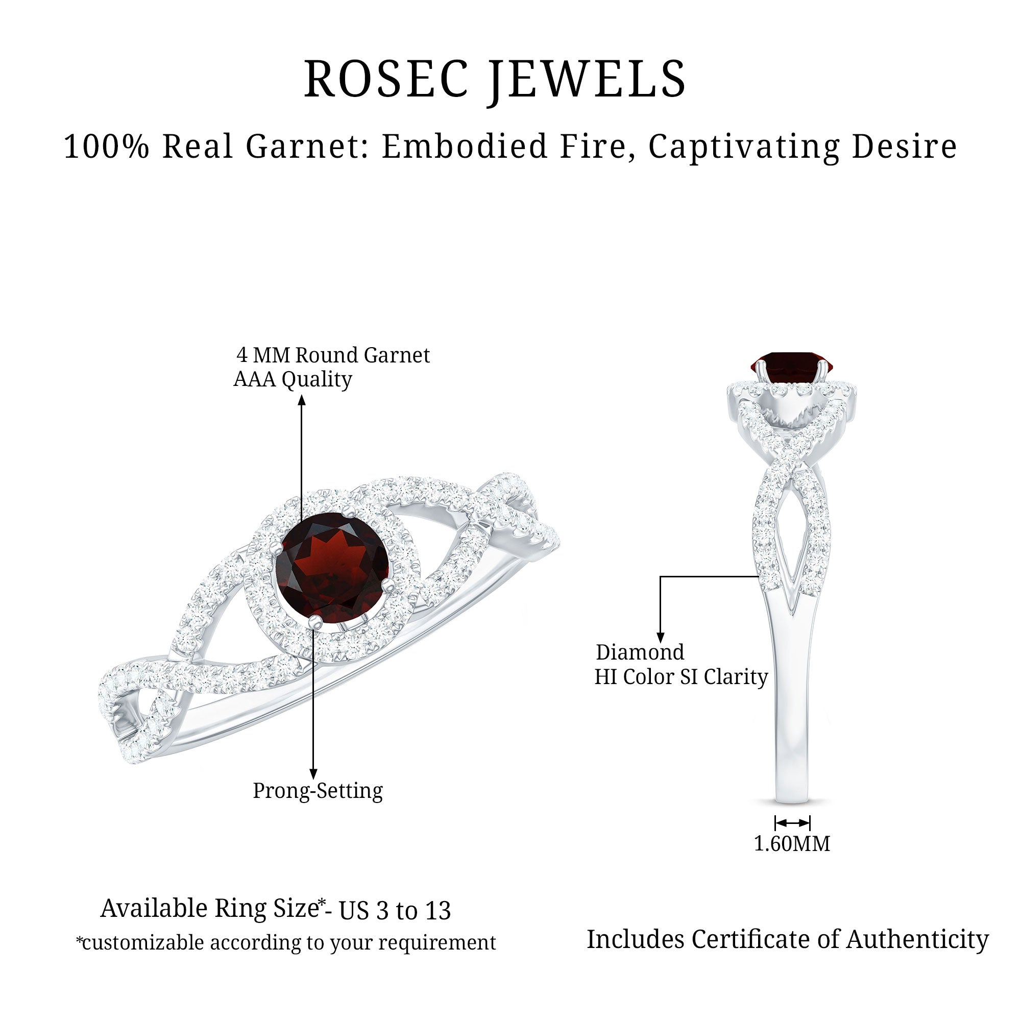 Minimal in design, yet overflowing with romance, this Garnet Engagement Ring is a stunning celebration of love and devotion. At its center is a vibrant 4 mm Round Shape Garnet, radiating deep red hues that symbolize passion, commitment and the intensity of your bond. Surrounding the center stone, a Halo of sparkling Diamond stones adds elegance and brilliance, while the unique Criss Cross Shank, lined with dainty Diamond stones, brings a modern twist to a timeless design. The combination of the classic halo and contemporary band creates a piece that feels both sophisticated and effortlessly stylish, perfect for someone who loves jewelry that tells a story. Available in various ring sizes, this Criss Cross Ring ensures a flawless fit for the one you cherish most. Delivered in a signature jewelry box, this Garnet Diamond Ring is ready to become the centerpiece of a proposal, anniversary or special celebration. Its versatile design pairs beautifully with both daily wear and elegant evening outfits, allowing the wearer to carry a piece of your love everywhere she goes.