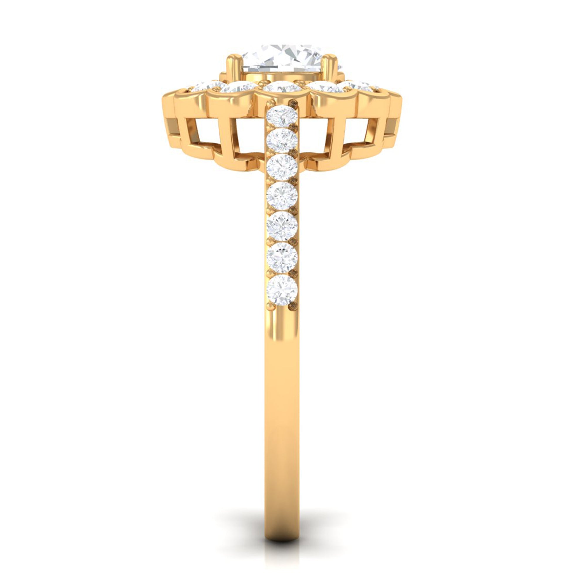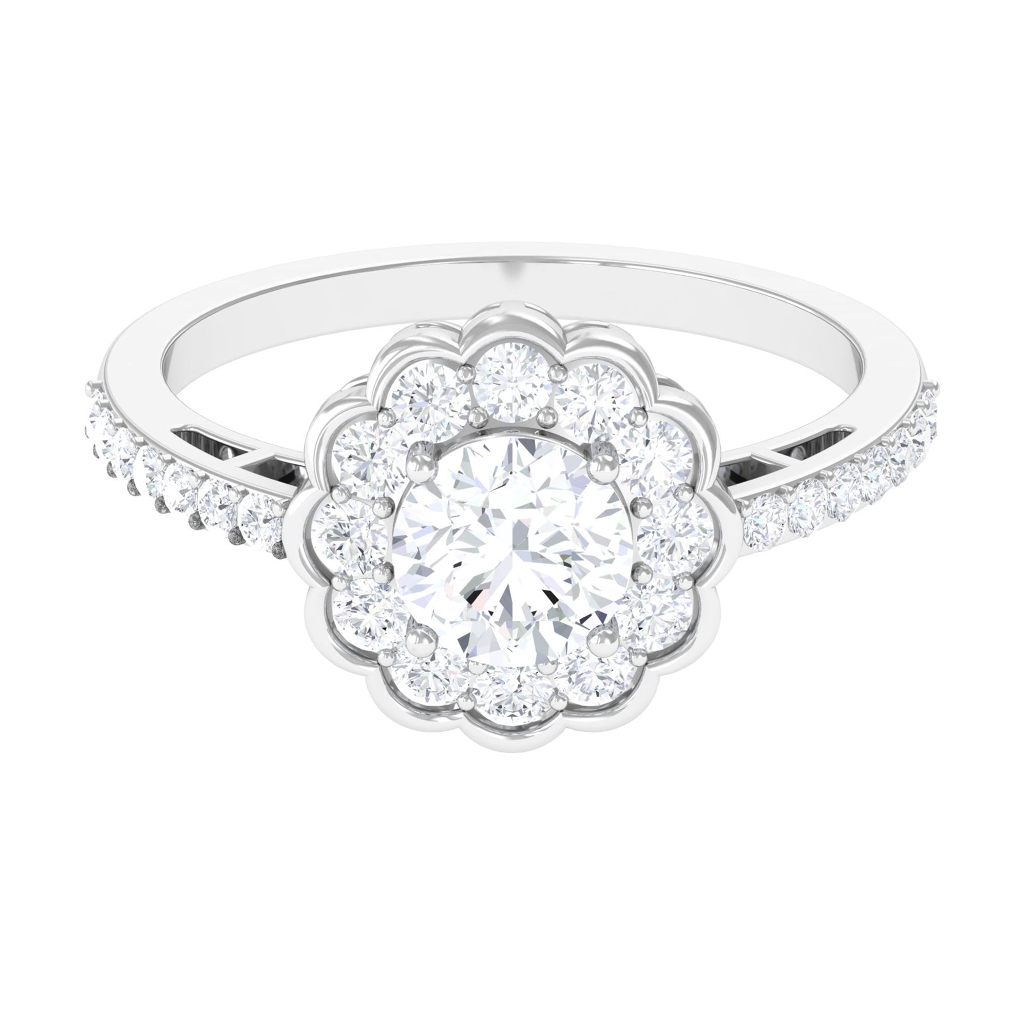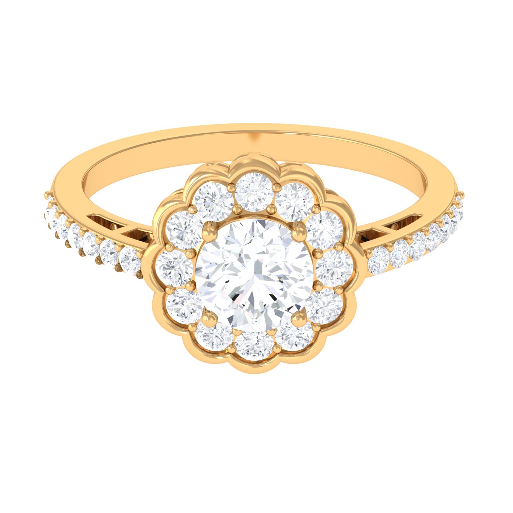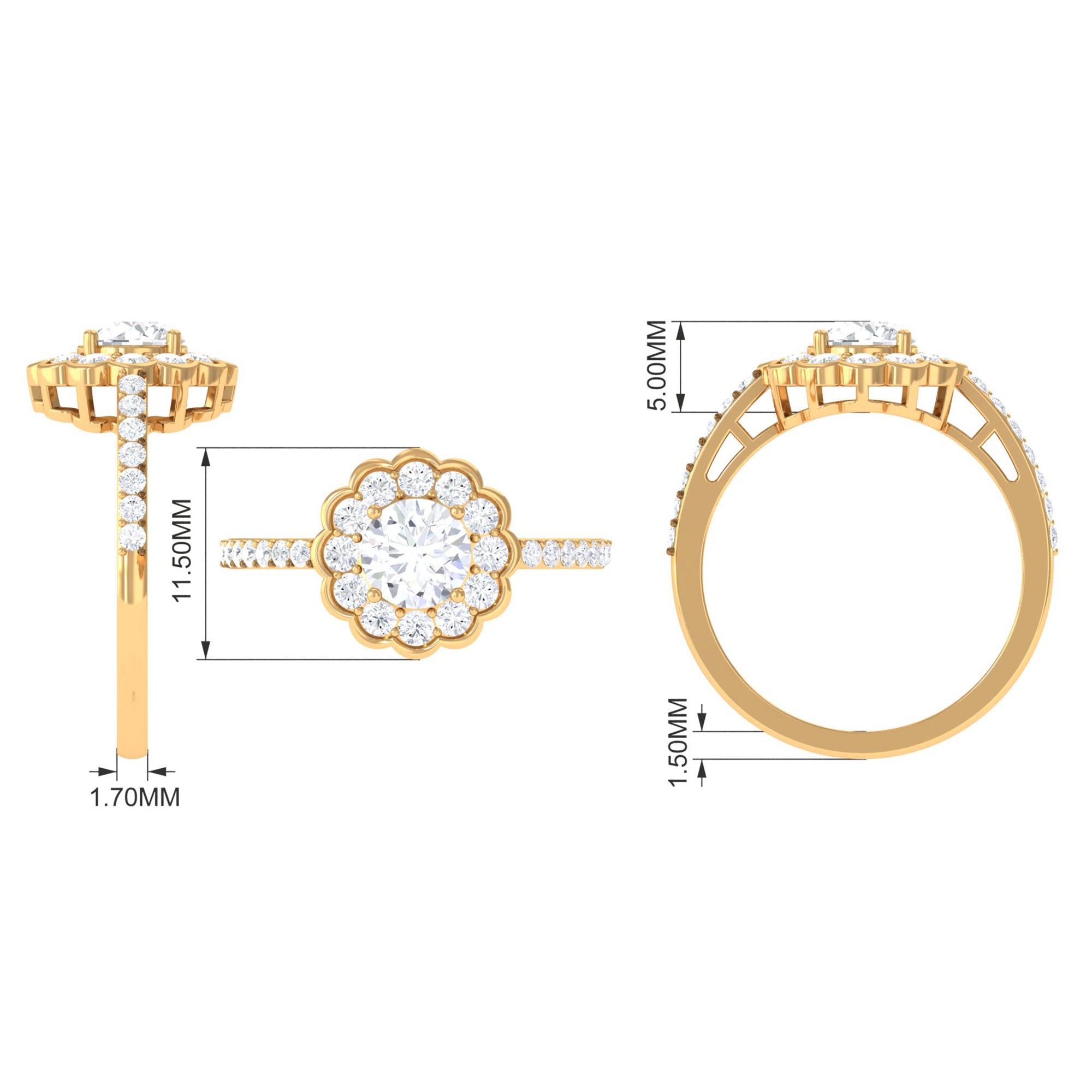 This stylish ring features a flower halo design in center adorn with round cut zircon that extend down the band. Zircon side stones dazzle on the both side of the center stone for an enchanting and unforgettable look. Mark a statement with this lovely Zircon Flower Engagement Ring and make yourself the talk of the town.