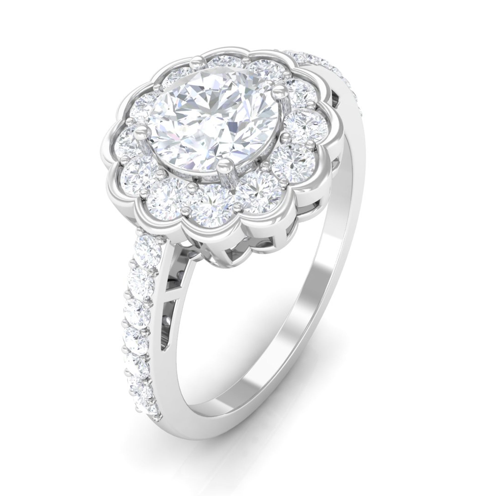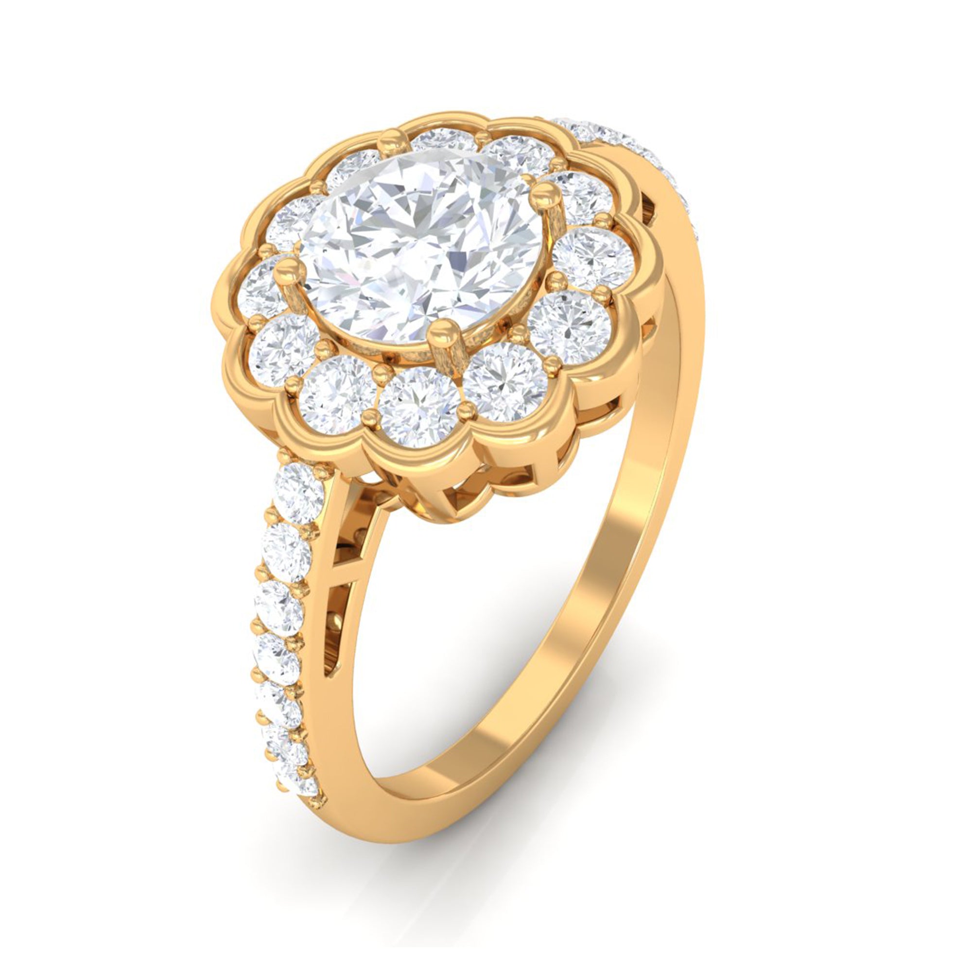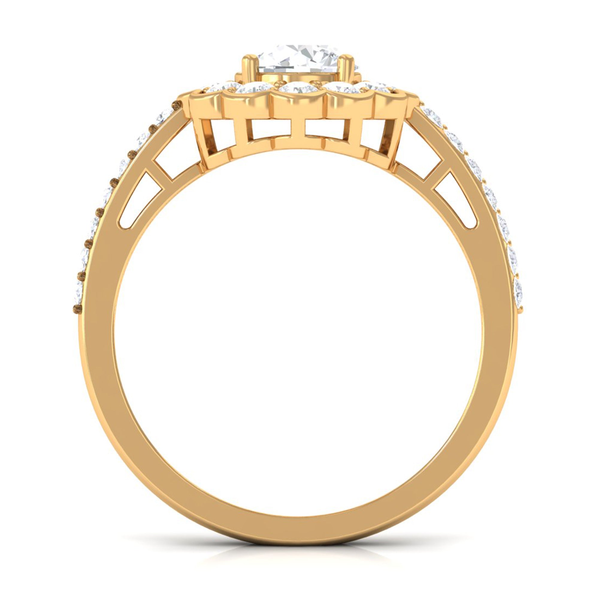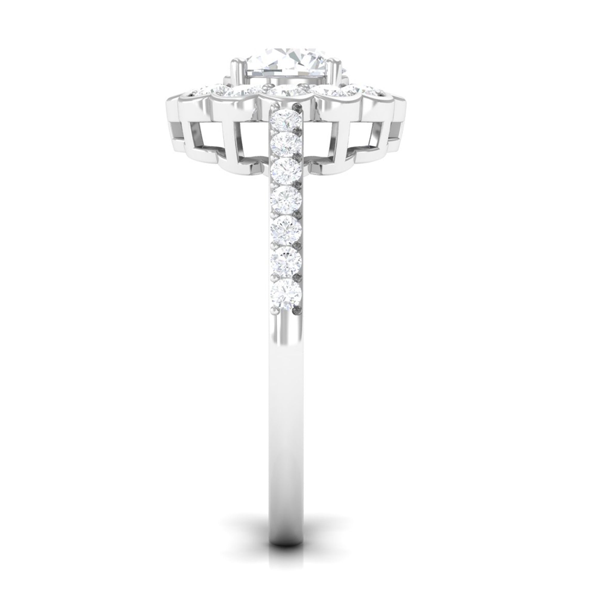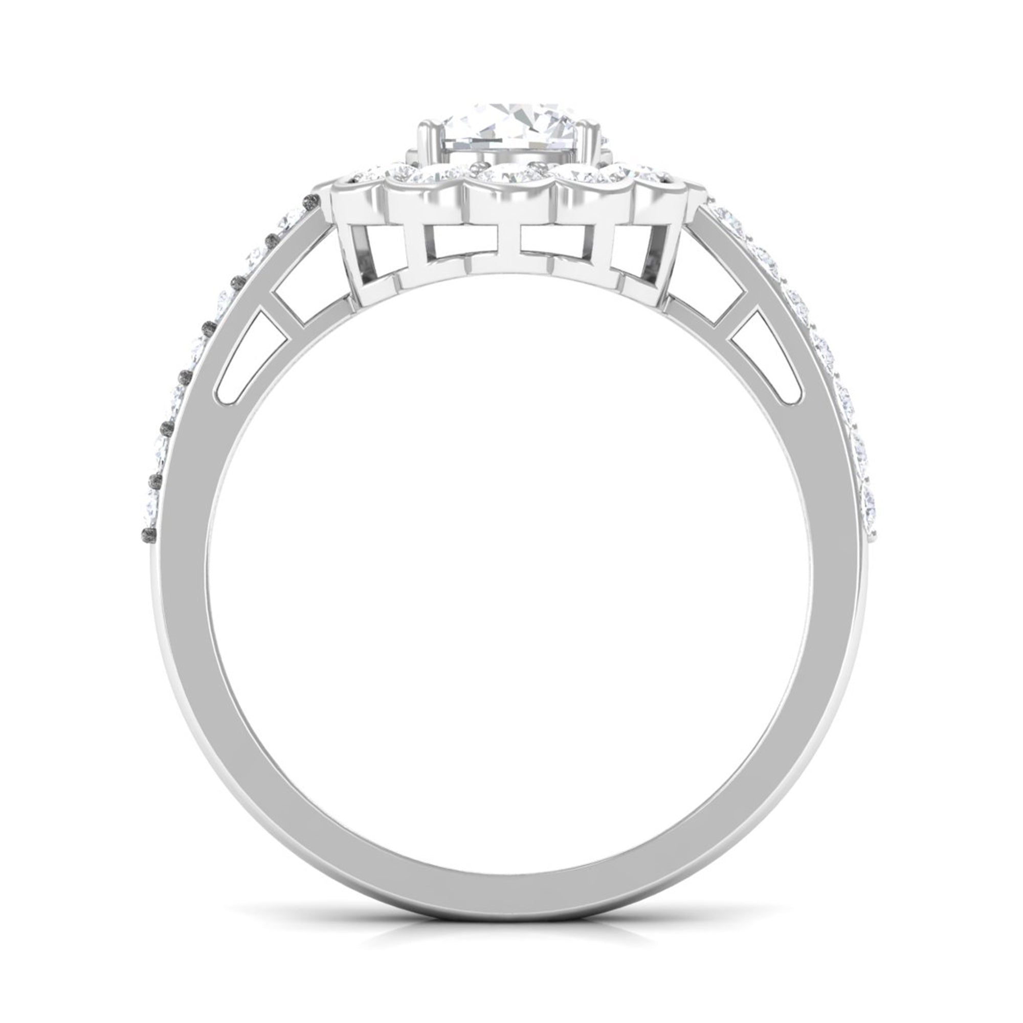 This stylish ring features a flower halo design in center adorn with round cut zircon that extend down the band. Zircon side stones dazzle on the both side of the center stone for an enchanting and unforgettable look. Mark a statement with this lovely Zircon Flower Engagement Ring and make yourself the talk of the town.