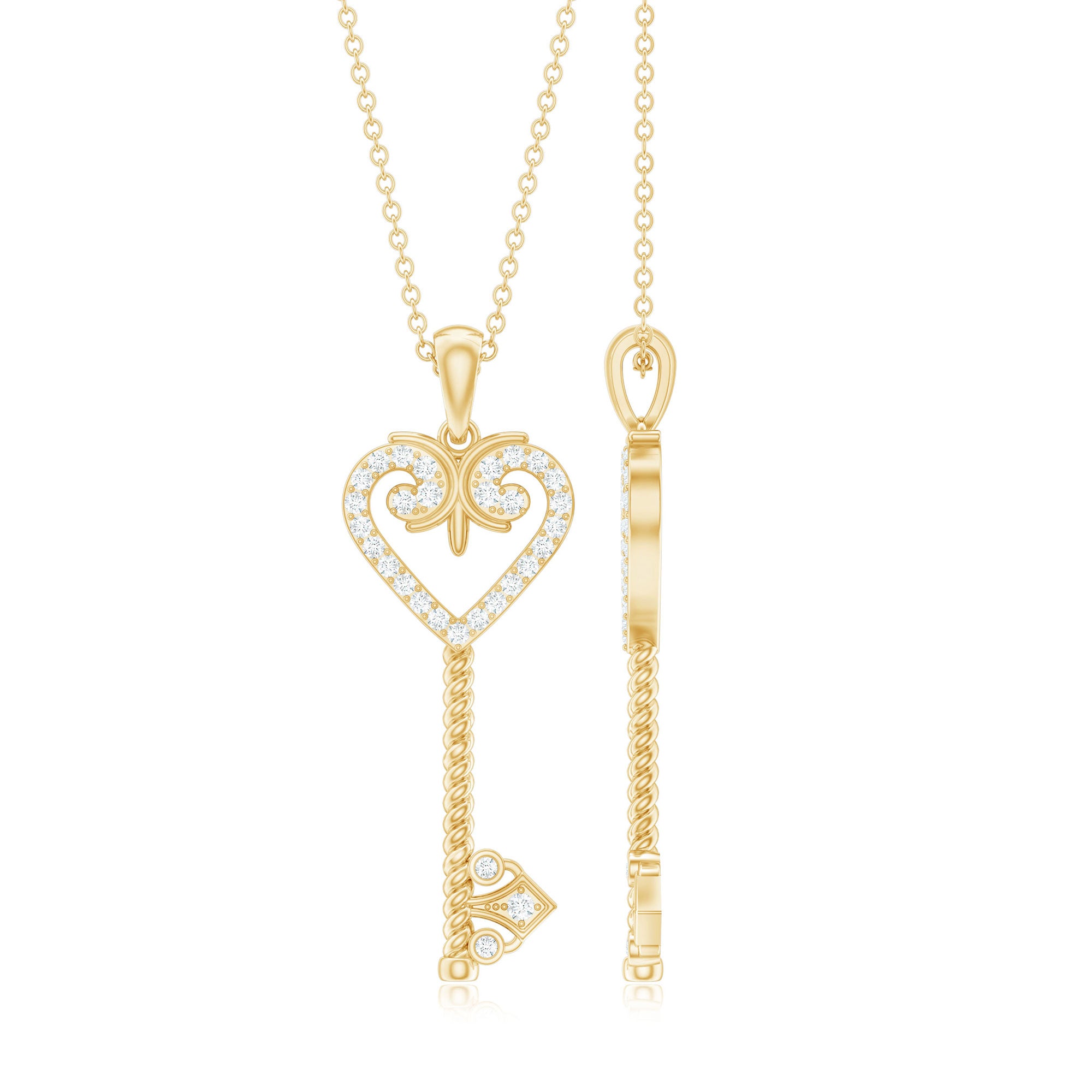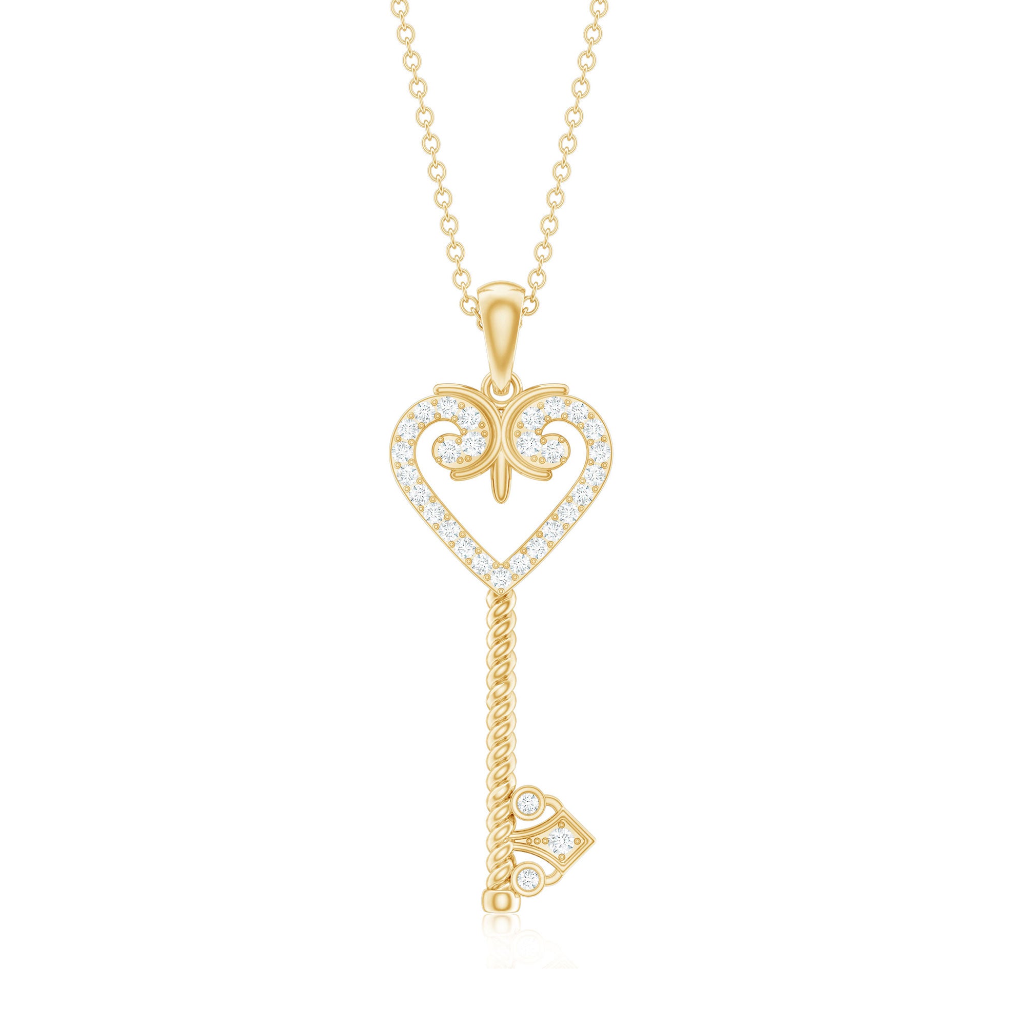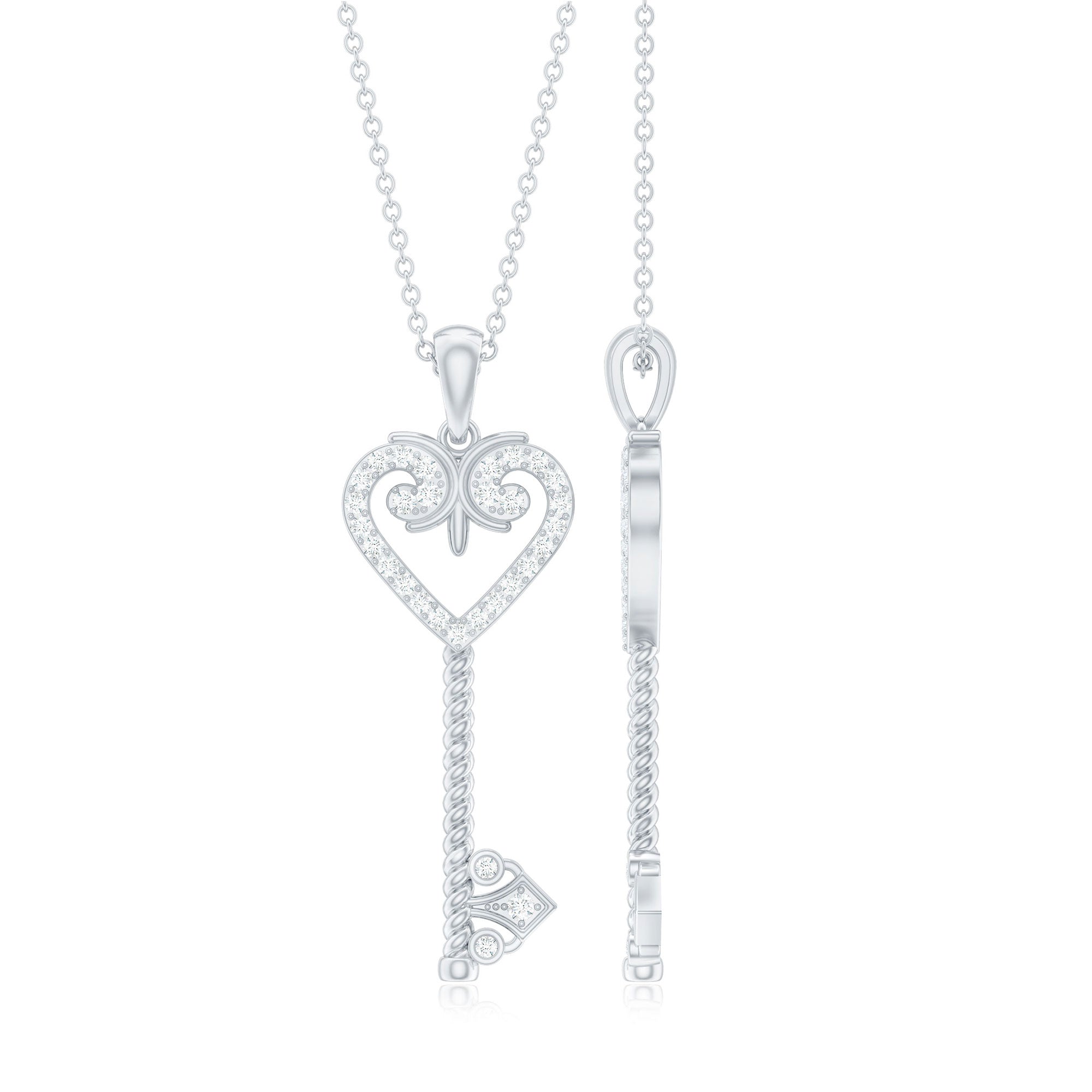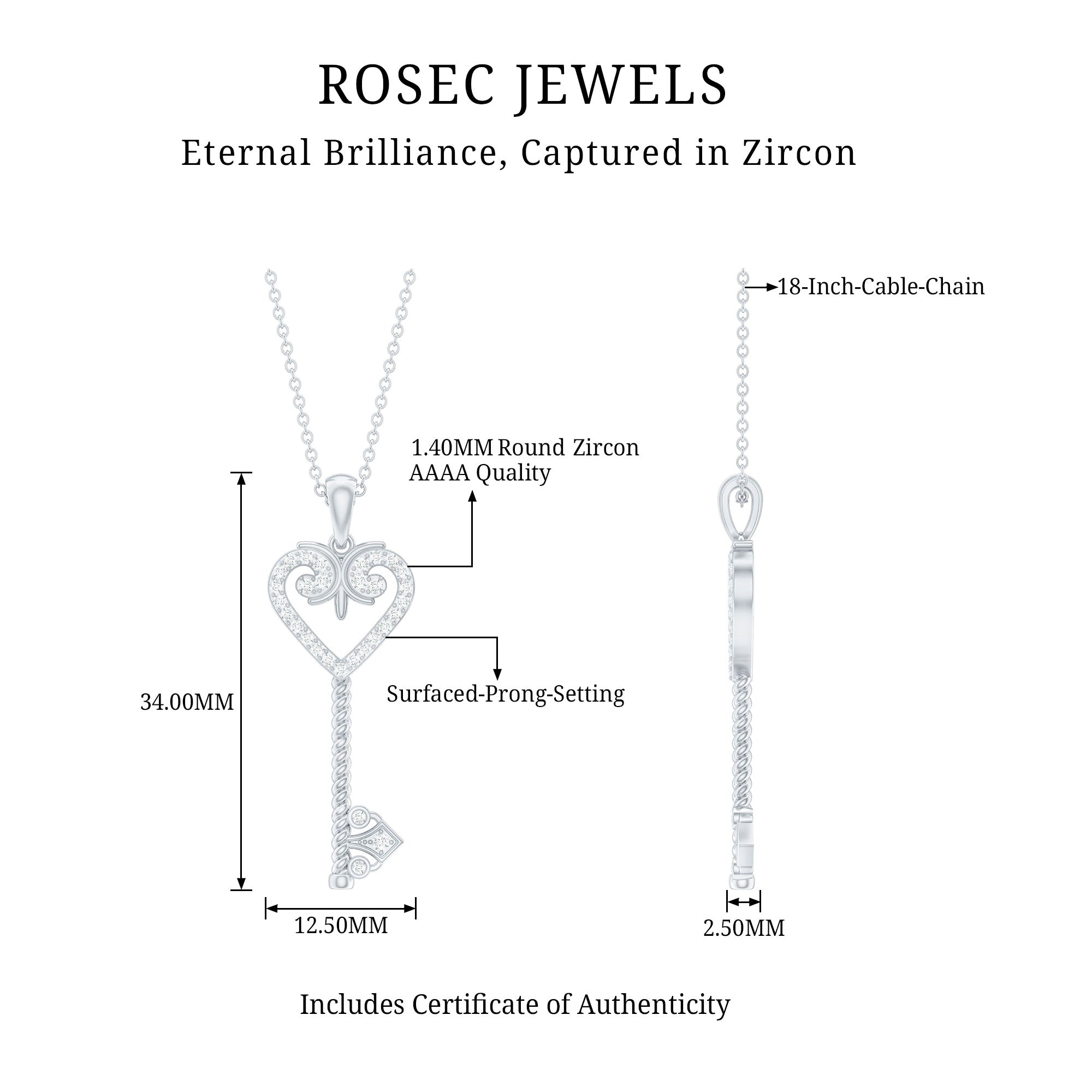 Unlock new beginnings and embrace new adventures with our Zircon Key and Heart Pendant. It features a vintage-style key with heart shape head encrusted with small sparkling zircon stones set in surface prong setting, while the open-heart design provides a romantic and symbolic touch. This Cubic Zirconia Necklace has a unique combination of old-world charm and modern aesthetics making it ideal to be worn on special occasions or daily wear. If you are looking for something unique, timeless, and full of brilliance, this is the perfect Vintage Key Necklace to celebrate your love.