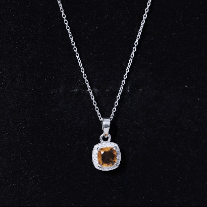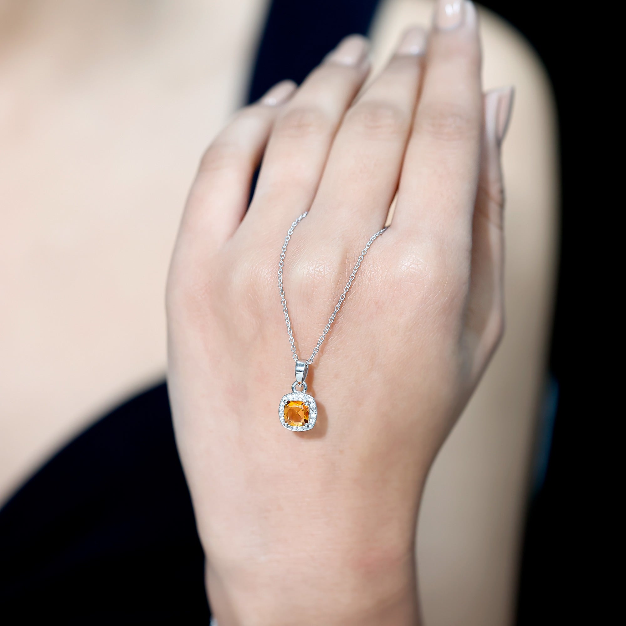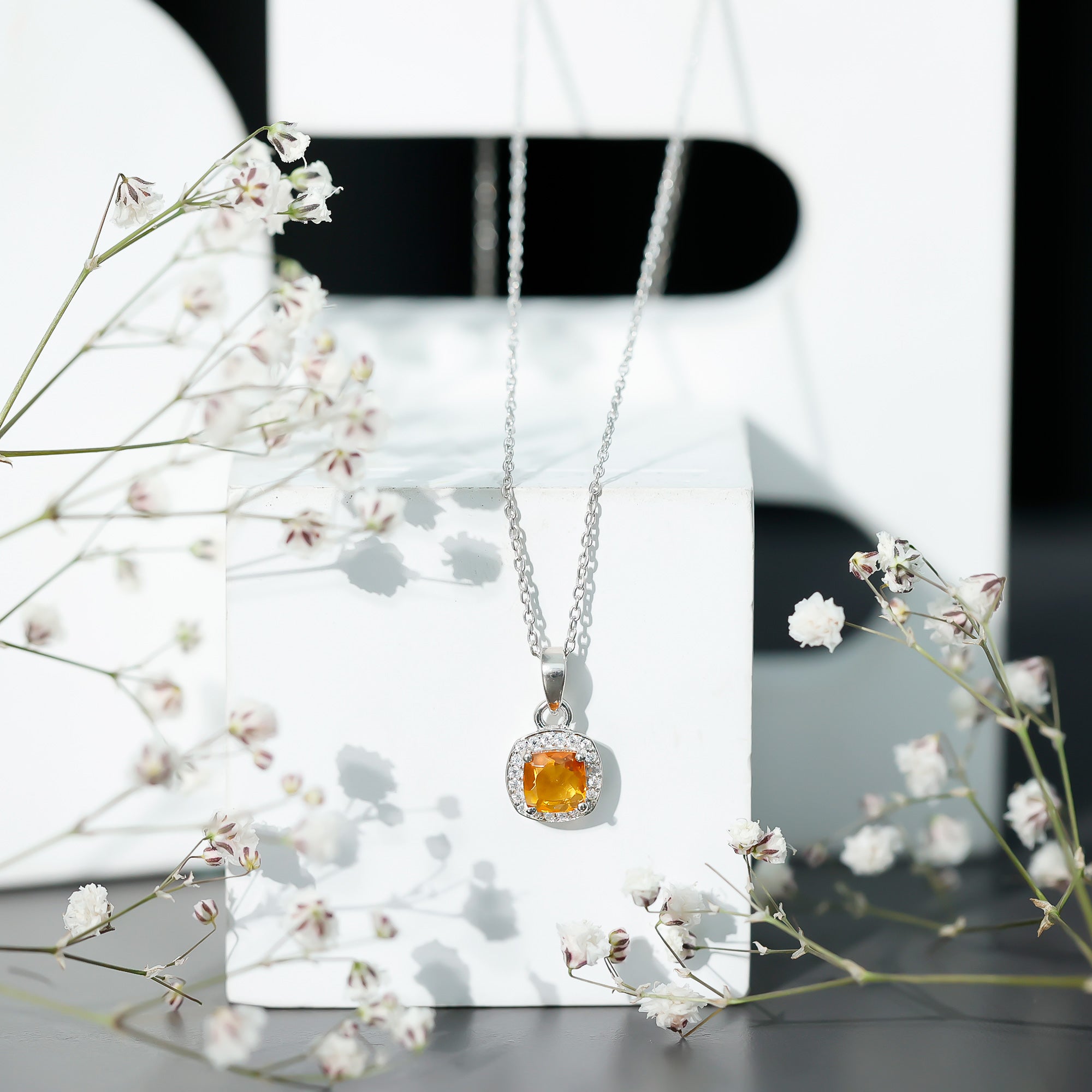 Add a vibrant hue to your outfit with this Citrine Pendant Necklace that exudes a bright hue, which makes you the center of attraction. The classic pendant features a 6 MM Cushion Cut Citrine of AAA Quality encircled by Halo of smaller round shape Moissanites. The pendant with standard bail dangles in a sturdy cable chain, which can be adjusted as per the choice of style. This November Birthstone Pendant can be a thoughtful gift for Scorpions and Sagittarians. This Real Citrine Pendant can be presented as a symbol of joy and personal power. The pendant will be delivered to you in a premium packaging.