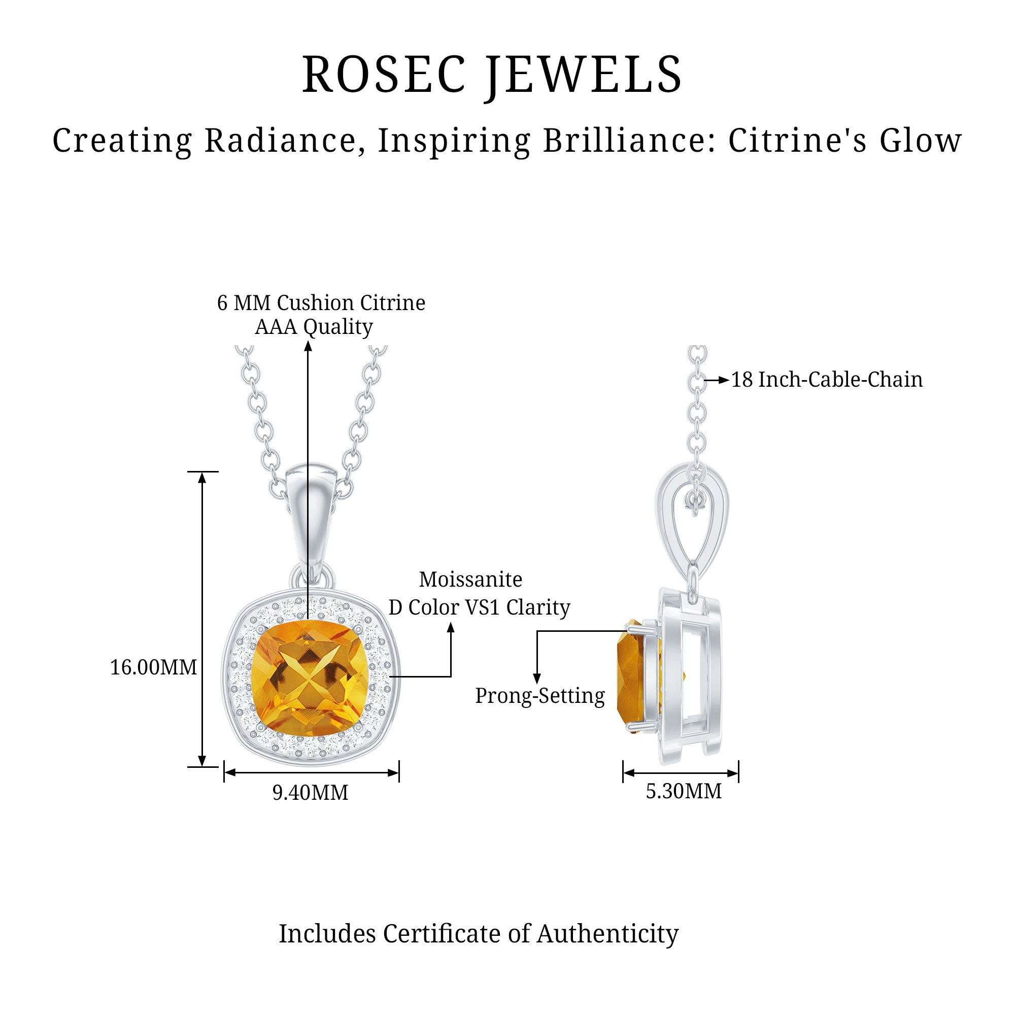 Cushion Cut 6 MM Citrine Moissanite Halo Pendant Necklace