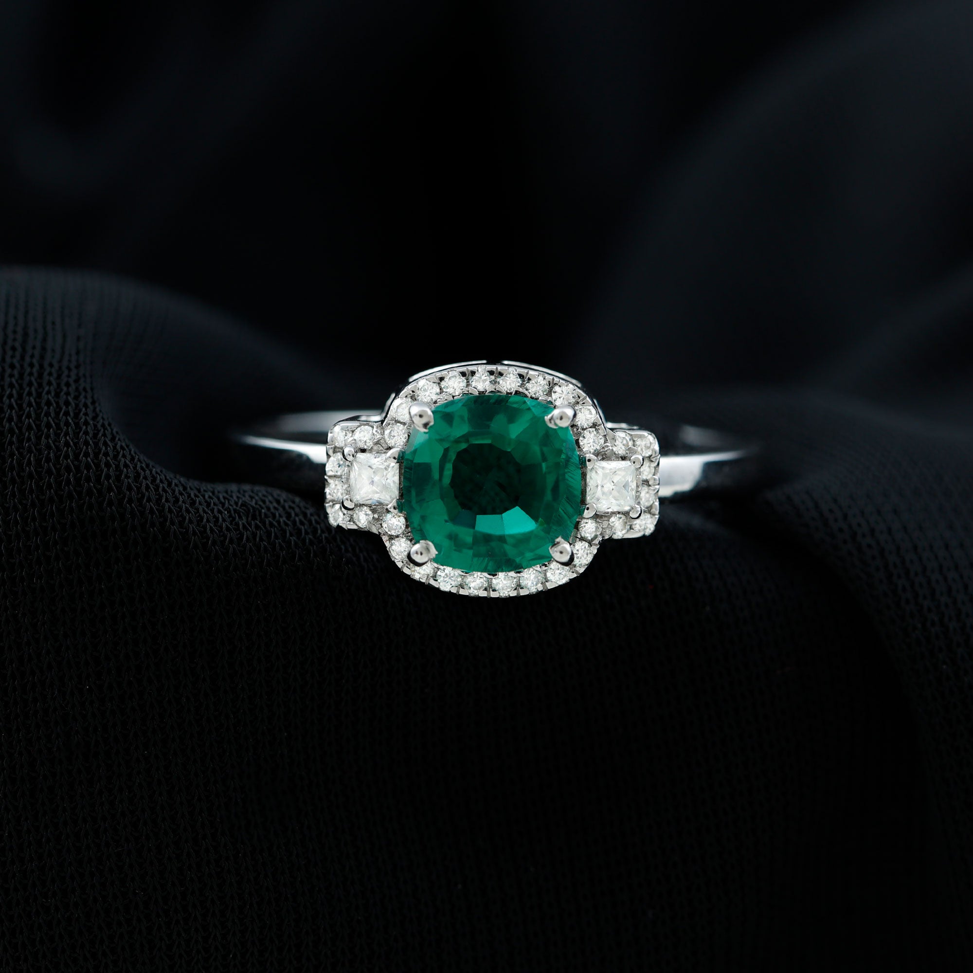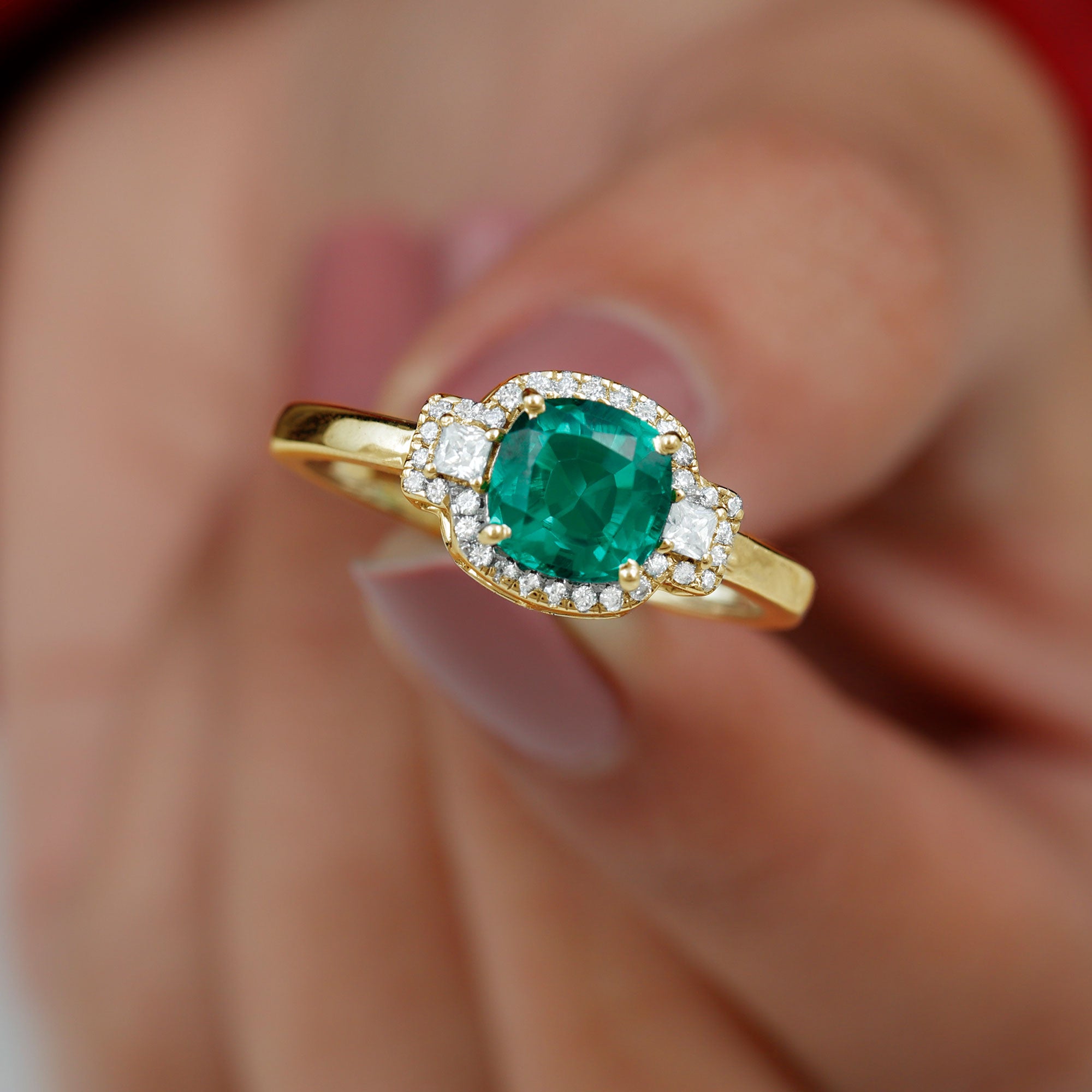 Celebrate your love with this beautiful Cushion Cut Engagement Ring, that is designed to stand out with elegant simplicity. This stunning Statement Ring is beautified with an 8 mm Cushion Cut Lab Created Emerald, known for its rich green color and timeless charm. Surrounding the AAAA Quality Lab Grown Emerald are sparkling Round and Princess Cut Diamond stones, carefully placed to add extra shine and brilliance from every angle. The stunning contrast of color and sparkle makes this Lab Emerald Diamond Engagement Ring perfect for someone who appreciates style with meaning. This Lab Emerald Engagement Ring is ideal for marking special moments, like a proposal or a wedding anniversary. The design is bold enough to make a lasting impression that makes this Cushion Cut Emerald Ring a versatile piece in any jewelry collection. Beautifully presented in a signature jewelry box, this mesmerizing Lab Grown Emerald Ring is the perfect way to say forever in a meaningful and beautiful way.