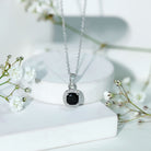 Looking for something to add a bold touch to your outfit with this Black Onyx Pendant Necklace, crafted with 14K White Gold Plated Silver. The pendant features an 8 MM Cushion Cut Black Onyx securely placed in Prong Setting, encircled with a Halo of Moissanite. This Square Pendant beholds the classic shine of AAA Quality Black Onyx and is accentuated with a standard bail. The pendant can be presented to your beloved on a special day, such as a birthday or anniversary. This December Birthstone Pendant dangles with a silver cable chain and will be delivered to you in a velvet pouch.