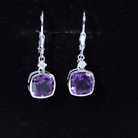Indulge in the allure of these captivating Drop Earrings. Adorned with Cushion Cut Amethyst gems securely nestled in Bezel Settings, and Round Shape Diamond gems in Prong Settings, these Amethyst Earrings are available in various metal options. The Lever Back Closure ensures they stay in place, providing both style and security.