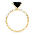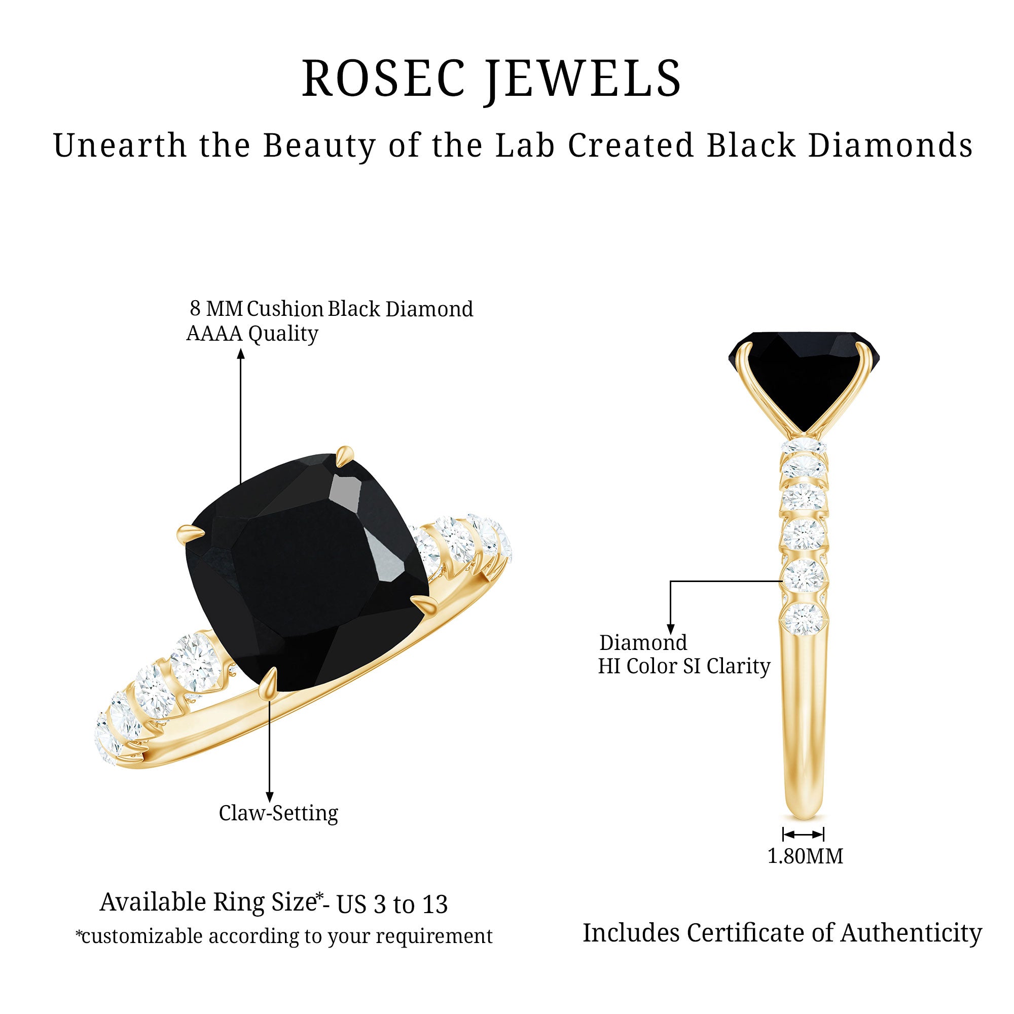 Gracefully embellished in shimmering Metal, this mesmerizing Ring features a stunning Cushion Cut Created Black Diamond at its heart, exuding elegance from a delicate Claw Setting. To further enhance its beauty, Round Brilliant Diamond stones adorn the sides, skillfully arranged in a classic design, adding a touch of sophistication to the overall design. This exquisite piece is sure to captivate hearts with its enchanting allure.