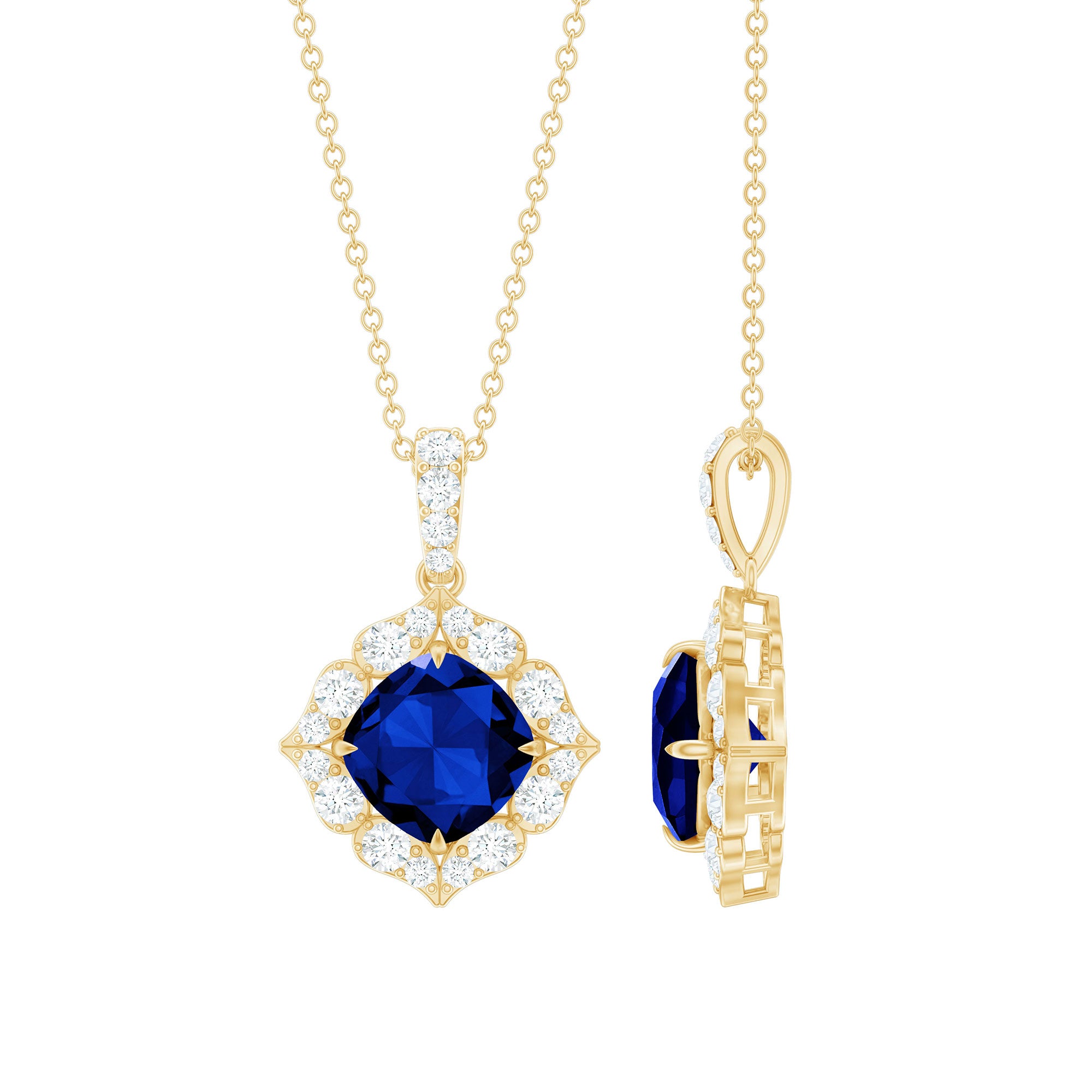 Encased within a sparkly Diamond halo is a created cushion cut created blue sapphire, held in place with 4-claw setting in this vintage-inspired necklace pendant. It resembles a full-blooming flower with all its shimmer and shine. Connected to a shimmery bail that is adorned with Diamond for an extra dose of sparkle, the pendant necklace is something blue that adds a splash of color to your look.