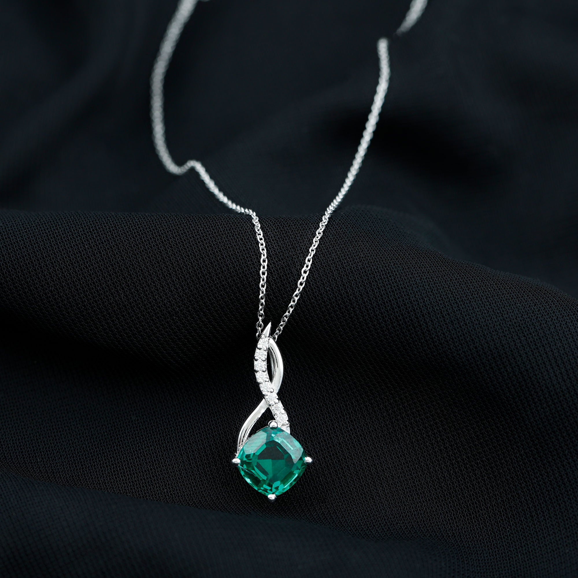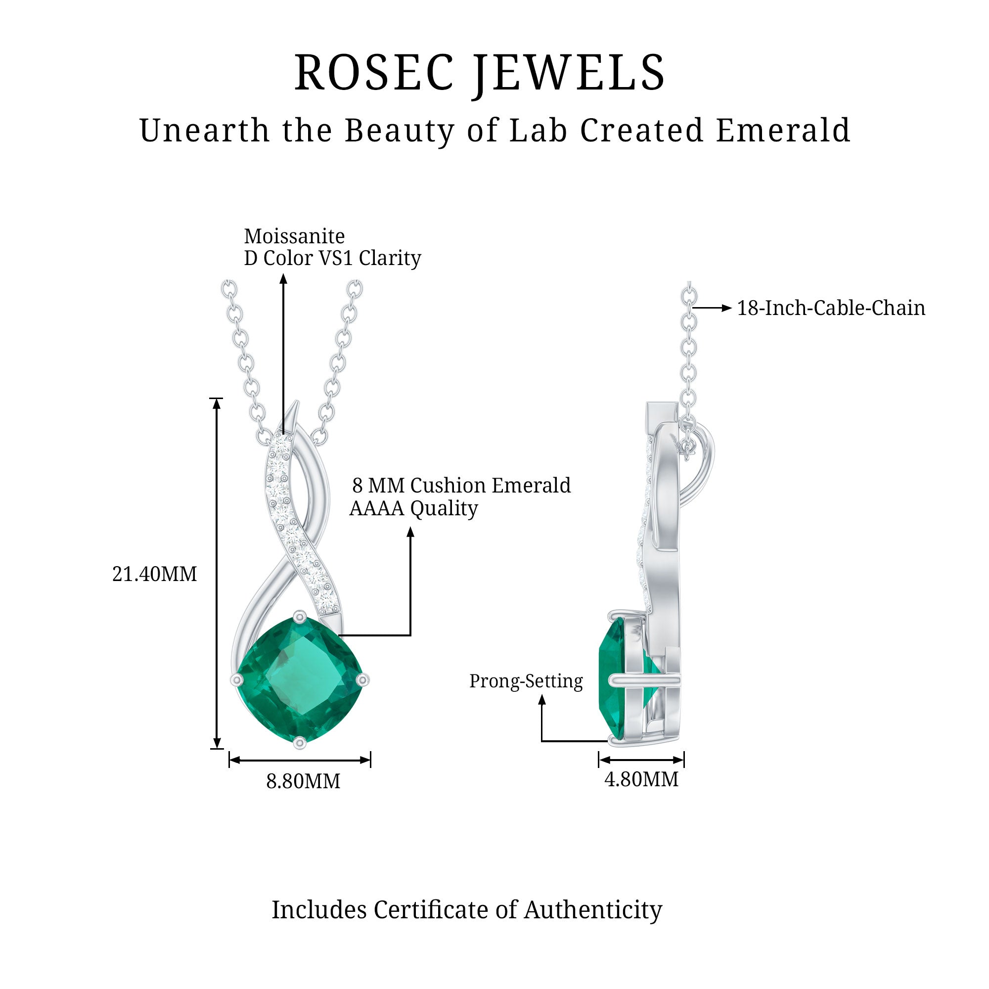 Create a memorable moment with a lovely Infinity Pendant Necklace designed to touch the heart of any woman. Crafted with high-quality metal, the Solitaire Pendant highlights an 8 MM cushion cut lab created emerald held securely in prong setting. Graceful infinity symbolizing endless connection and lasting devotion. Round brilliant cut moissanites sparkle along the infinity shape, adding bright flashes of light that enhance the pendant’s beauty. Every detail is made to offer both elegance and simplicity, creating a piece that feels special yet easy to wear. Hanging from a smooth chain with a hidden bail, the Emerald and Moissanite Necklace rests gently at the neckline. The hidden bail design keeps the look seamless, allowing full attention to stay on the emerald and the sparkling infinity symbol. Its comfortable fit and timeless style make it ideal for daily wear or meaningful occasions. Given as a gift to someone special or chosen as a personal keepsake, the Cushion Cut Emerald Necklace brings joy, beauty, and a touch of romance.