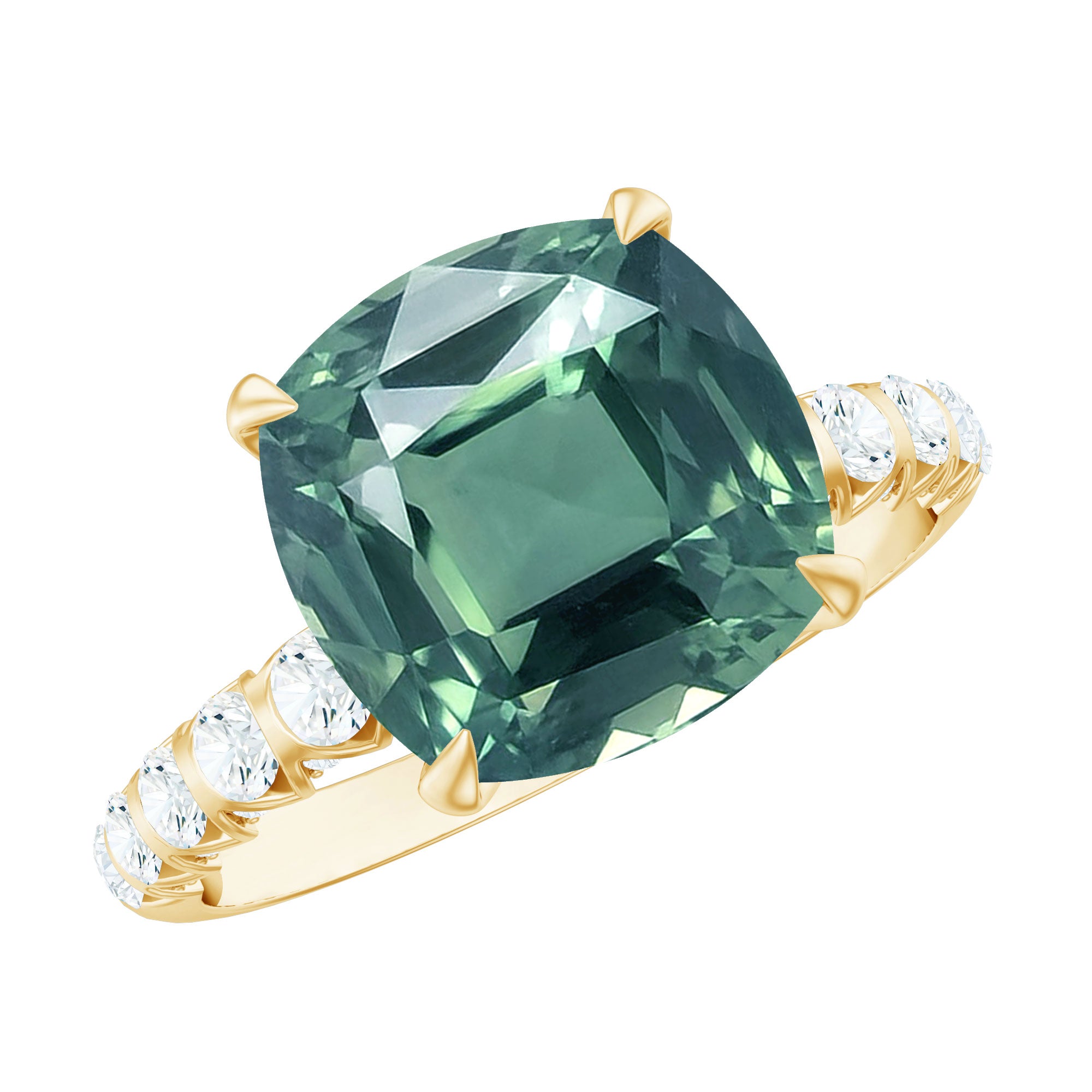 This Engagement Ring showcases a Cushion Cut Lab Created Green Sapphire while Round Shape Moissanite studded as side stones make for a charming piece to style with all your casual and special attires. Treat your special person with this lovely Created Green Sapphire Ring. Your beloved will be flabbergasted when you get her this Cushion Cut Ring as an anniversary gift.