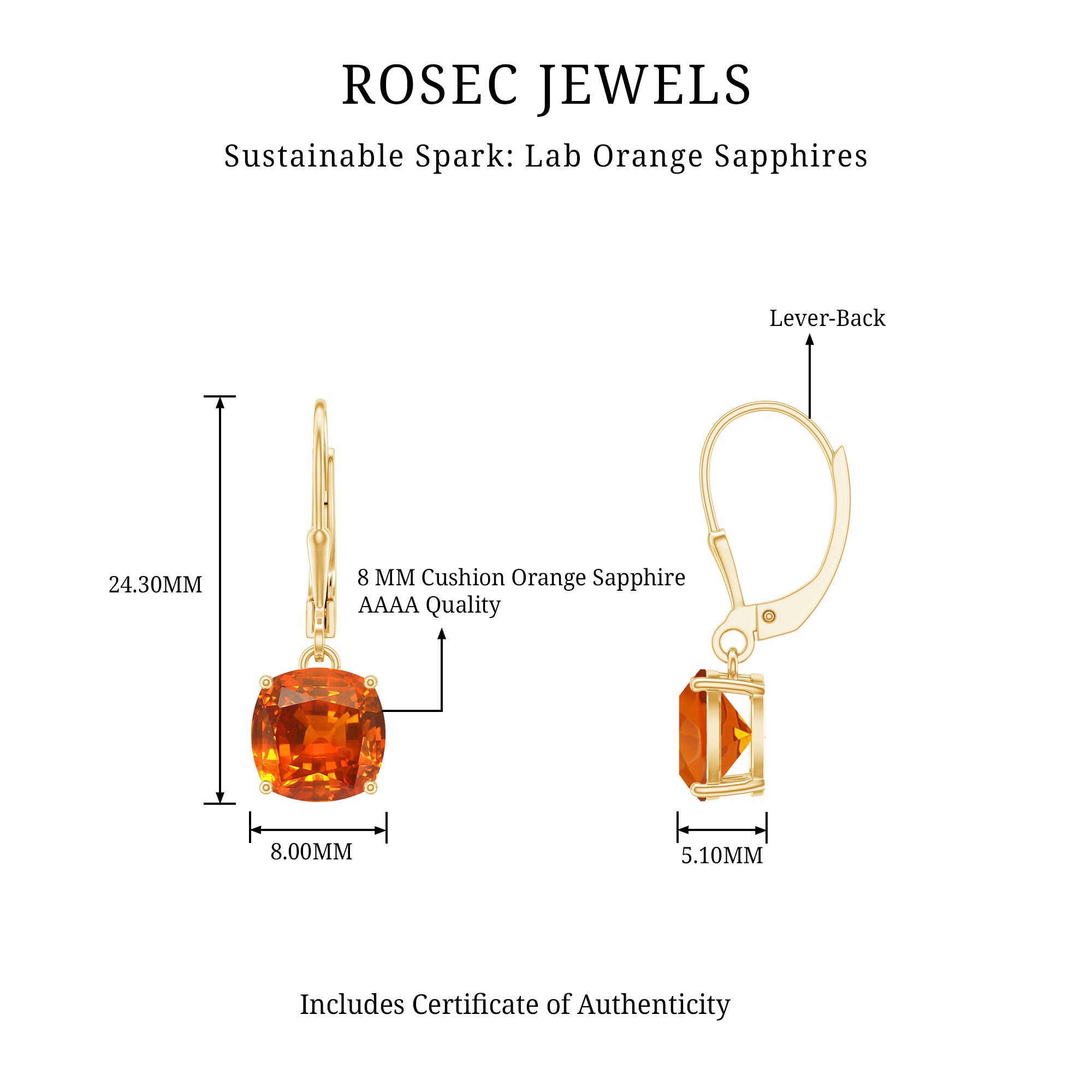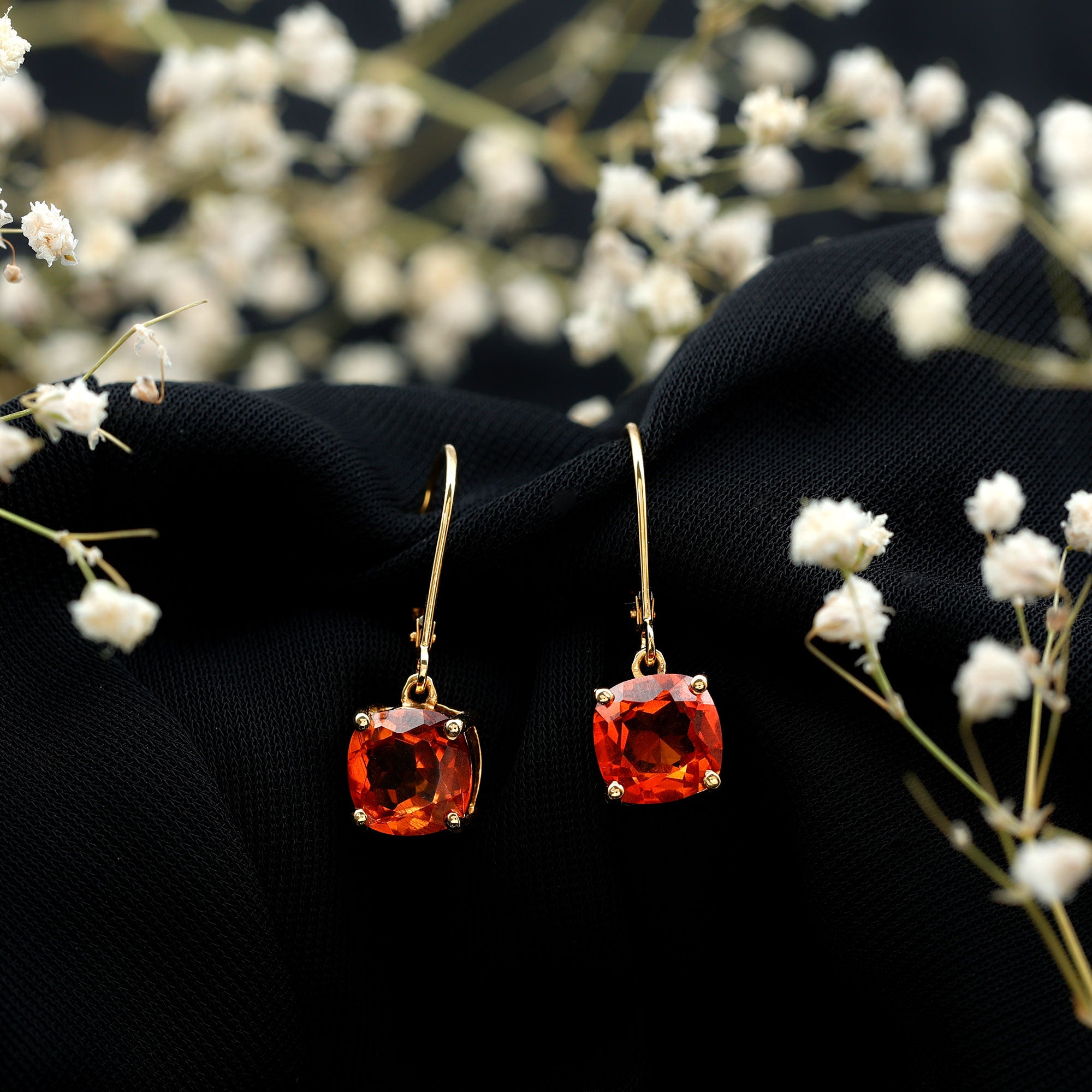 Enhance your style with stunning Drop Earrings featuring cushion-cut created orange sapphire and lever back for a perfect combination. Effortlessly infuse glamour into any outfit, making a vibrant statement that turns heads and garners compliments.