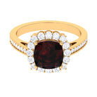 Indulge in the luxurious beauty of this Halo Engagement Ring, showcasing an 8 MM cushion-cut garnet stone in a secure 4-prong setting, mounted in gold. The ring shank is adorned with sparkling Diamond stones, adding a touch of glamour and sophistication. With its exceptional design and high-quality materials, this ring is the perfect symbol of love and commitment.