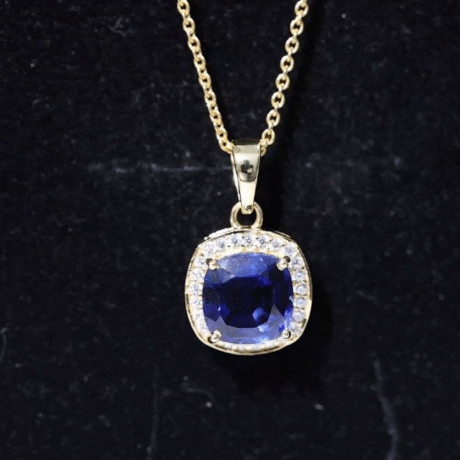 The epitome of timeless sophistication, flaunt this stunning Lab Created Blue Sapphire Pendant showcasing exquisite detailing. The pendant features an 8 MM Cushion Cut Lab Created Blue Sapphire securely placed set in 4 Prong Setting encircled by round moissanite that adds an extra touch of sparkle. This Halo Pendant exudes the classic shine of AAAA quality Blue Sapphire making it perfect to compliment looks for the special day. Whether dressing up for a party or heading for a lunch date, wear this Statement Pendant Necklace and add a modern touch to your favorite look.