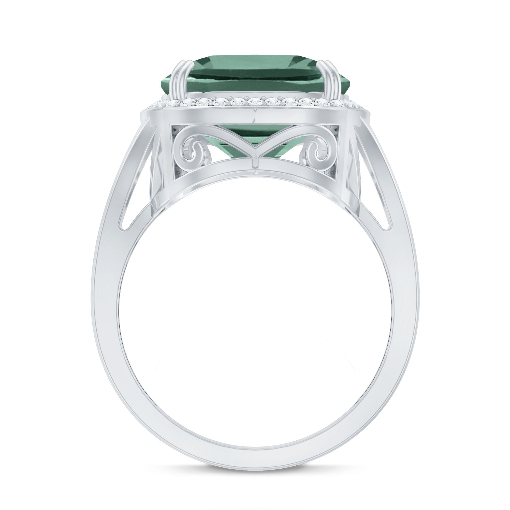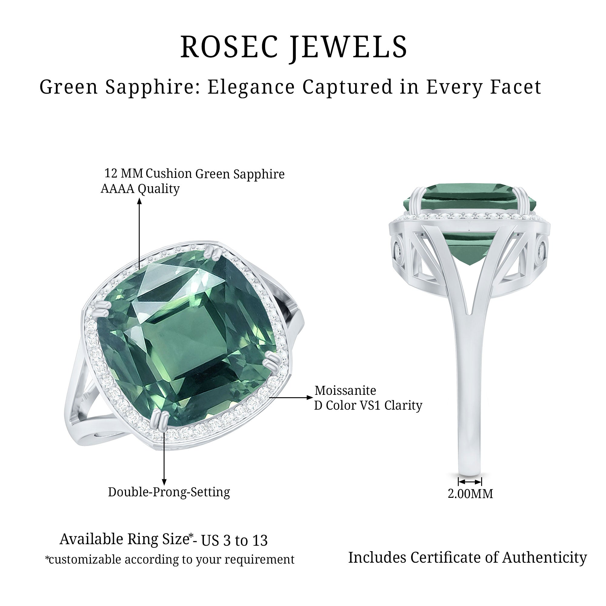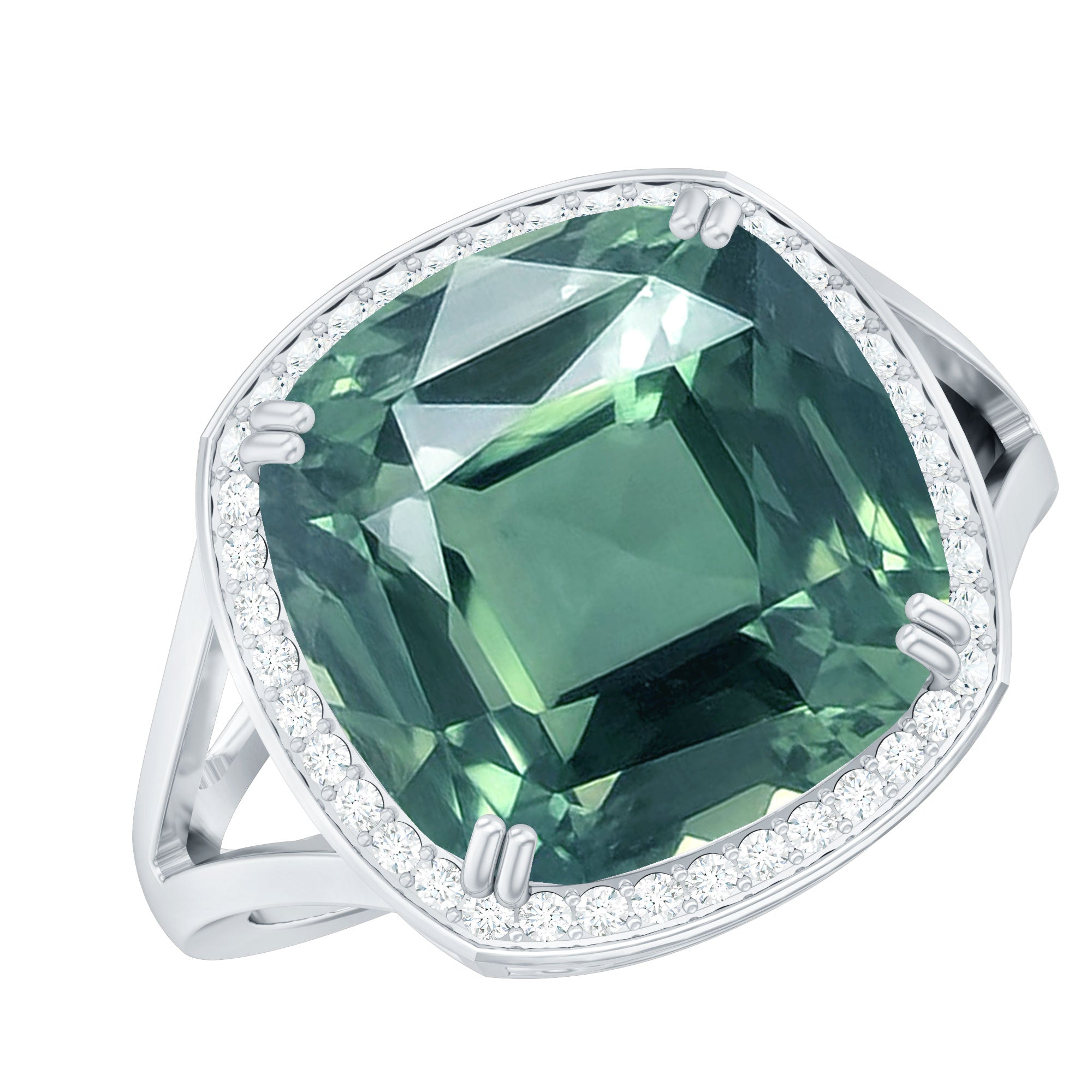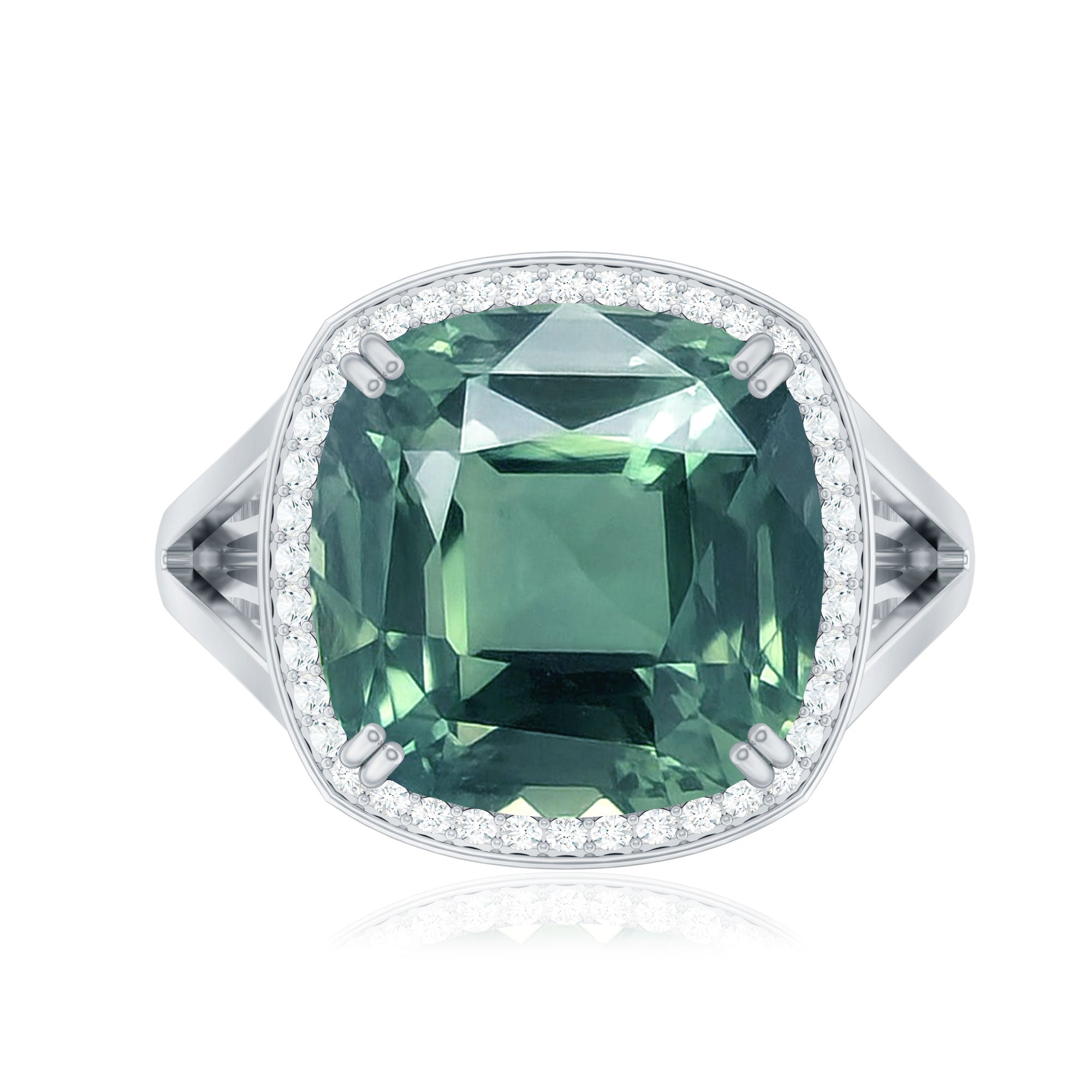 An enchanting Engagement Ring showcasing a perfect Cushion Cut Lab Grown Green Sapphire secured by Double Prong Setting more, Round Moissanite studded as Halo. Why settle for anything less than the gorgeous beauty your partner deserves? Grab this Lab Grown Sapphire Ring for your special one.