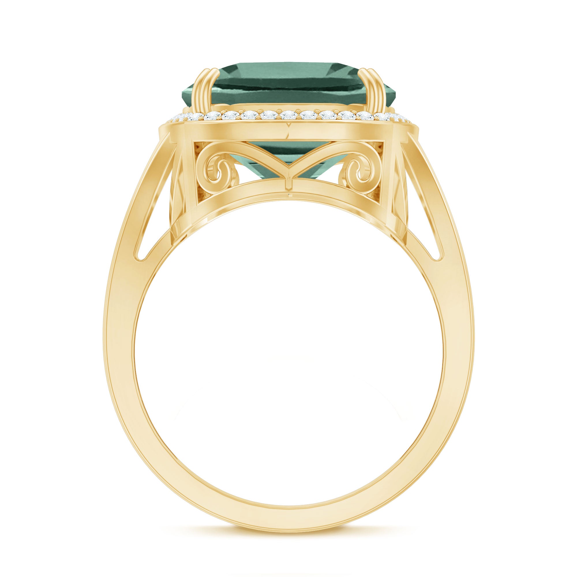 An enchanting Engagement Ring showcasing a perfect Cushion Cut Lab Grown Green Sapphire secured by Double Prong Setting more, Round Moissanite studded as Halo. Why settle for anything less than the gorgeous beauty your partner deserves? Grab this Lab Grown Sapphire Ring for your special one.