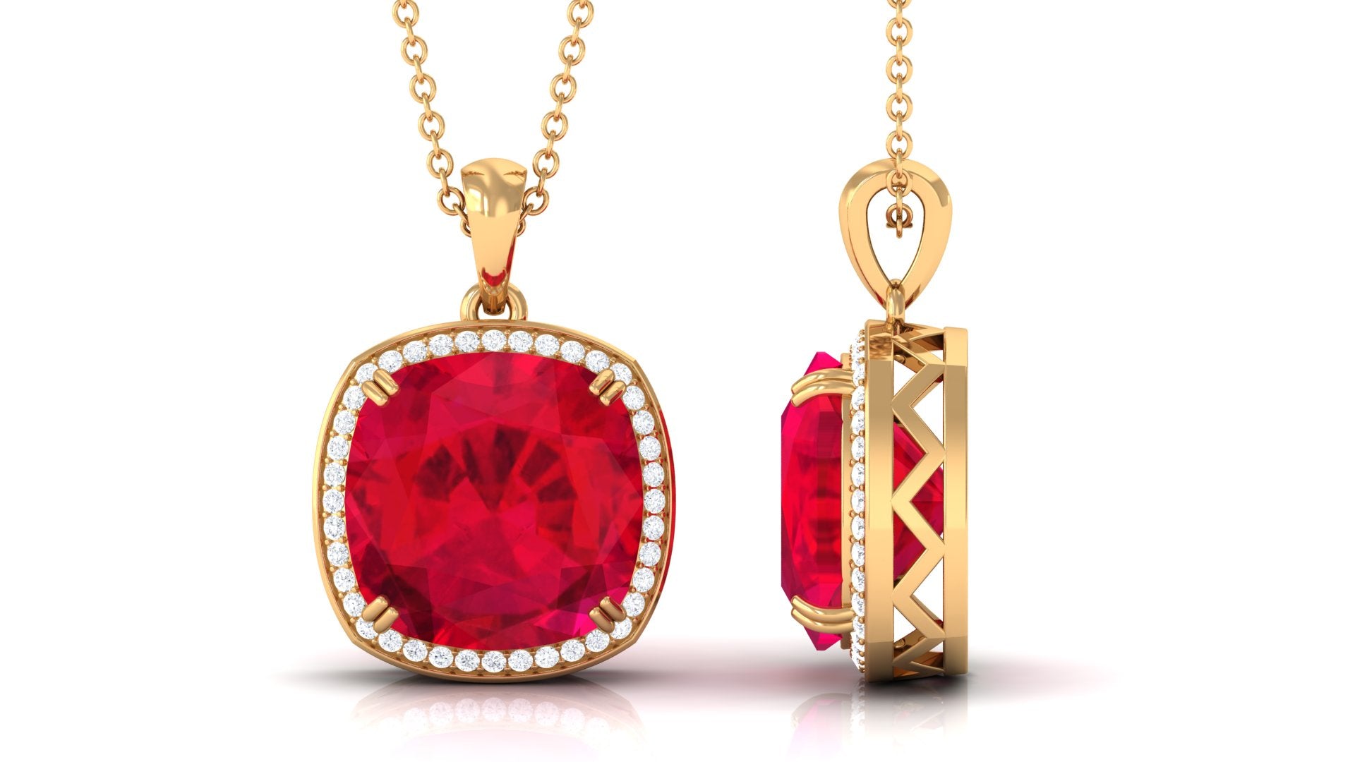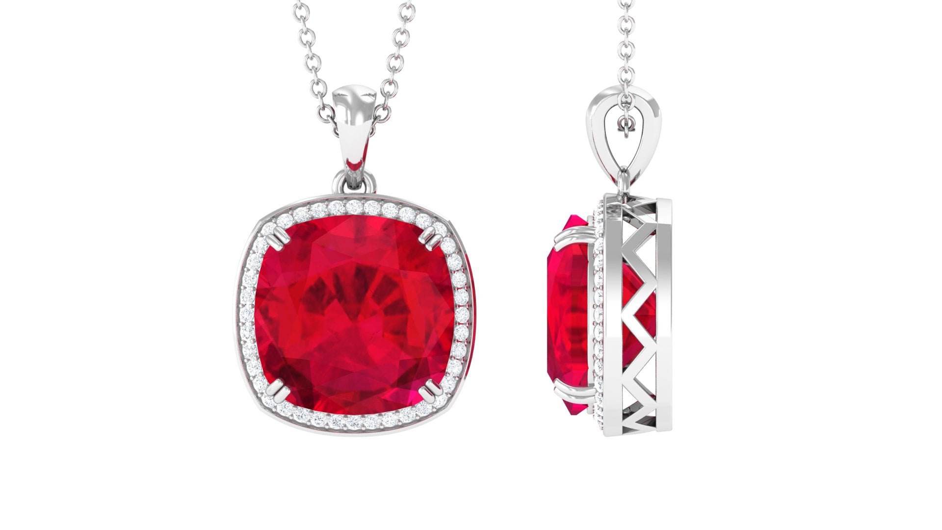 Add a touch of sparkle to your ensemble with this Lab Grown Ruby Pendant. It features 12 MM Cushion Cut Lab Created Ruby delicately set in prong setting encircled by a halo of Moissanites which creates an enchanting look. This Halo Necklace exudes a sparkling allure of AAAA Quality Lab Created Ruby. This pendant adds a brilliant and radiant touch to overall look. Elevate your essence with the mesmerizing hue of this Ruby Bridal Necklace and let this piece be your statement at every occasion.
