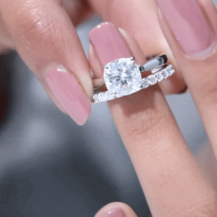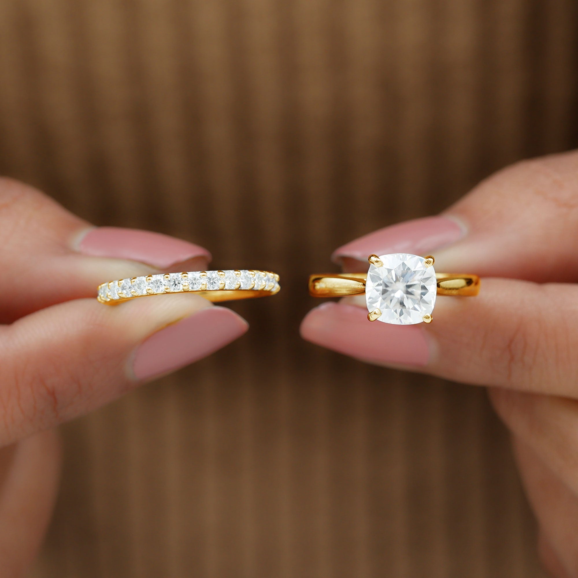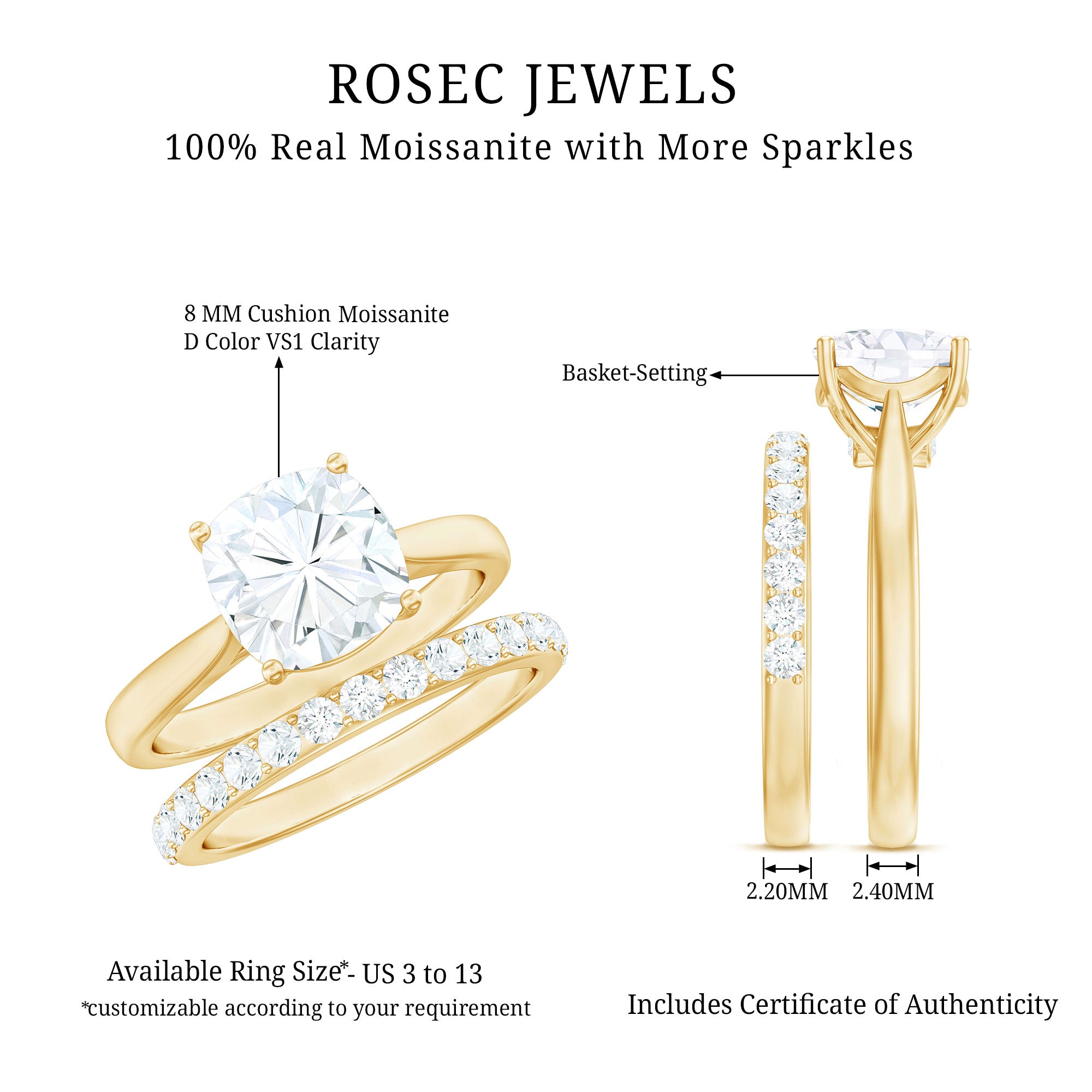 Celebrate your love story with a radiant symbol of forever - this exquisite Moissanite Bridal Ring Set. Designed to make every moment unforgettable, this 2 Piece Ring Set blends timeless elegance with thoughtful craftsmanship. The centerpiece of the set is a Cathedral Solitaire Engagement Ring, showcasing a breathtaking 8 MM cushion cut moissanite in basket setting, allowing the gem to rise gracefully from the finger and catch the light from every angle. A hidden surprise stone add subtle charm and proves that tiny touches make a big impact. Paired perfectly with the engagement ring is a Half Eternity Wedding Band, adorned with shimmering round moissanite stones that complement the brilliance of the center gem while adding their own soft sparkle. Together, the rings create a harmonious Solitaire Wedding Ring Set that is just as stunning when worn together as they are individually. Crafted to perfection, this Moissanite Engagement and Wedding Ring Set brings together durability, beauty, and eco-conscious elegance. Delivered in a luxurious signature jewelry box, it is ready to be gifted, treasured, and admired.