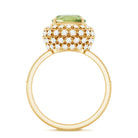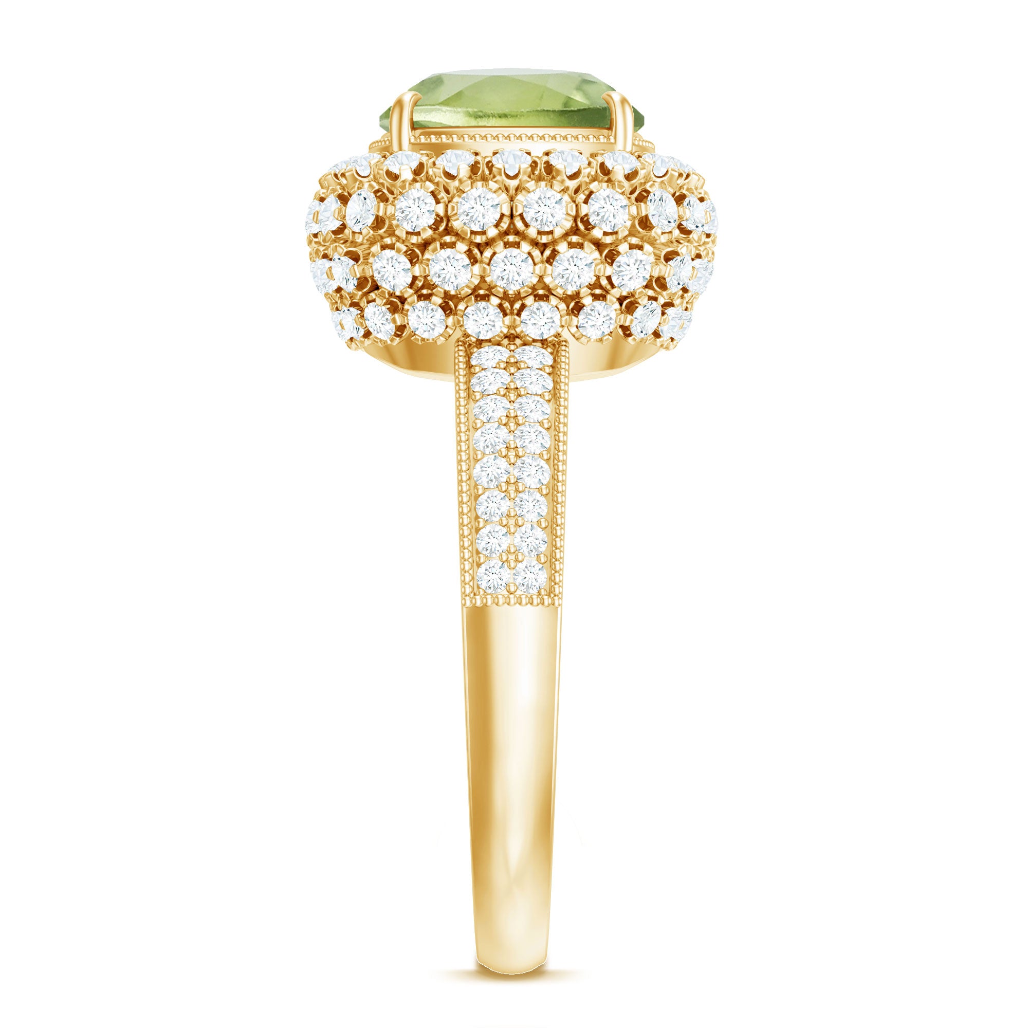 Make a bold fashion statement with this stunning statement ring, featuring a cushion cut Peridot set in a claw setting at the center and round cut moissanite stones on the sides. The engagement ring is crafted in beaded gold, making it a romantic and luxurious accessory that you can wear any day.