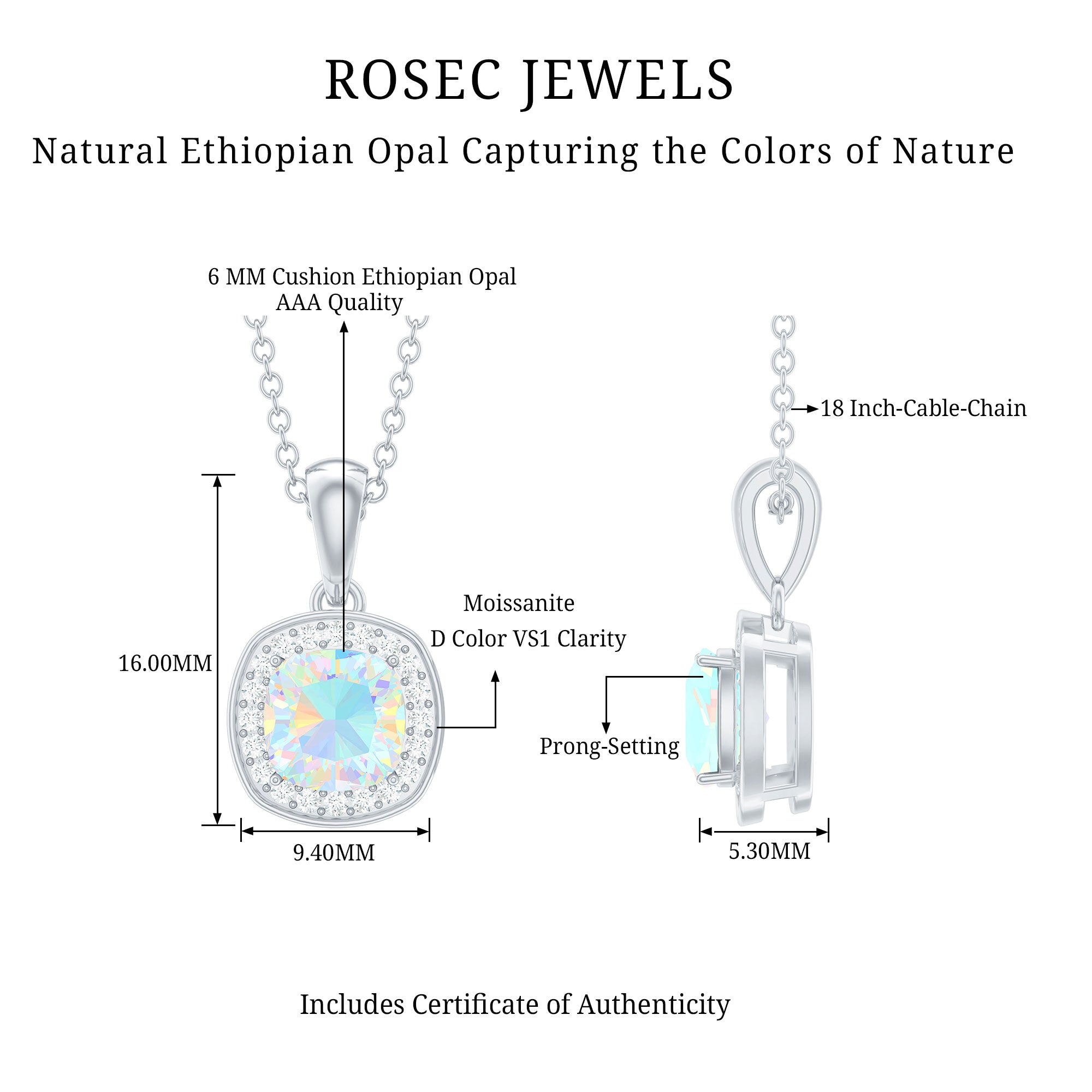 Make a statement with the bright colors of this Ethiopian Opal Pendant on your big day, making it unforgettable. This beautiful Halo Necklace features a 6 MM Cushion Cut Natural Ethiopian Opal at its heart, elegantly held in a prong setting and surrounded by sparkling round cut Moissanite gems that form a lovely halo. Made from 14K White Gold Plated Silver, this gorgeous Bridal Necklace is sure to enchant and become a cherished addition to your jewelry collection. A classic piece, this cushion cut halo necklace is the perfect finishing touch for any outfit. This striking Rainbow Stone Necklace is truly memorable, exuding elegance and charm. It adds a touch of glamour to your ensemble, elevating your style. Crafted with precision, it captures a timeless romance with its sophisticated design. The AAA Quality Opal and D-Vs1 Quality Moissanite sparkle beautifully from the pendant, making it a standout piece of jewelry.