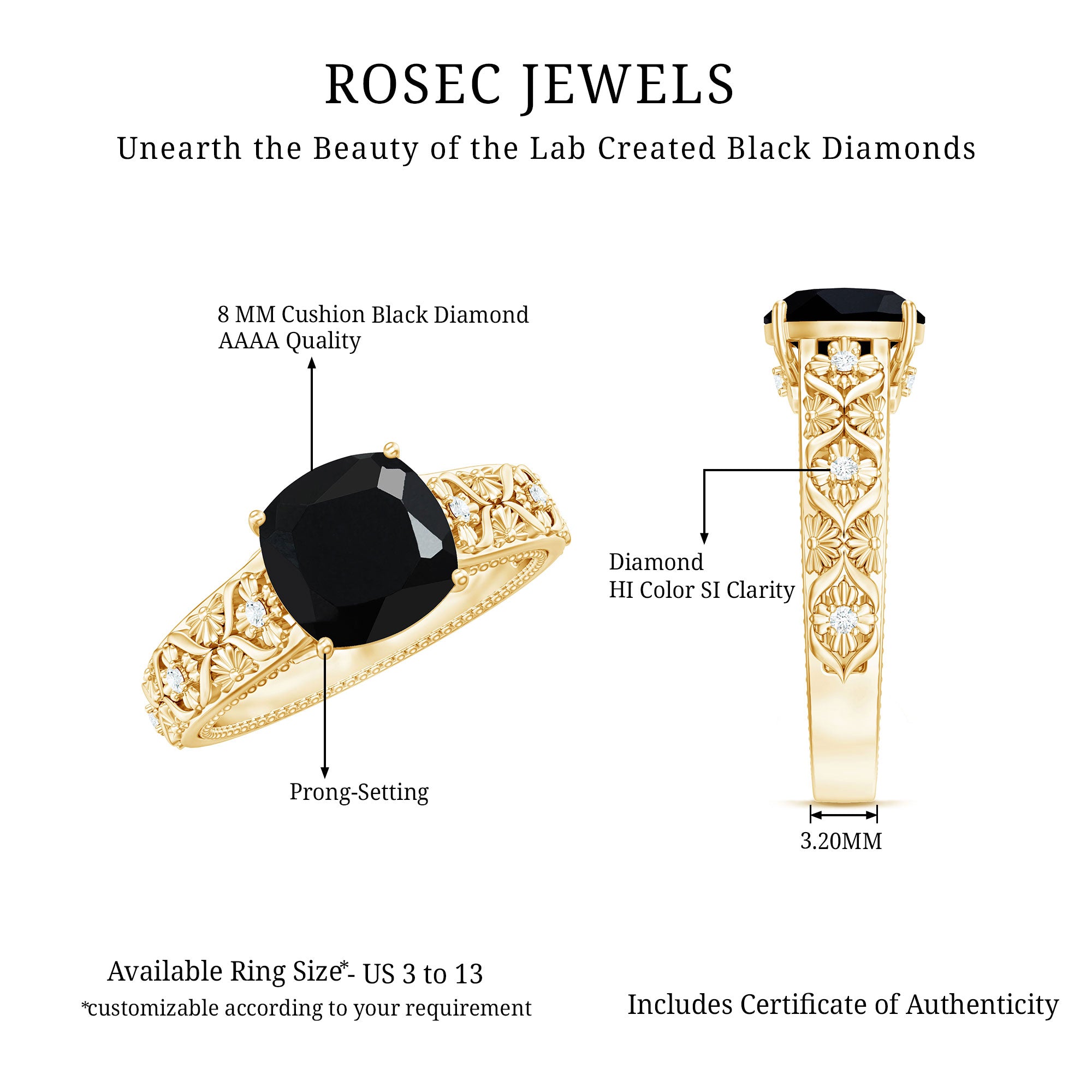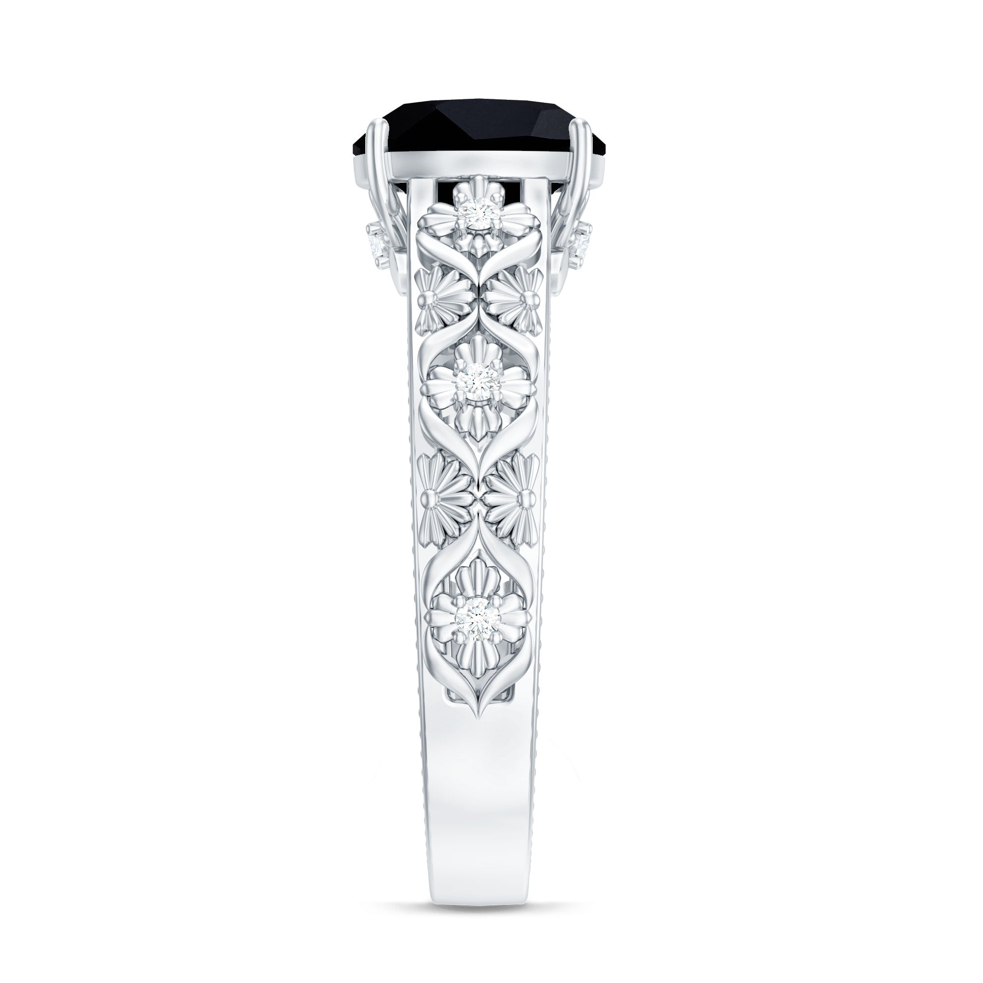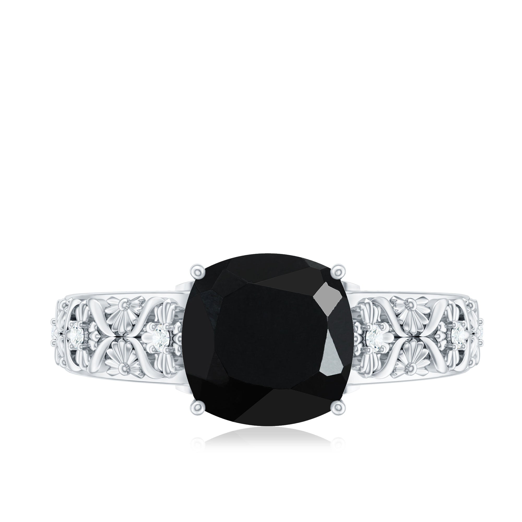 Cushion Cut Solitaire Created Black Diamond and Diamond Floral Engagement Ring