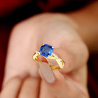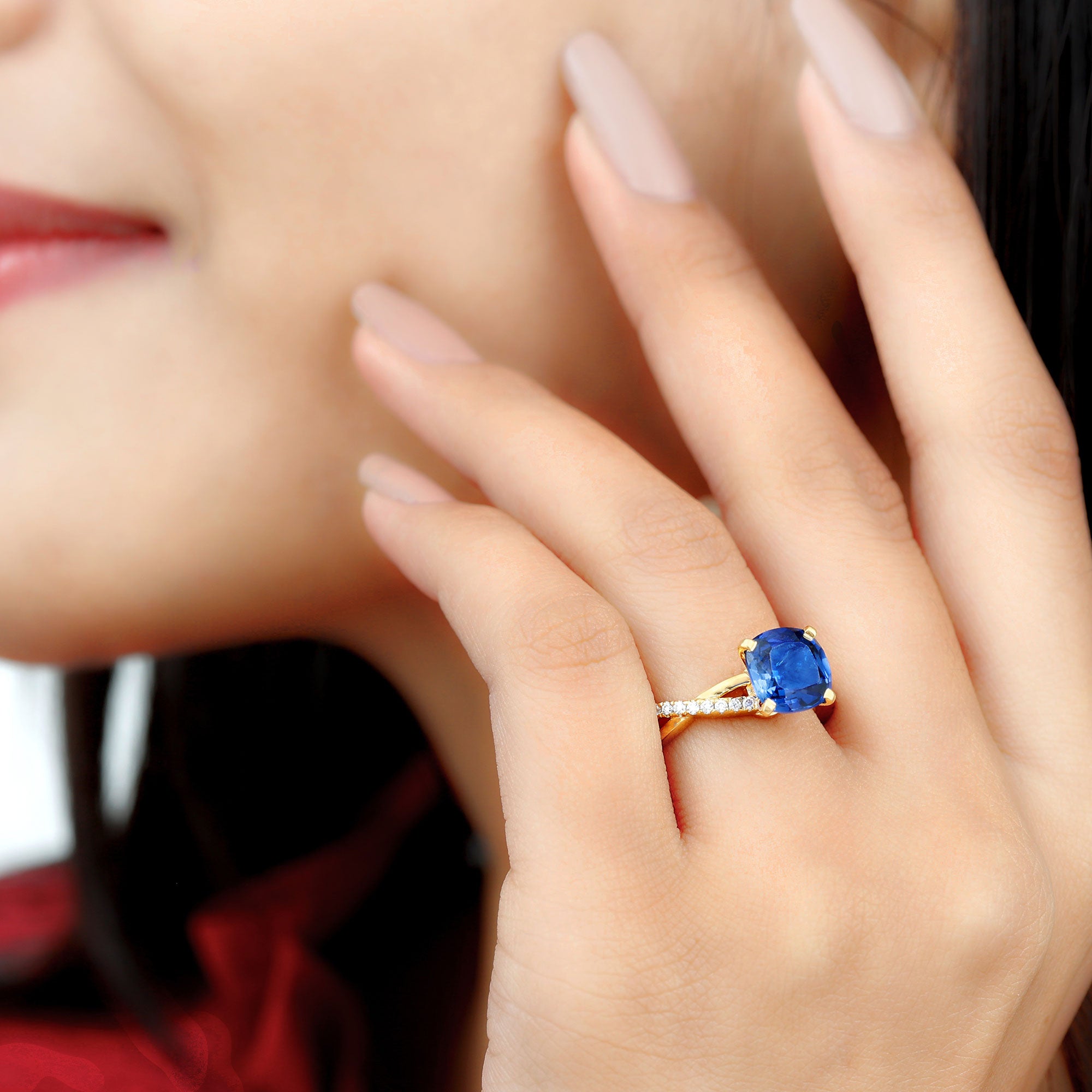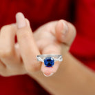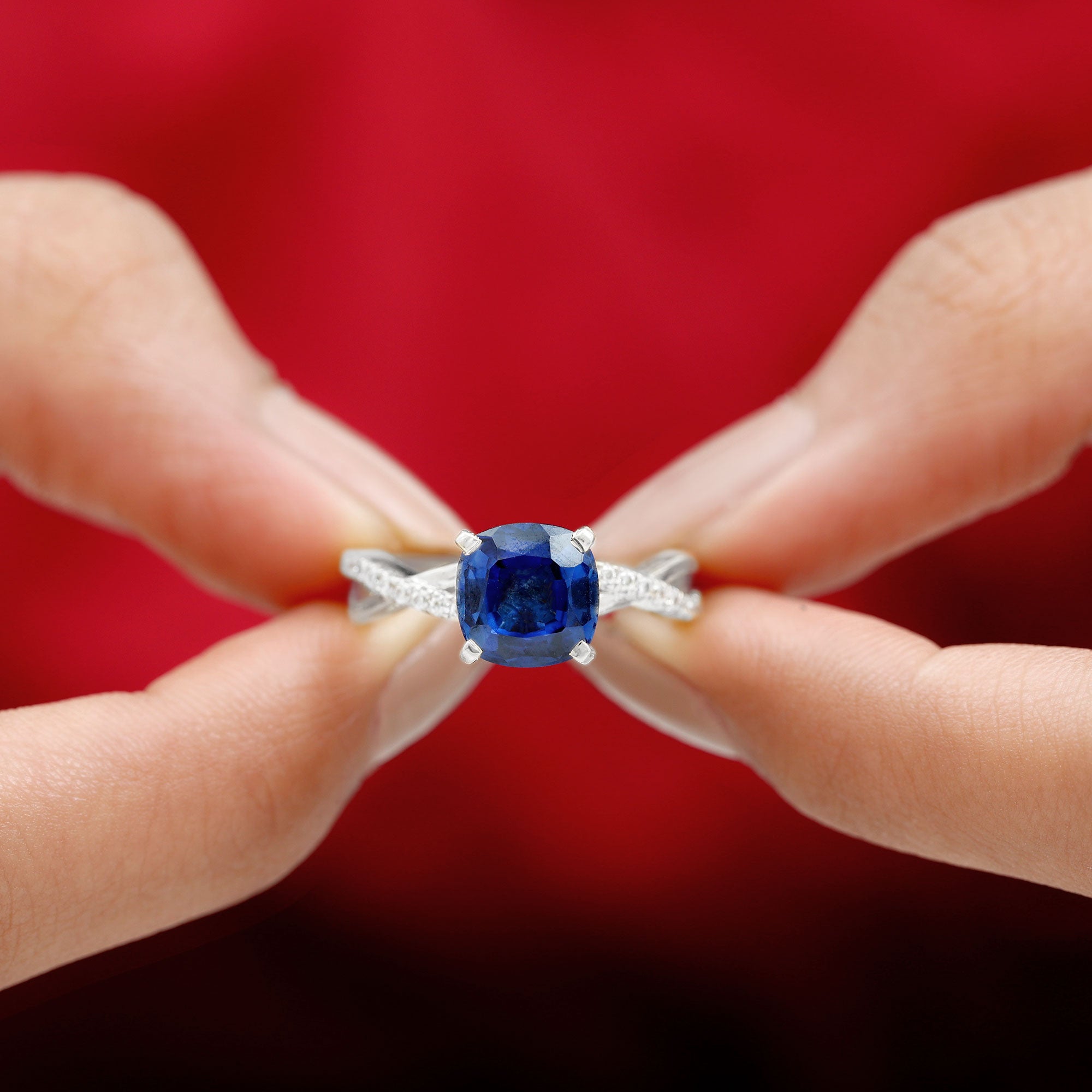 Recognized as an Engagement Ring, showcasing a central Cushion-Cut lab grown blue sapphire as the Solitaire gem. This exquisite gem is accentuated by a Prong Setting and further enhanced by Round Brilliant Diamond stones, delicately placed in a Prong Setting. Notably, this ring also holds the distinction of being a Crossover Ring design.