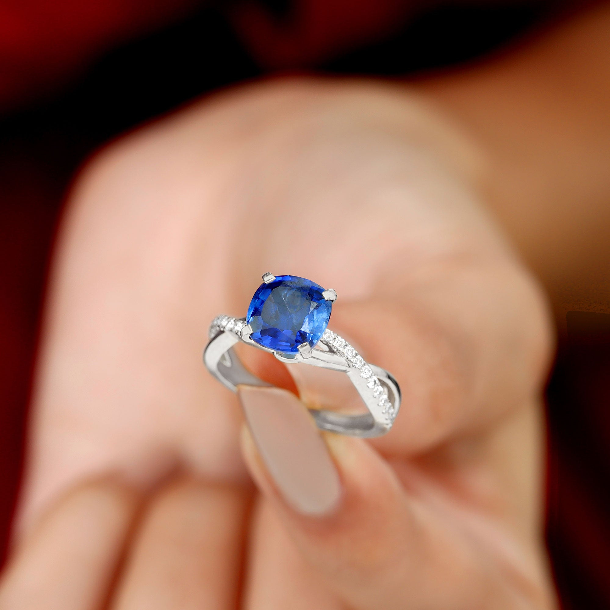 Cushion Cut Solitaire Lab Grown Blue Sapphire Infinity Engagement Ring