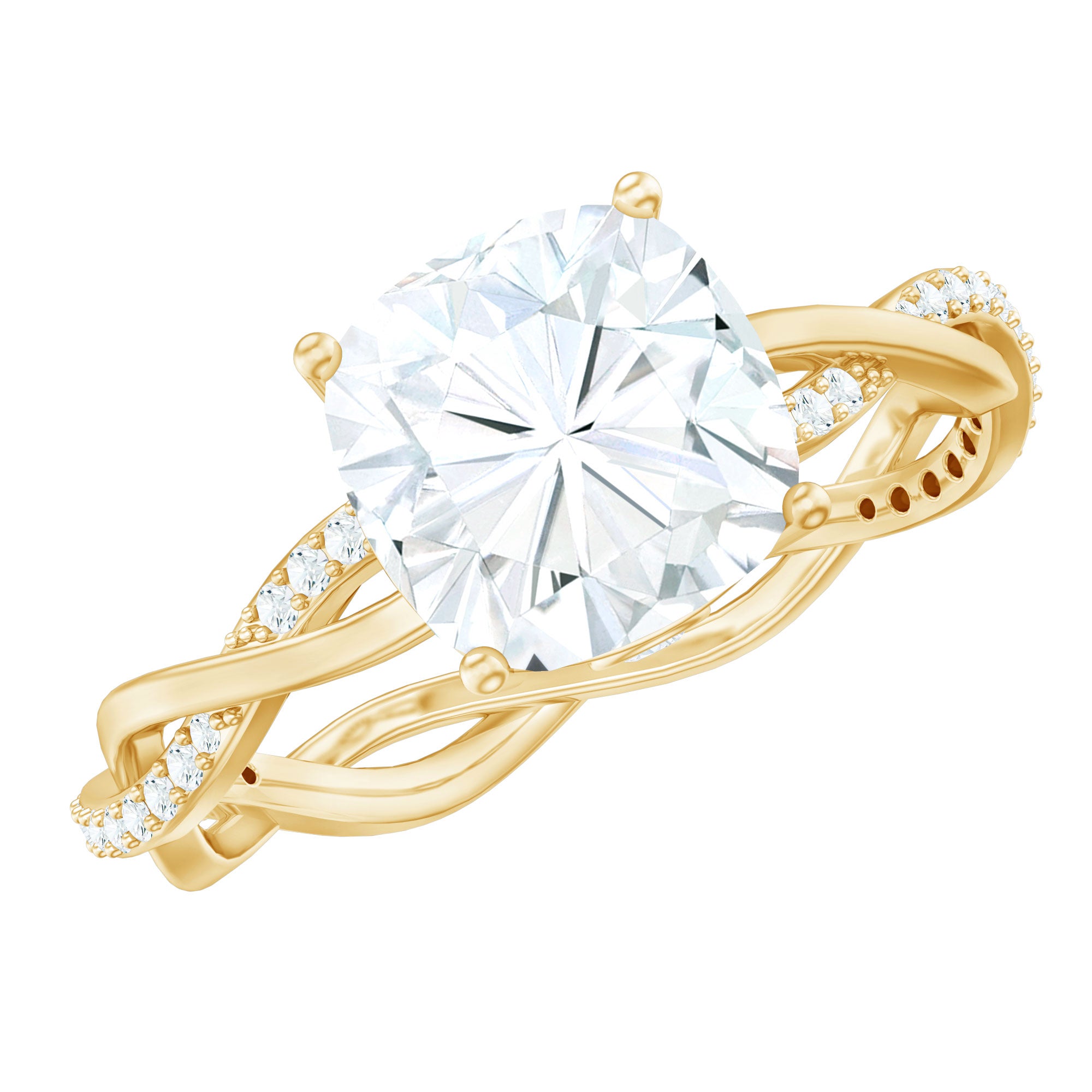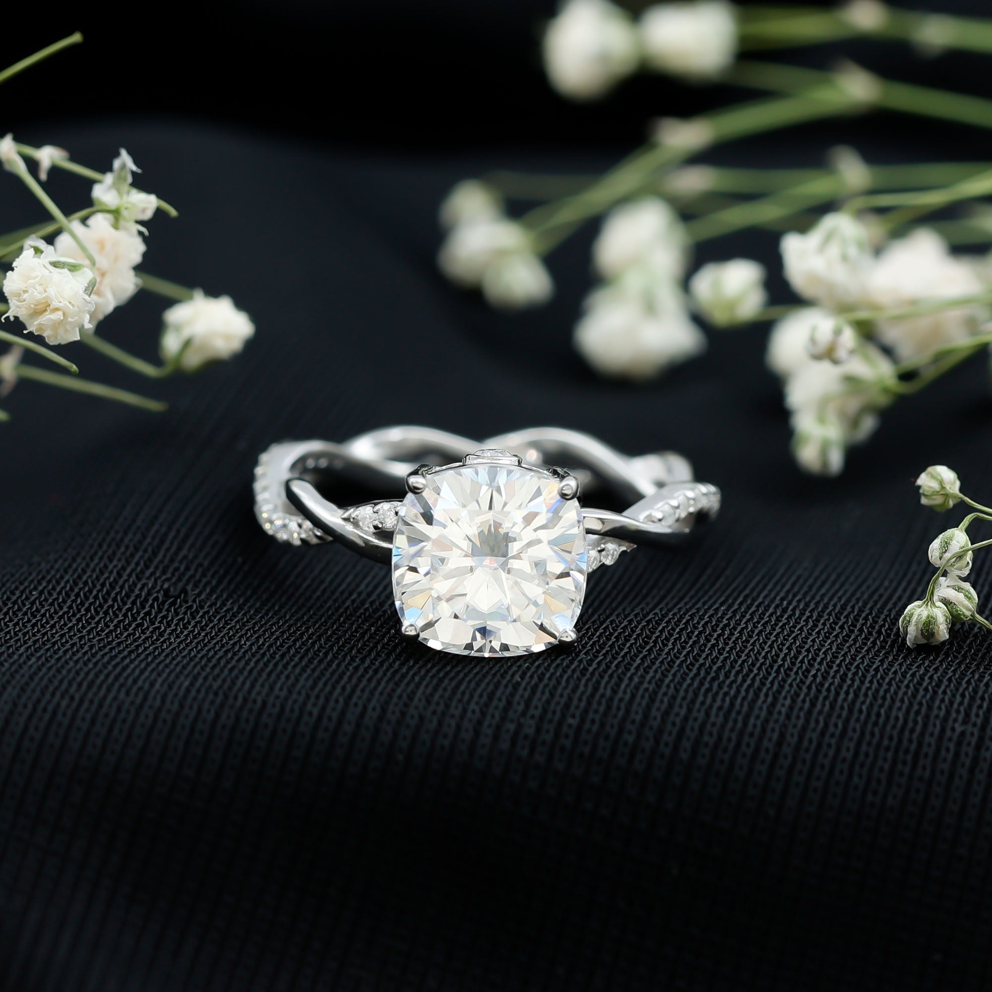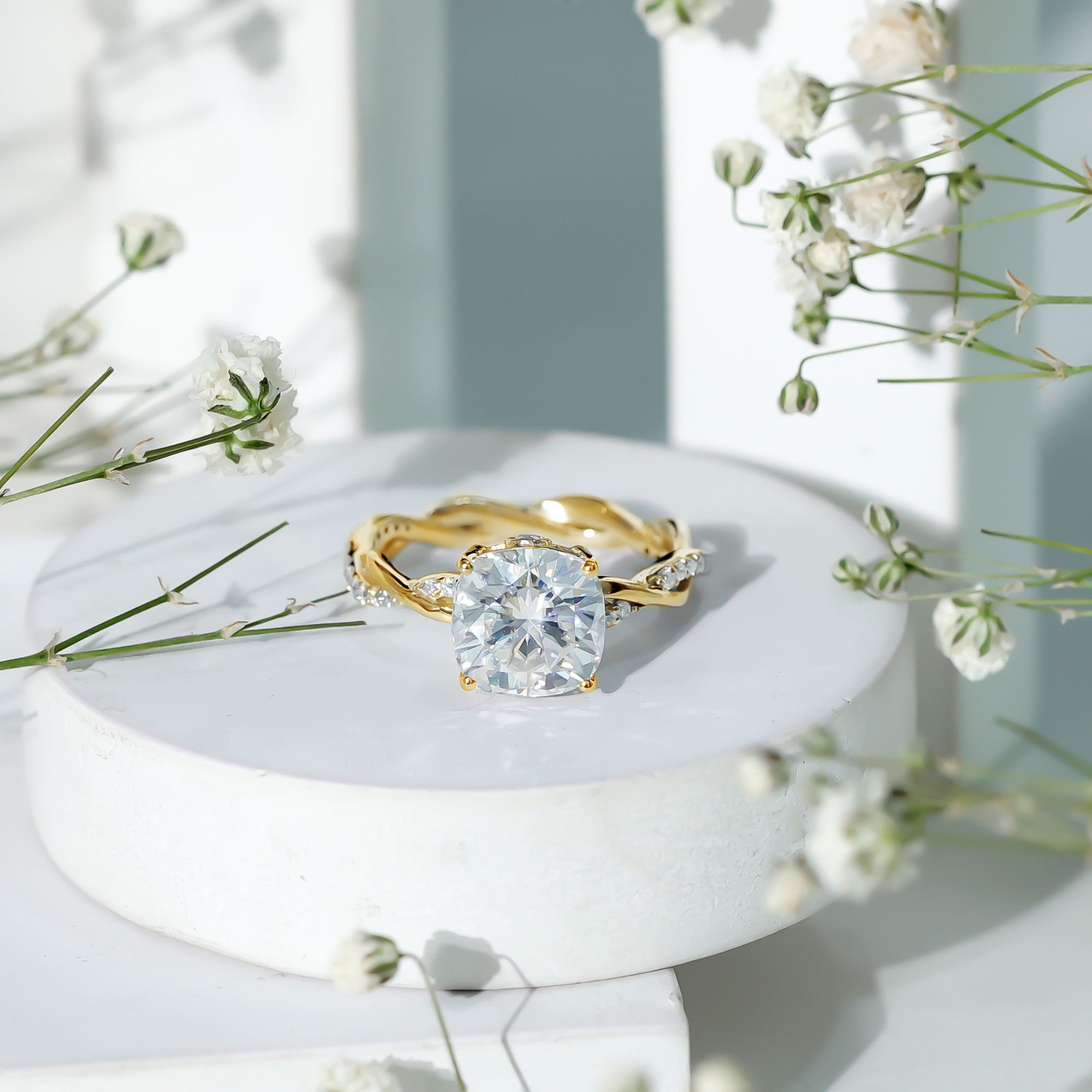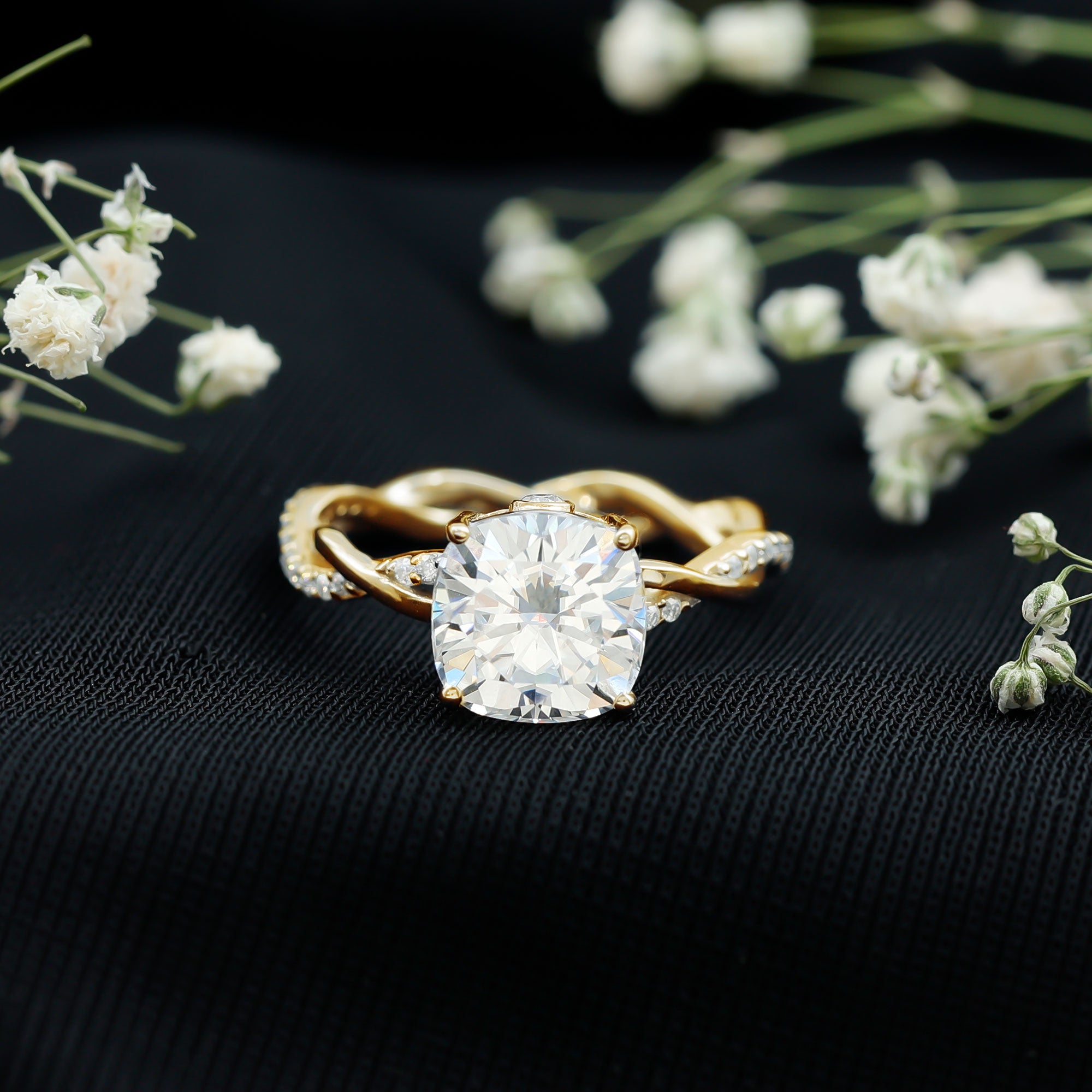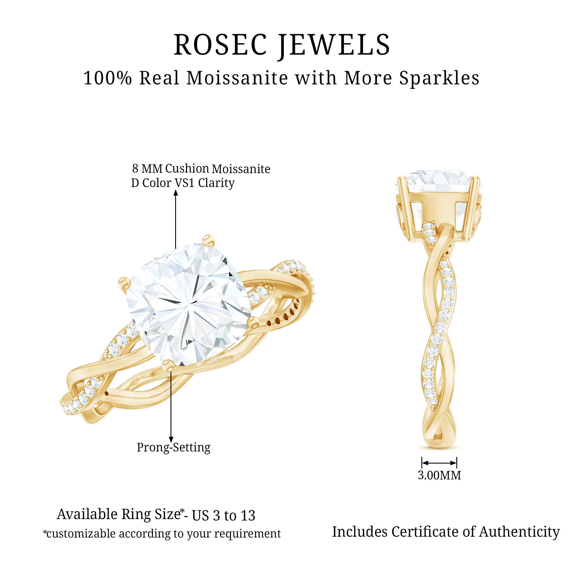Elevate your forever moment with this Moissanite Engagement Ring that boasts a beautifully braided band. At its heart lies a dazzling D-VS1 Quality 8 MM Cushion Cut Moissanite, set in Prong Setting, selected for its timeless shine and elegant appeal. The band features intricate braiding and is embellished with tiny stones, crafting a delicate yet striking design that represents two lives intertwined in love and harmony. The extra sparkle from the petite hidden moissanite beneath the main gem boosts the overall brilliance, making this Braided Engagement Ring a treasured piece for years ahead. This 3 Carat Moissanite Ring for Women is ideal for those who appreciate a blend of classic elegance and contemporary flair. The braided design lends a romantic touch to this Cushion Cut Engagement Ring, while the Moissanite provides an ethical and stunning option without sacrificing shine. Offered in US standard sizes from 3 to 13, this Moissanite Solitaire Ring is tailored for the perfect fit and comfort, whether for daily wear or special events. Whether youre proposing, celebrating your love, or simply seeking a meaningful piece, this Solitaire Engagement Ring is a gorgeous choice that narrates your story with style and sparkle.