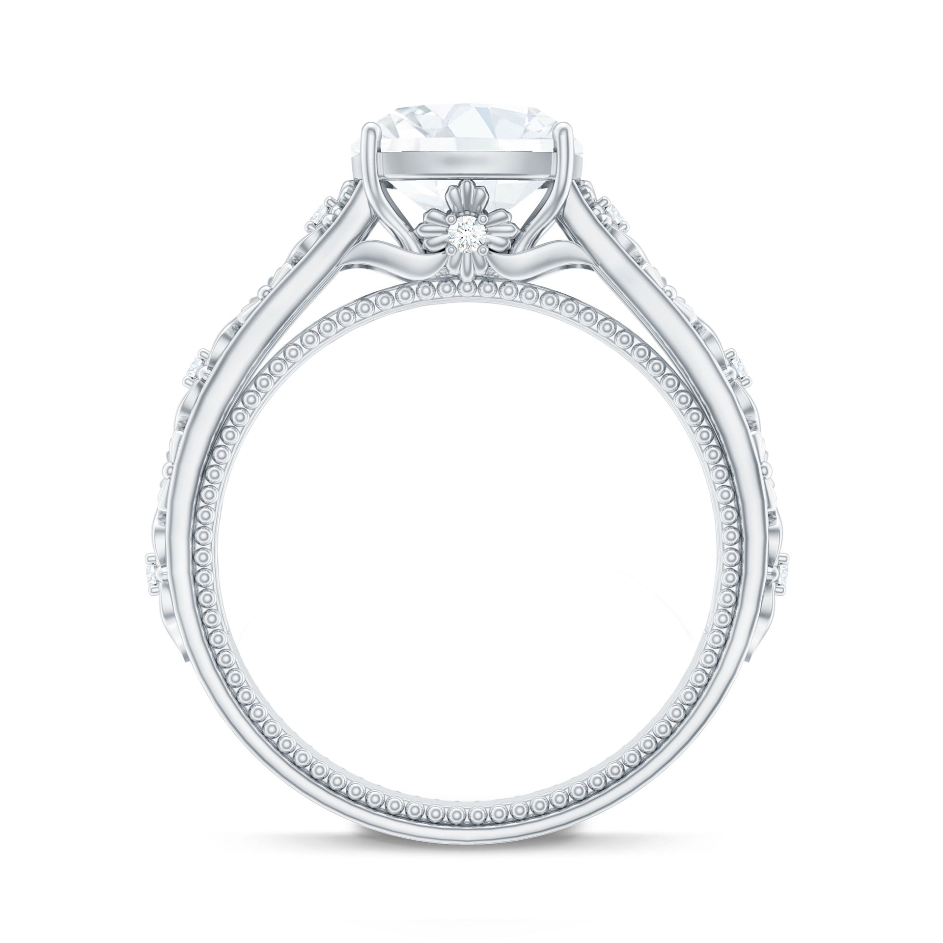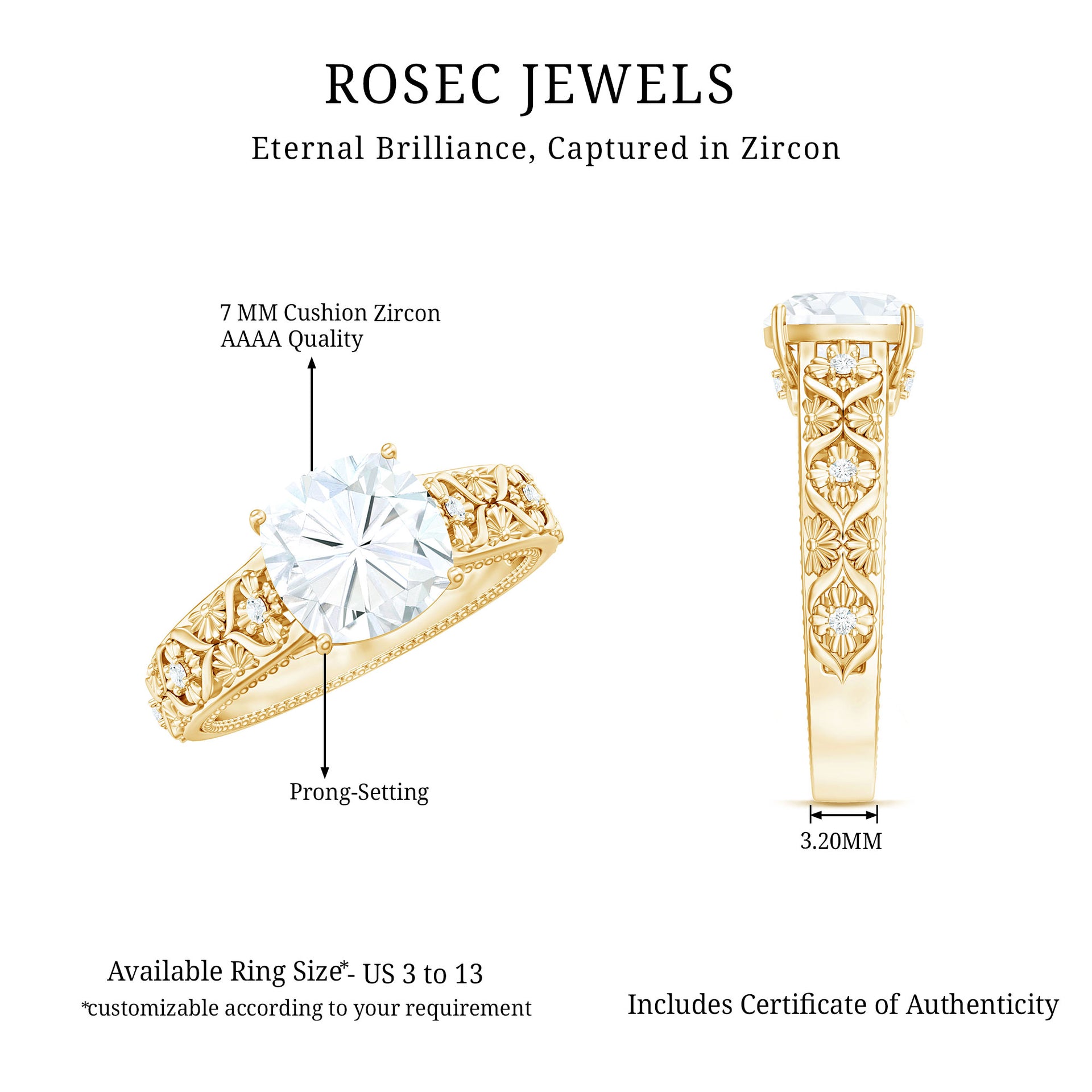 This beautiful engagement ring features a cushion cut solitaire zircon stone set in prong setting with floral details. The zircon stone sparkles brilliantly and is known for its clarity and durability. The band is made of gold, adding a touch of luxury and elegance to the ring. The intricate floral designs along the small zircon stones create a unique and feminine touch that complements the classic solitaire stone. This ring is perfect for someone who appreciates a timeless and classic design, with a hint of intricate detail. Its a perfect symbol of love and commitment that will last a lifetime, and will be treasured by its wearer for years to come.
