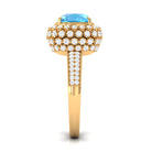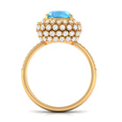 Make a bold fashion statement with this stunning statement ring, featuring a cushion cut Swiss Blue Topaz set in a claw setting at the center and round cut moissanite stones on the sides. The engagement ring is crafted in beaded gold, making it a romantic and luxurious accessory that you can wear any day.