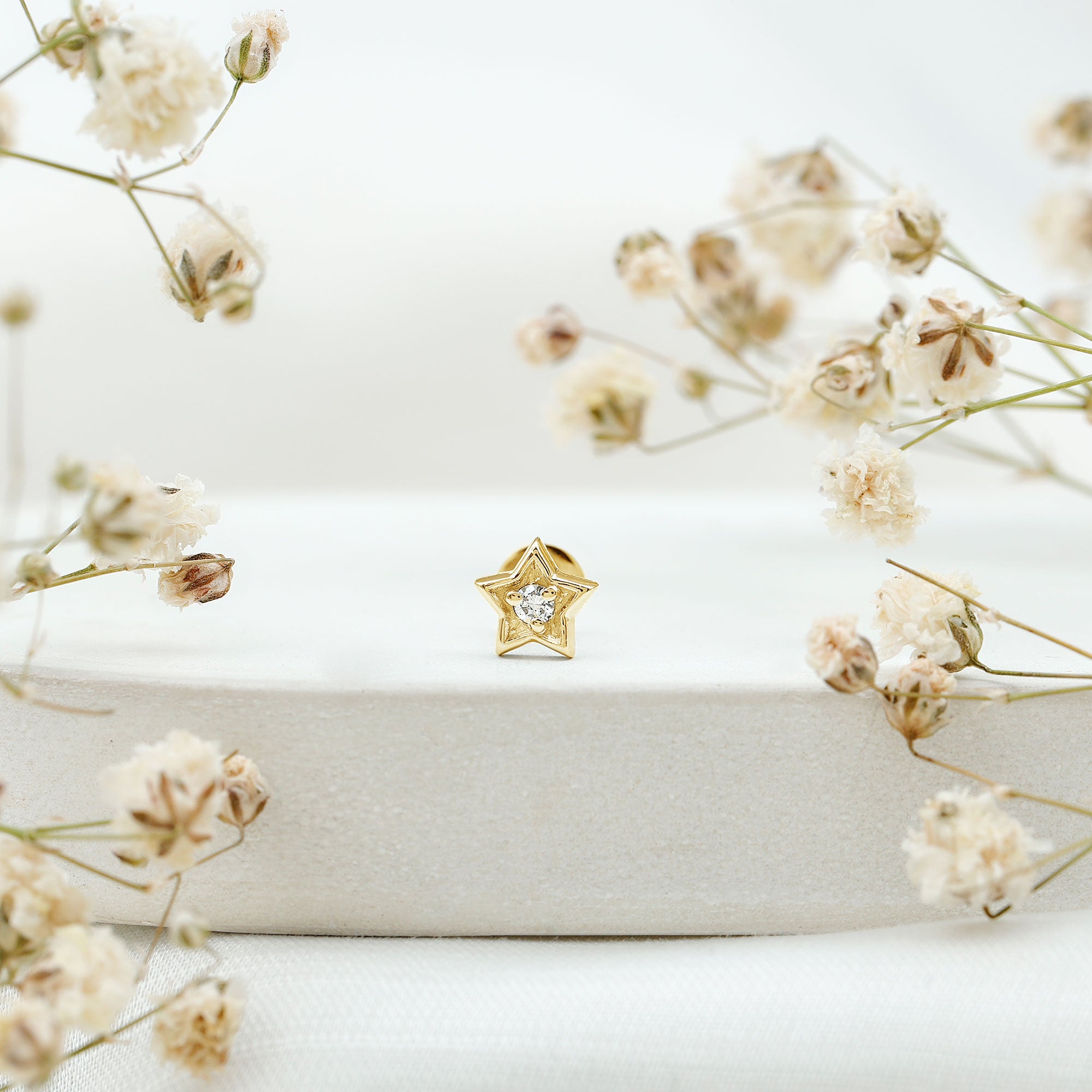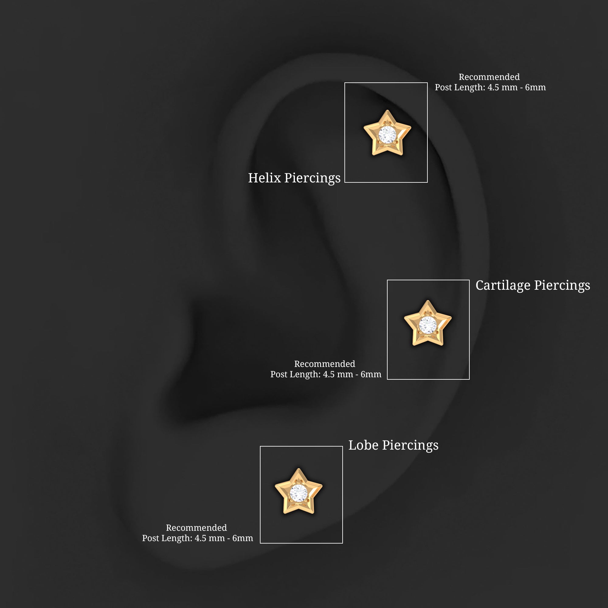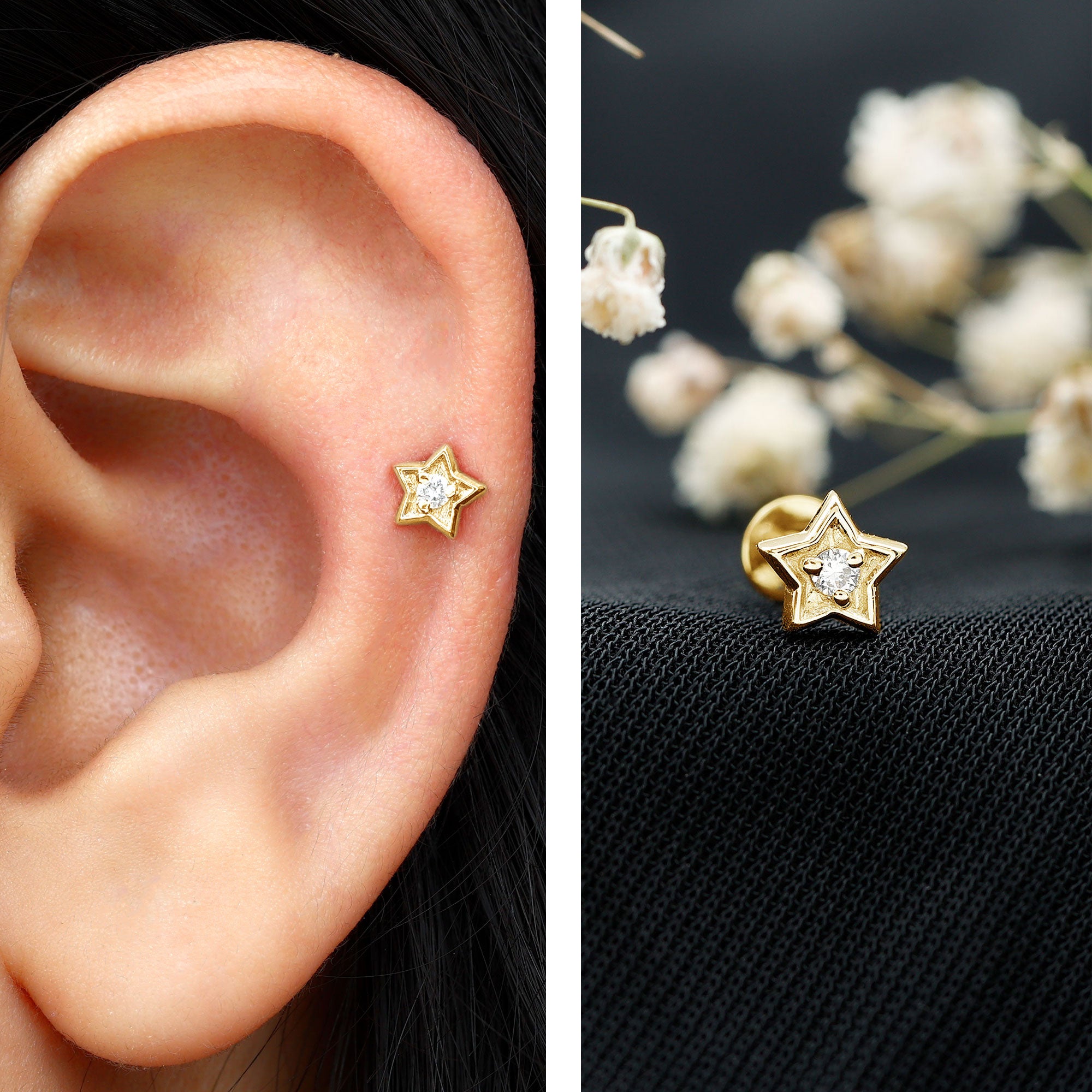 - Style this star celestial earring on your Helix, Cartilage, Tragus, Conch, or Upper Lobe Piercing. The flat back closure will keep it intact in place.