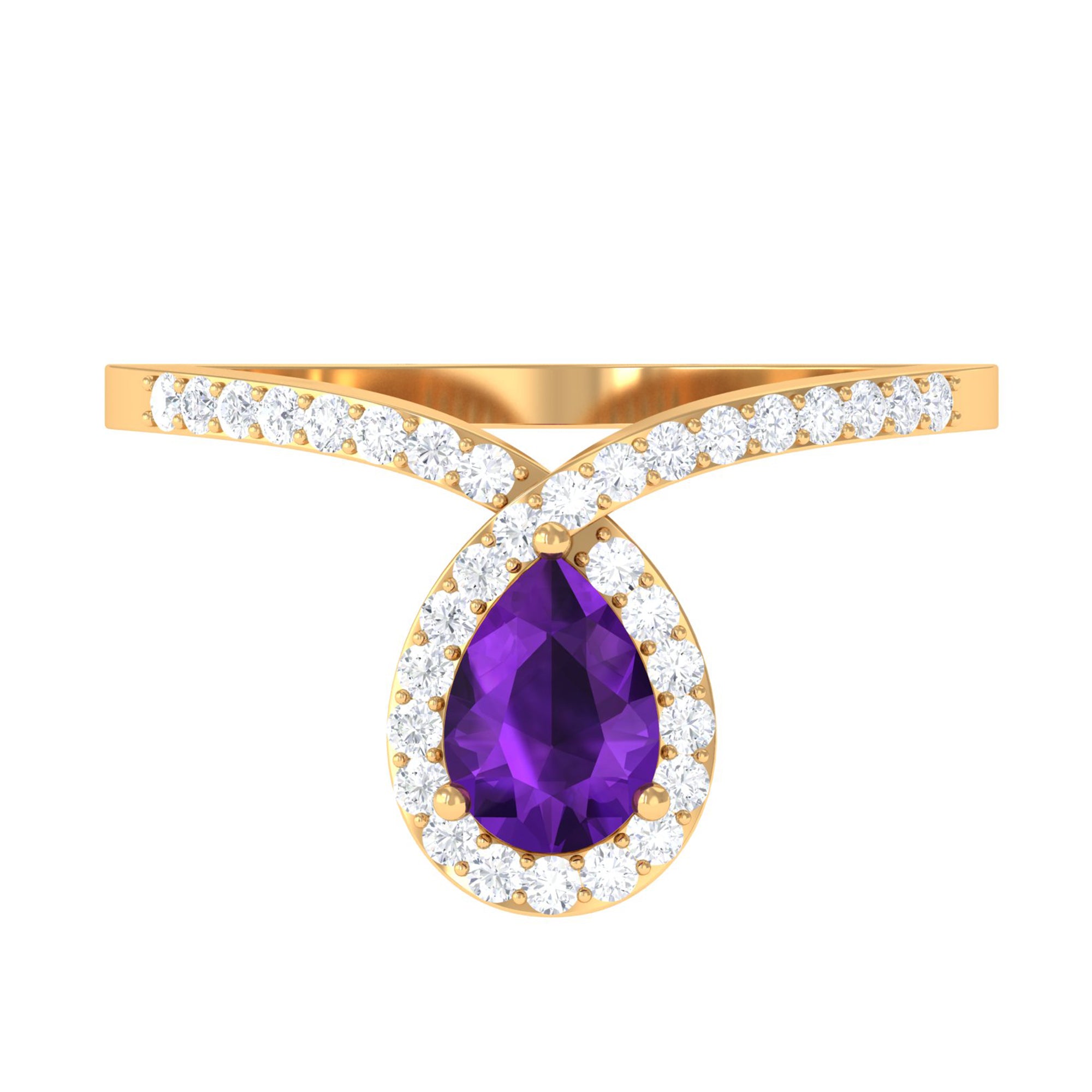 With this stunning Designer Engagement Ring crafted from Gold Metal, you can embark on a new chapter of your life together. As an exquisite choice for your special day, this Teardrop Engagement Ring for Women is adorned with Pear Shape Amethyst in a prong setting and a petite Round Shape Diamond in a halo and Side Stones.