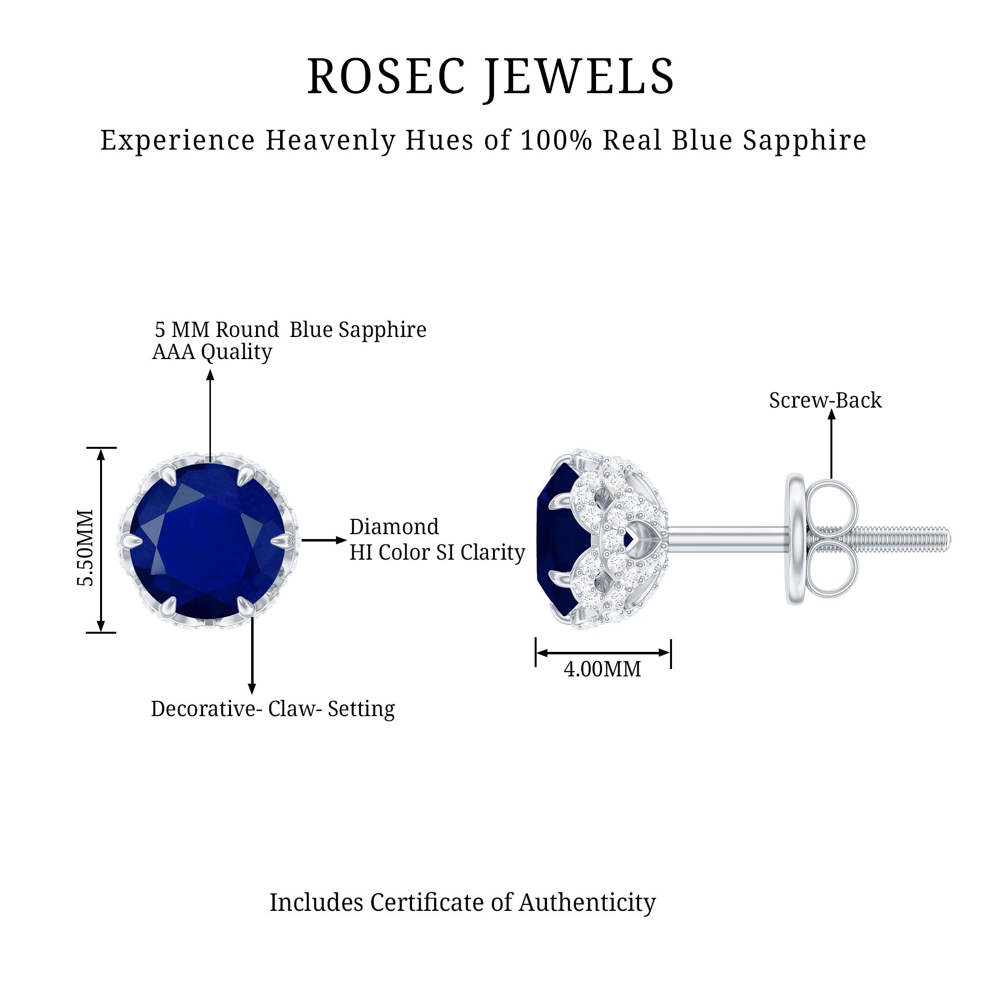 A mesmerizing pair of Designer Stud Earrings, where classic elegance meets modern luxury. Each earring features a 5 mm Round Shape Blue Sapphire set in 6 Claw Prong Setting, beautifully accentuated by sparkling Diamond stones, which are meticulously set around the stones to enhance their vibrant color and brilliance. The design is bold yet refined, offering a timeless style that complements any occasion, from formal events to casual chic. The secure Screw Back Closure ensures a comfortable and worry-free fit, so you can wear them confidently all day or night. These AAA Quality Blue Sapphire Earrings are perfect for adding a pop of color and sparkle to your look, whether you are dressing up for a special night out or elevating your everyday style. Presented in a signature jewelry box, these Blue Sapphire Diamond Earrings are ready to gift for any occasion, be it a birthday, anniversary or any special moment. Perfect for those who appreciate a little luxury in their everyday life, these Blue Sapphire Stud Earrings are a sophisticated choice that will never go out of style. A stunning addition to any jewelry collection, they will be cherished for years to come.