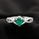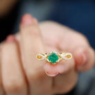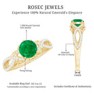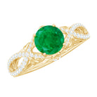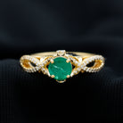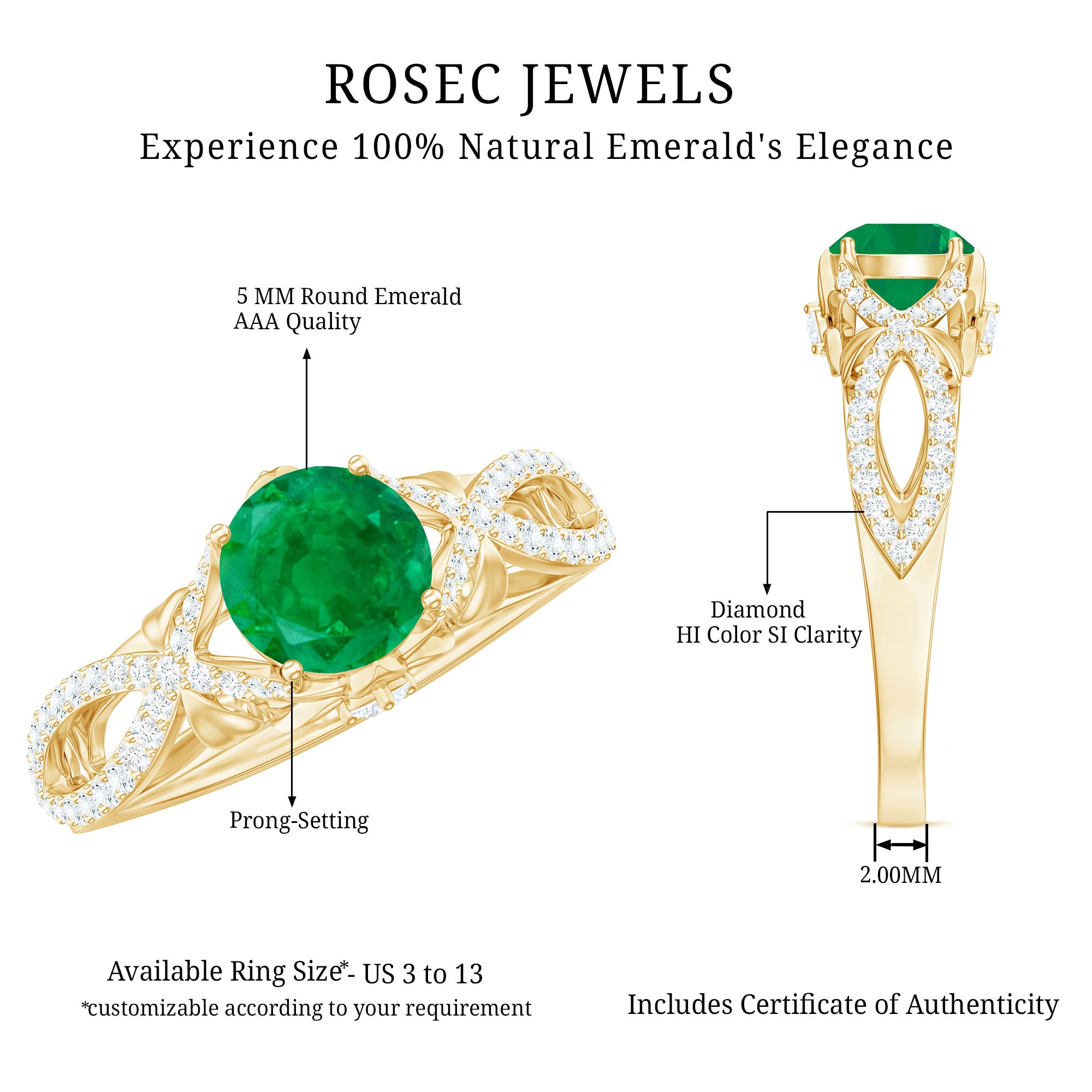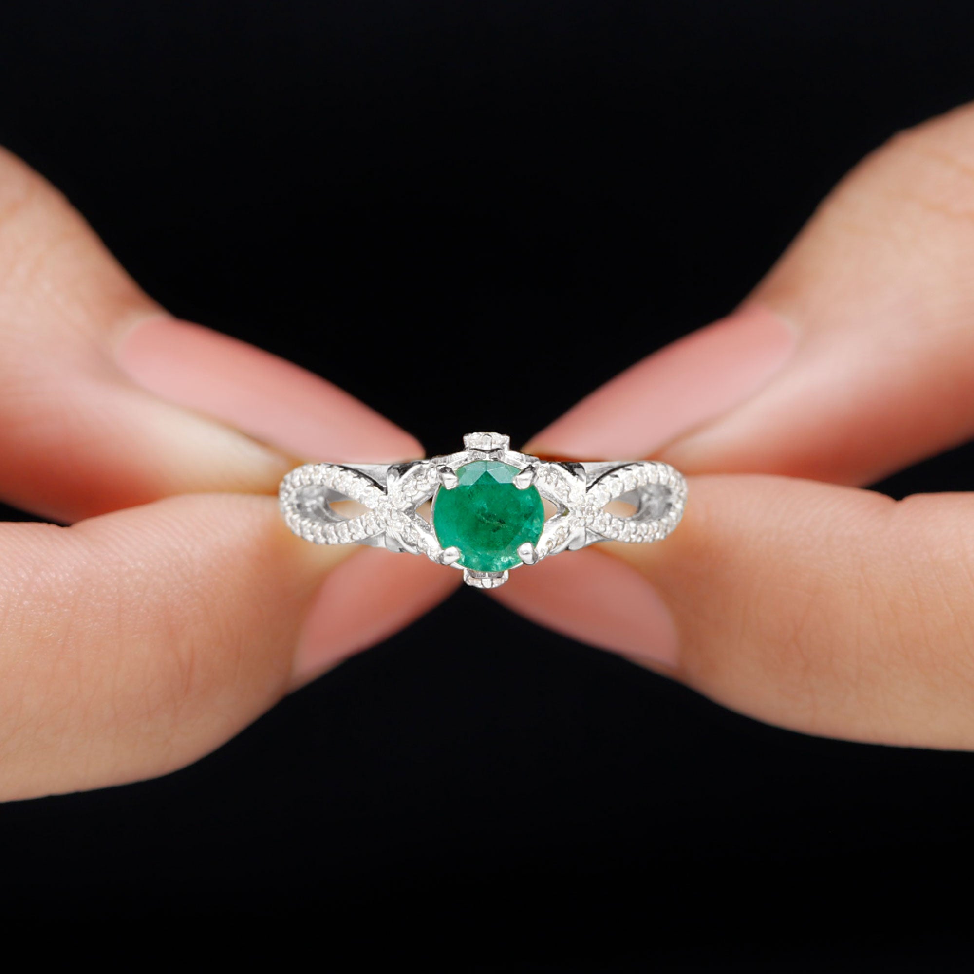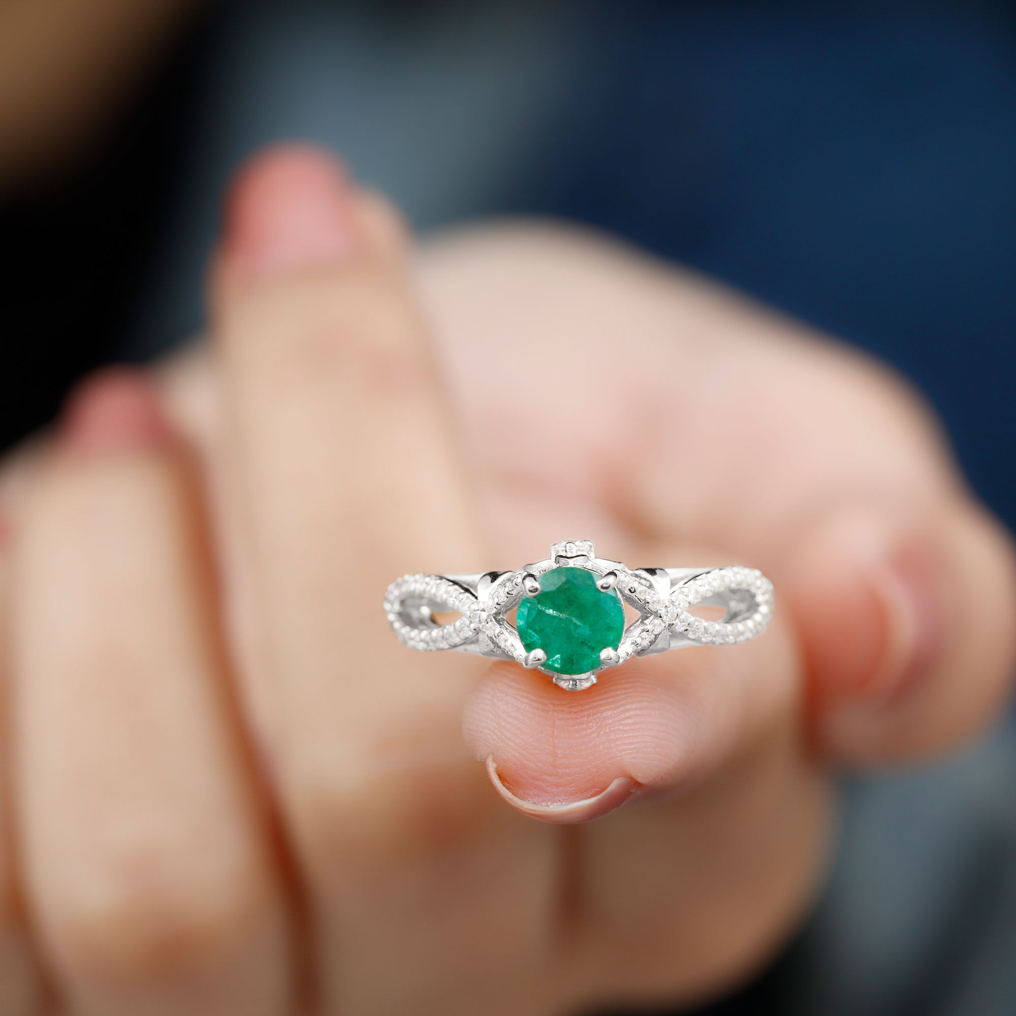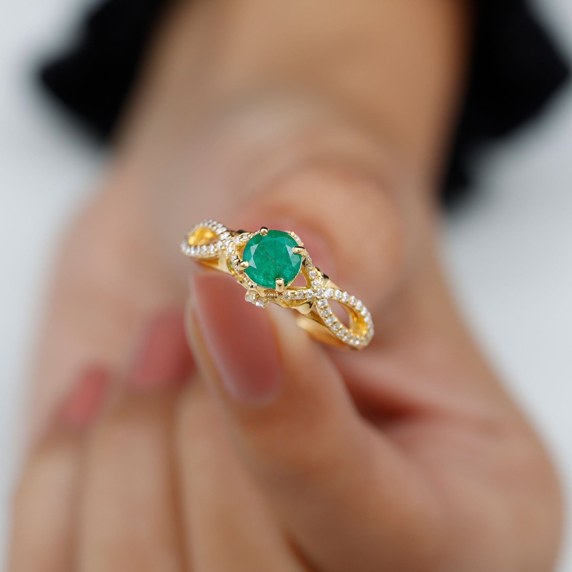 Bring a touch of gemstone brilliance to your look with this Emerald Engagement Ring, a symbol of elegance and renewal perfect for those born in May. The Crossover Ring features a 5 MM round shaped emerald set gracefully in secure prong setting. Its unique design showcases a crossover shank adorned with sparkling diamonds, adding a refined and designer touch that makes this piece truly special. Beneath the emerald lies a delicate diamond set in a flower motif, creating a hidden surprise that adds charm and detail to the Designer Engagement Ring. The combination of the AAA quality emerald and shimmering HI-SI quality diamonds gives the piece a luxurious yet graceful feel, perfect for anyone who values timeless beauty with a modern twist. The crisscross design beautifully symbolizes connection and harmony, making it a meaningful choice for engagements or special celebrations. This Emerald and Diamond Ring is not just jewelry but a statement of personality and style. Whether worn every day or for memorable occasions, it adds a hint of sophistication and color to any outfit.