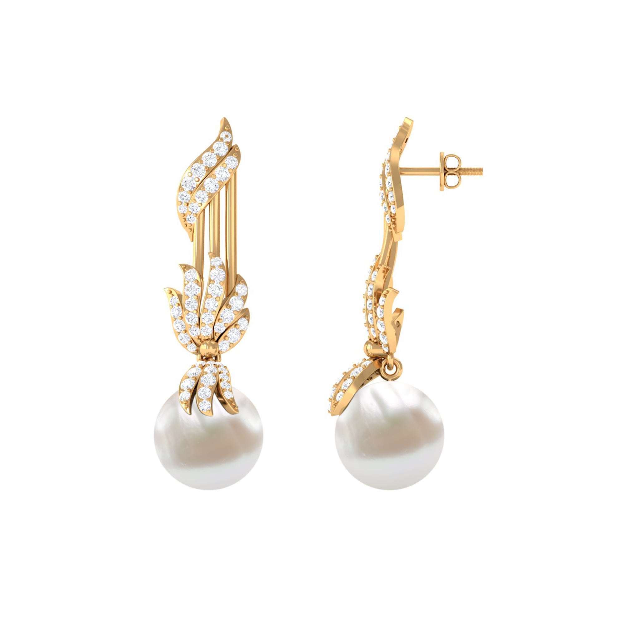 Express your love with these exquisite Freshwater Pearl Earrings. Featuring a 10 MM Round Shape Pearl delicately set in a Bead Setting, these earrings are adorned with sparkling Diamond accents, adding a touch of elegance. Perfect for weddings or special occasions, these dangle earrings are a beautiful symbol of your affection.