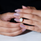Set on a luminous shank is a round freshwater cultured pearl in this solitaire ring. Shimmering round moissanite partially accentuates the shank in a fun twist. The plain shank band keeps things on the simpler side. Wear them as your constant fashion partner and slay your every day.