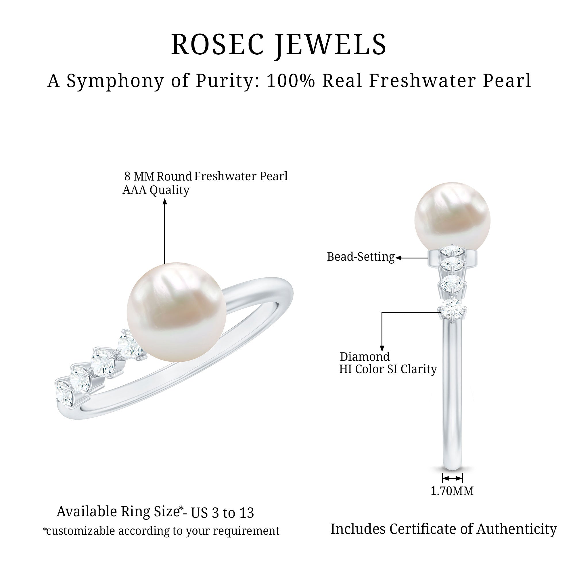 Uniquely designed Freshwater Pearl Engagement Ring features Round Diamond held in a claw setting on one side of the shank to give the ring a creative look. The Exclusiveness of this Pearl Ring will mesmerize your partner.