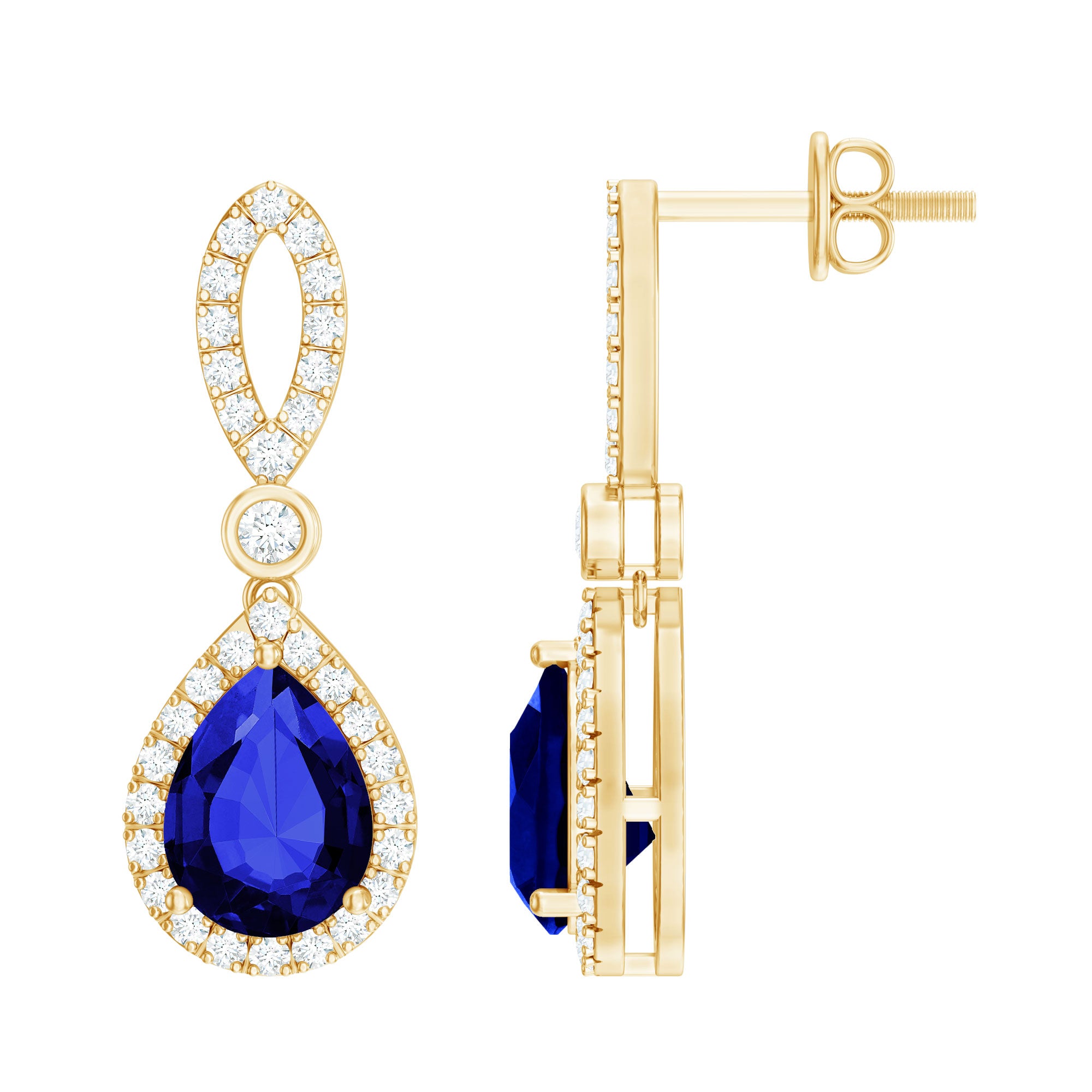 Enhance your style effortlessly with our unique Designer Lab Grown Sapphire Earrings. The intriguing design showcases a Prong Set Lab Grown 6x8mm Pear Shaped Blue Sapphire adorned with Round Lab Grown Diamond, adding a touch of sophistication to complement your ears. These Designer Earrings are versatile, perfect for both casual and evening attire, and are bound to earn you compliments every time you wear them. These earrings are adorned with Aaaa Quality Sapphire and Ef-Vs Quality Diamonds. These earrings can be worn solo or stacked with your other favorite pieces, these Sapphire Diamond Earrings allows you to create statement looks with ease. Surprise your partner with these Drop Earrings as a heart melting gift, expressing just how much they mean to you.