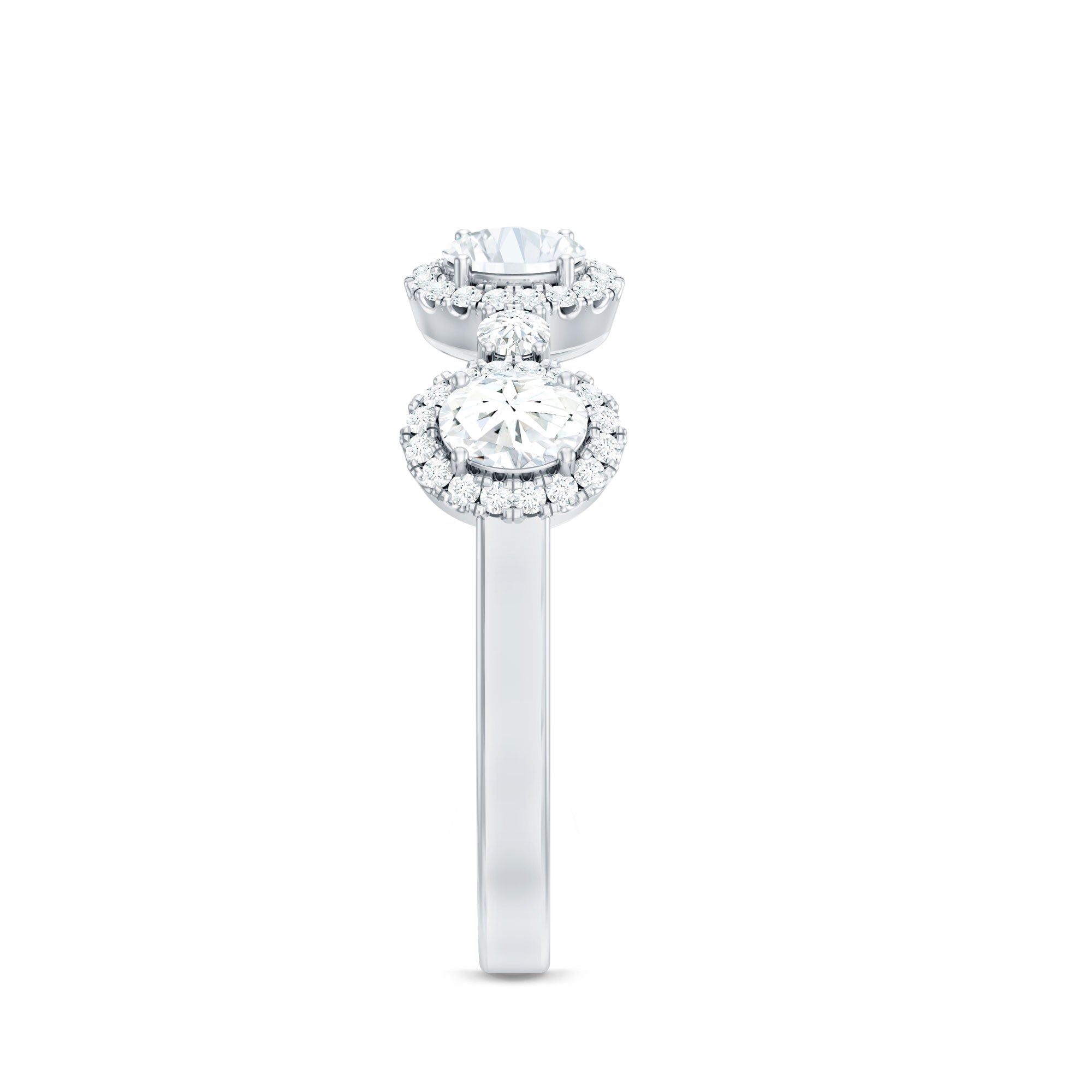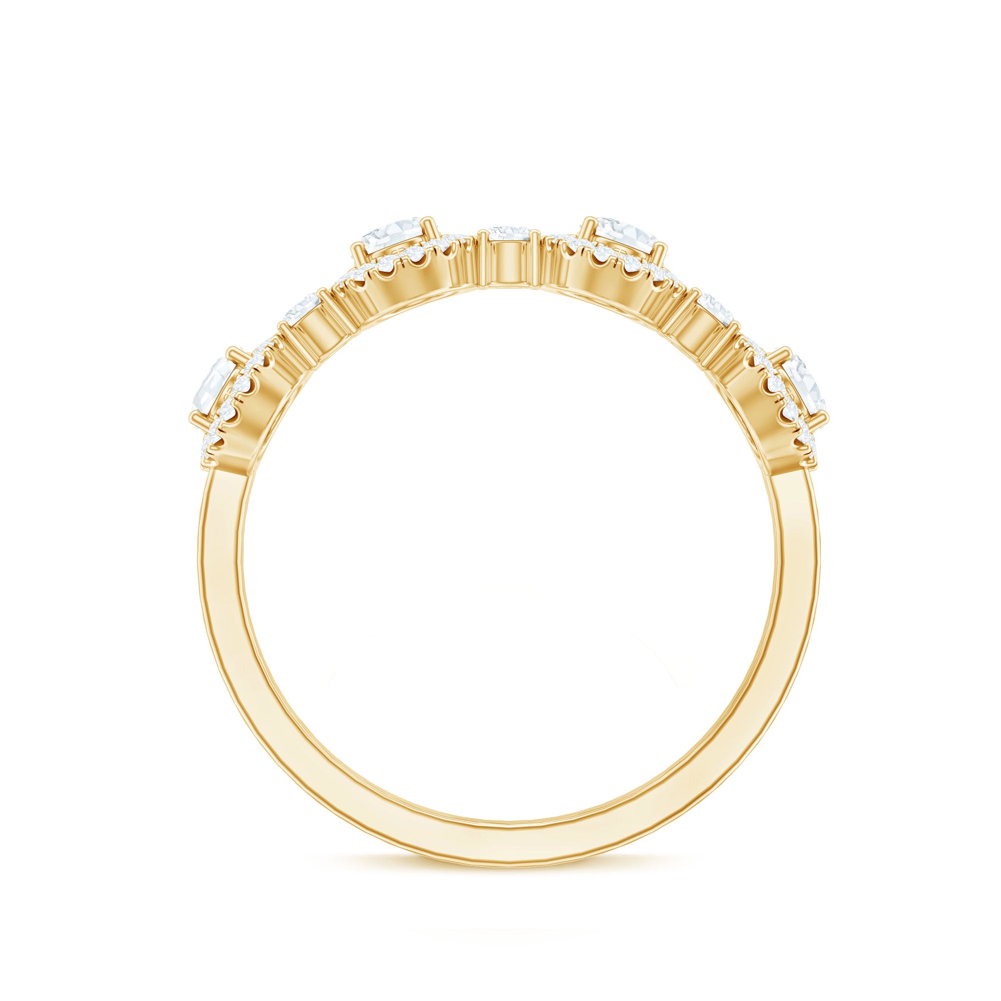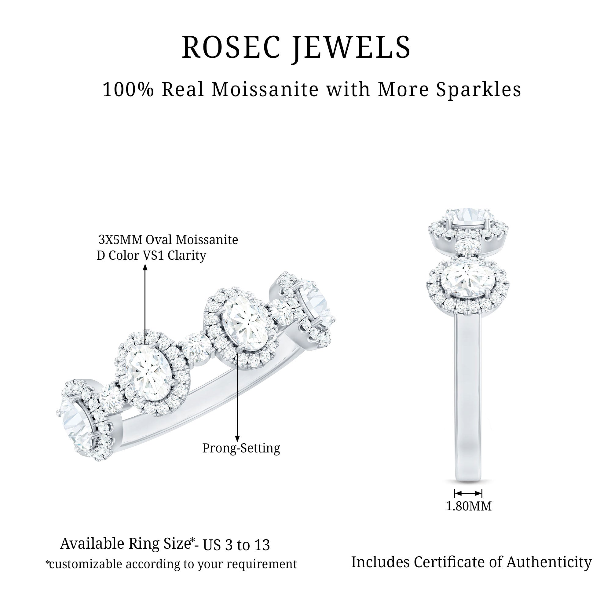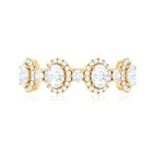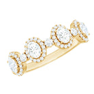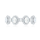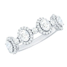 This beautifully designed Moissanite Half Eternity Ring brings together classic elegance and modern style in a way that is both refined and eye catching. Featuring a row of 3X5 MM oval shaped moissanite stones, each oval stone is surrounded by a delicate halo of round moissanite, creating a brilliant frame that enhances the sparkle. Between each oval halo is a single round moissanite, adding even more shine and detail to the band. All stones are set in secure prong setting, allowing maximum light to pass through and bring out the natural fire and brilliance of D-VS1 quality moissanite. This thoughtful arrangement creates a soft flow of sparkle across the top of the band while maintaining a smooth, comfortable fit underneath. The half eternity style makes it lightweight and easy to wear daily, while still offering the luxurious feel of a Designer Anniversary Ring. Ideal for marking special milestones, it works beautifully as an anniversary ring, a meaningful gift, or a personal treat. With its blend of thoughtful design and high-quality moissanite, this Halo Wedding Band captures the beauty of meaningful moments.
