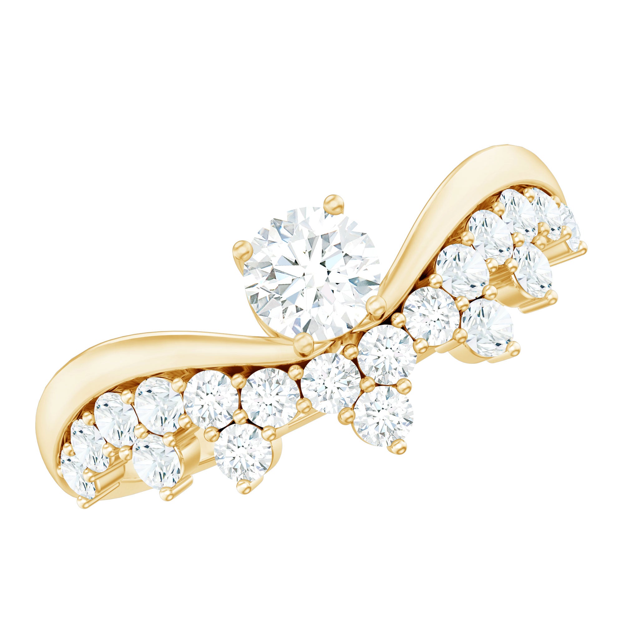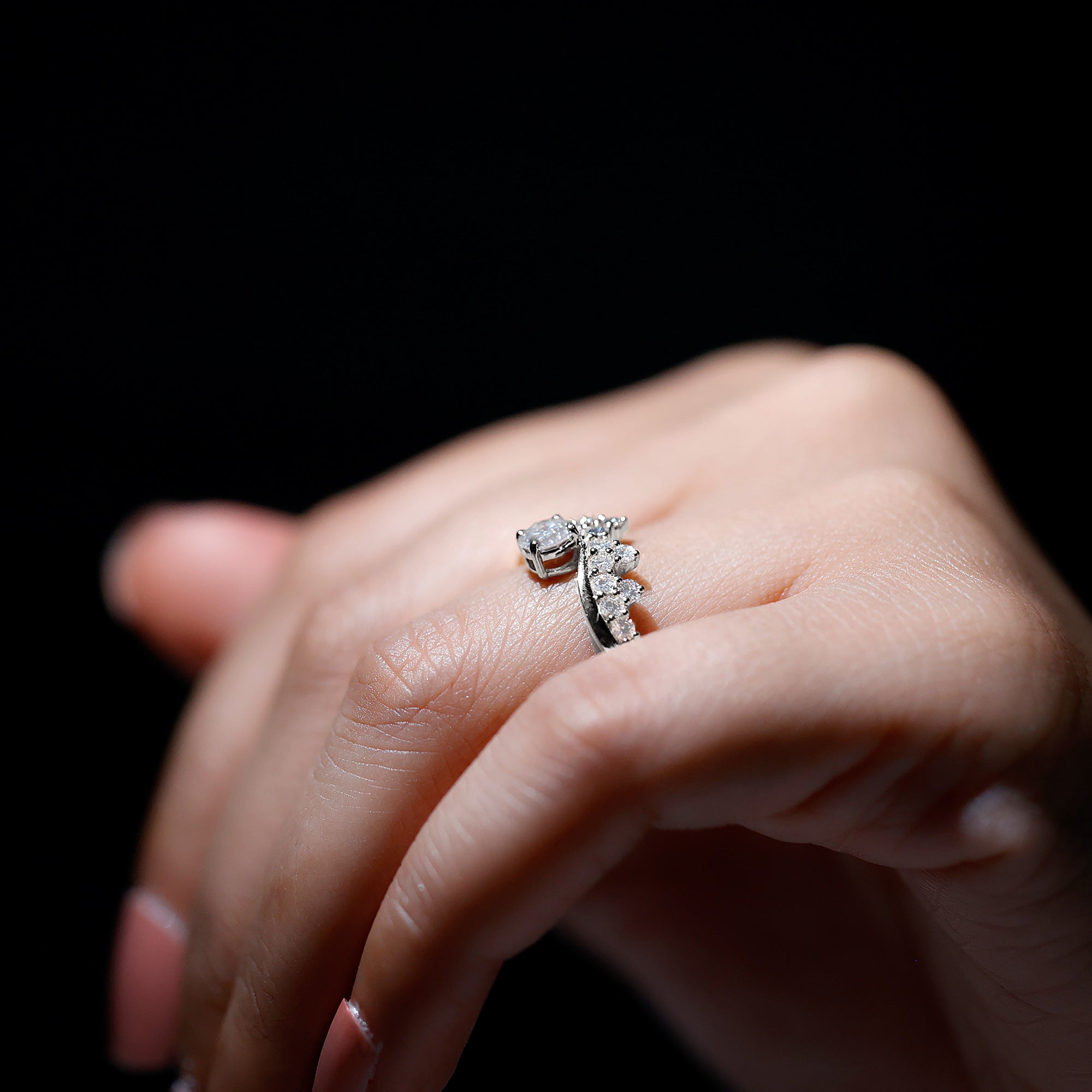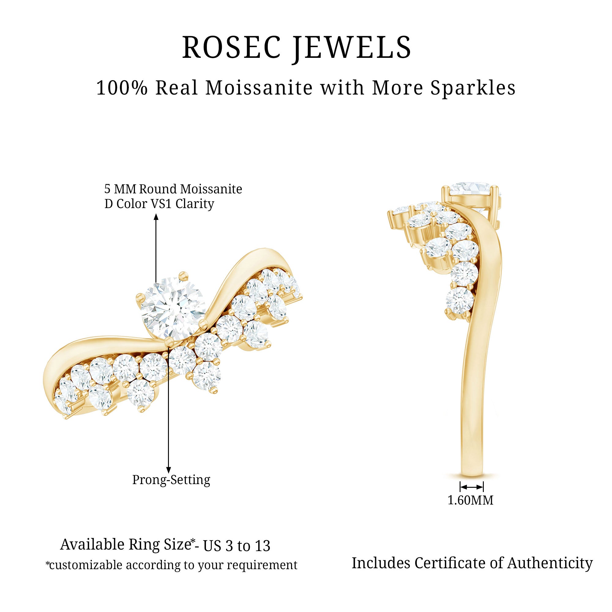 Step into forever with elegance and intention through this stunning Moissanite Engagement Ring. Thoughtfully crafted for the modern bride, this Designer Engagement Ring features a graceful Curved Band that gently embraces a dazzling 5 MM Round Shape Moissanite. Set in Prong Setting and accentuated with petite, shimmering stones, this ring delivers brilliance with every glance. The Moissanite stones are Certified with D-VS1 quality, promising exceptional color and clarity for a luminous finish that rivals traditional diamonds. More than just a piece of fine jewelry, this Curved Moissanite Ring represents a connection that is both meaningful and enduring. Its curved design is more than an aesthetic - it symbolizes unity, movement, and the natural flow of love. Perfectly suited for brides who appreciate both timeless beauty and modern sensibilities, this ring is a true reflection of individual style and heartfelt commitment. Every detail, from the stone placement to the smooth curvature, is designed to highlight the uniqueness of your journey. Whether it marks a proposal, a promise, or a personal milestone, this Curved Engagement Ring radiates with purpose and sophistication. This beauty is more than jewelry, it is a beautifully sculpted memory in the making.