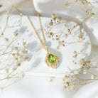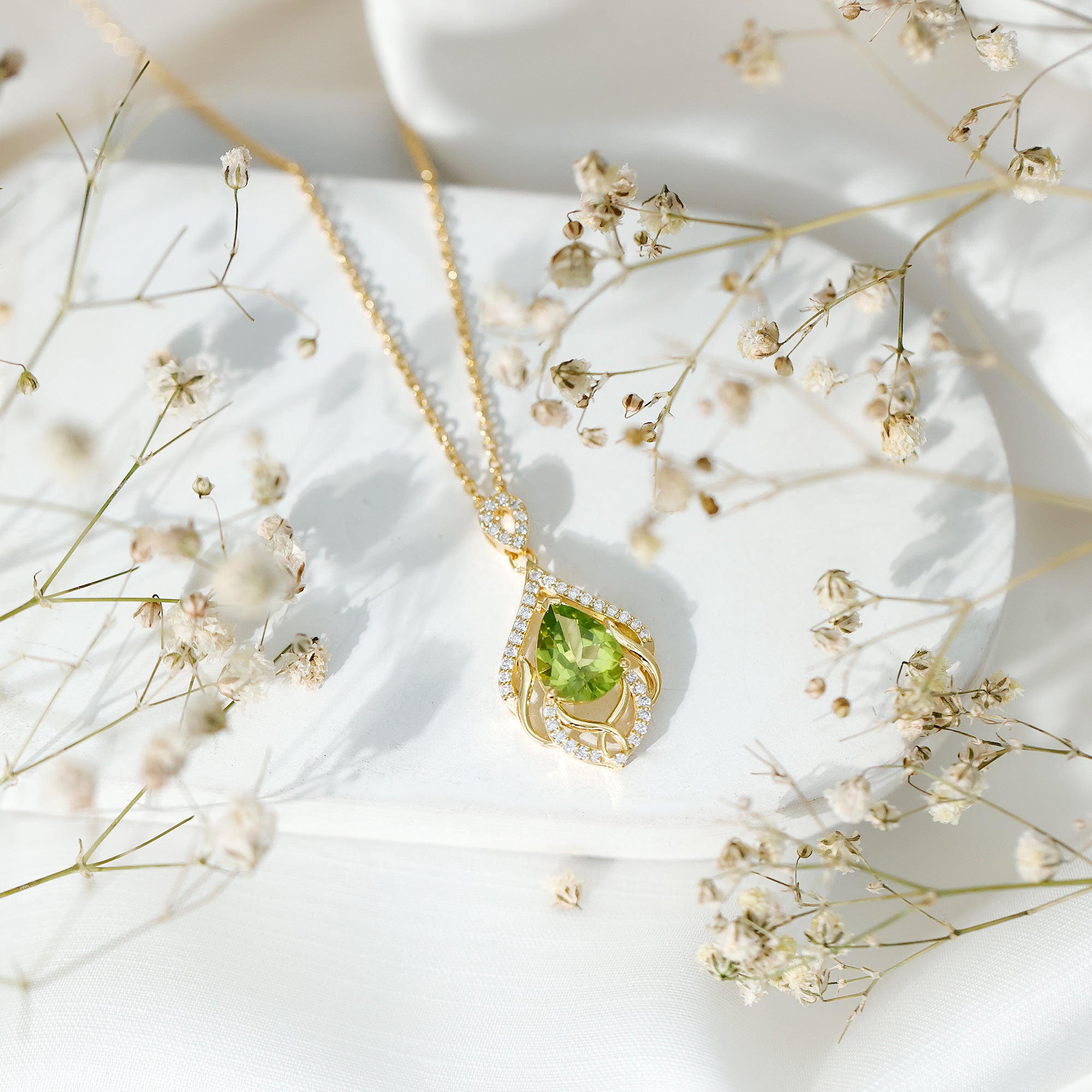 A beautiful blend of elegance and meaning, this Peridot Teardrop Necklace is designed to touch hearts with its graceful charm. Handcrafted in 14k yellow gold plated silver, the Designer Necklace features a stunning 8X10 MM pear shaped natural peridot set securely in prongs at the center of a delicate teardrop frame. The vivid green hue of the peridot represents harmony, strength, and new beginnings, making this piece ideal for brides or as a thoughtful gift for someone born in August. The teardrop frame is accented with round lab grown diamonds, adding just the right amount of sparkle while highlighting the gemstone’s natural beauty. Every detail speaks of refined craftsmanship, from the gentle curves of the pendant to the shimmering center stone that catches the light with every movement. Suspended from a sleek and adjustable chain secured with a lobster clasp, this Peridot and Diamond Necklace allows for versatile styling. The teardrop shape, often seen as a symbol of joyful emotions, adds a sentimental touch, making this Wedding Necklace for Bride more than just a piece of jewelry, it is a keepsake. Perfect for weddings, anniversaries, or birthdays, this Peridot Pendant Necklace is a timeless expression of love, grace, and individuality.