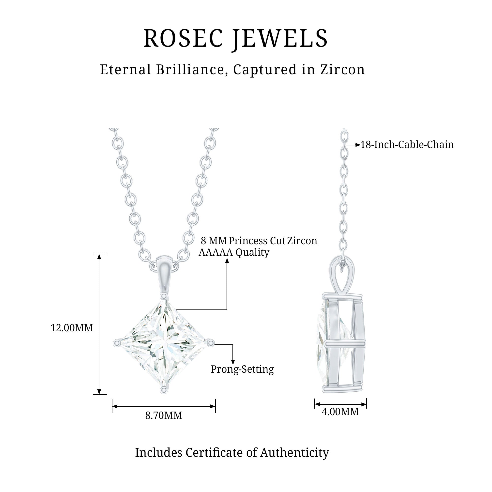 This Zircon Pendant will hang from your neck, completing an amazing and elegant look crafted with 14K White Gold Plated Silver. It features an 8 MM Princess Cut Zircon placed securely in 4 Prong Setting, accentuated with a standard bail. This Solitaire Pendant beholds the classic shine of AAAAA quality Cubic Zirconia, which will make you the center of the crowd. This pendant is also perfect to complete the wedding look with its striking shine. The pendant dangles with a sturdy cable chain that beautifies the neckline with its classic appearance. This Chain and Pendant will be delivered to you in a premium quality velvet pouch, ensuring safety and storage when not in use.