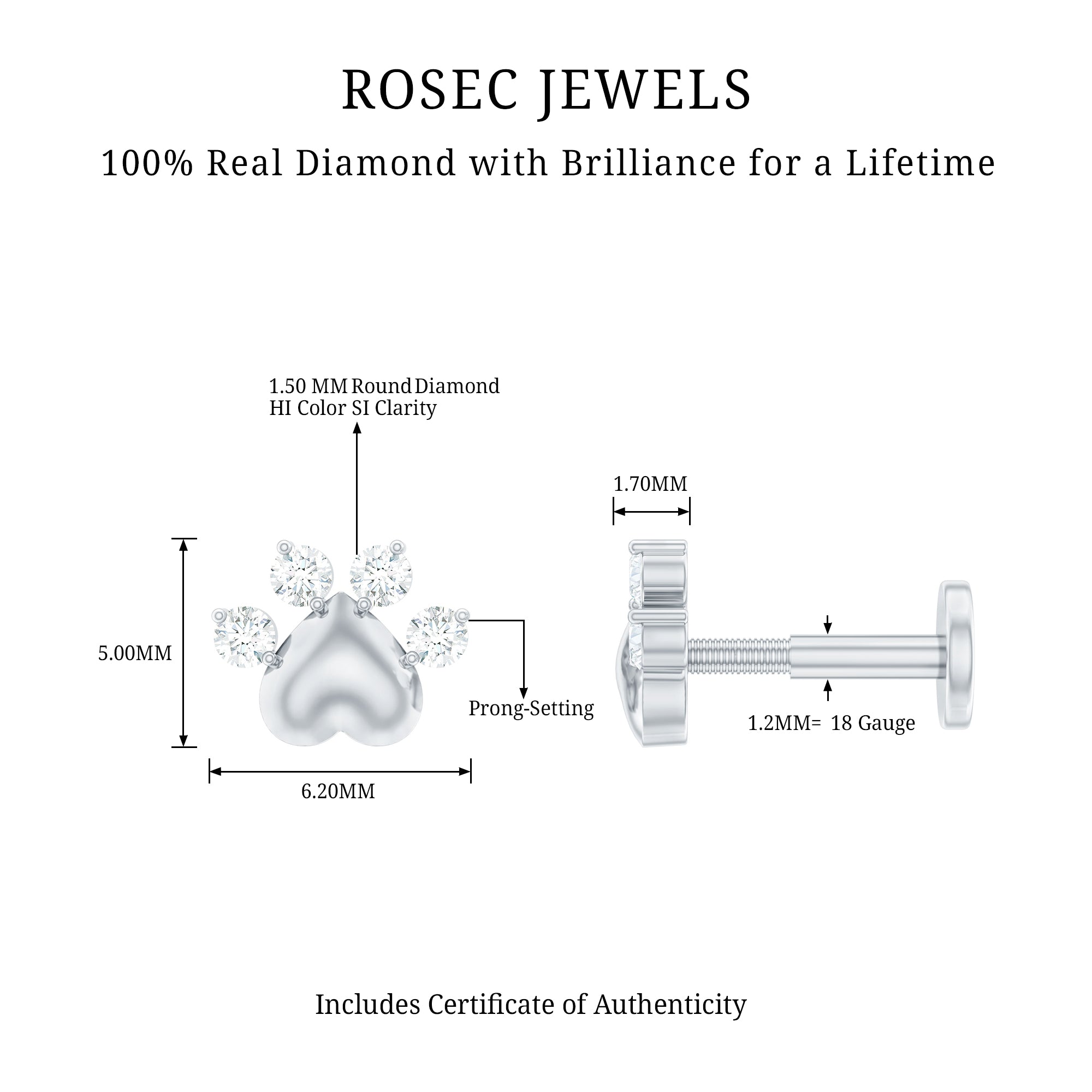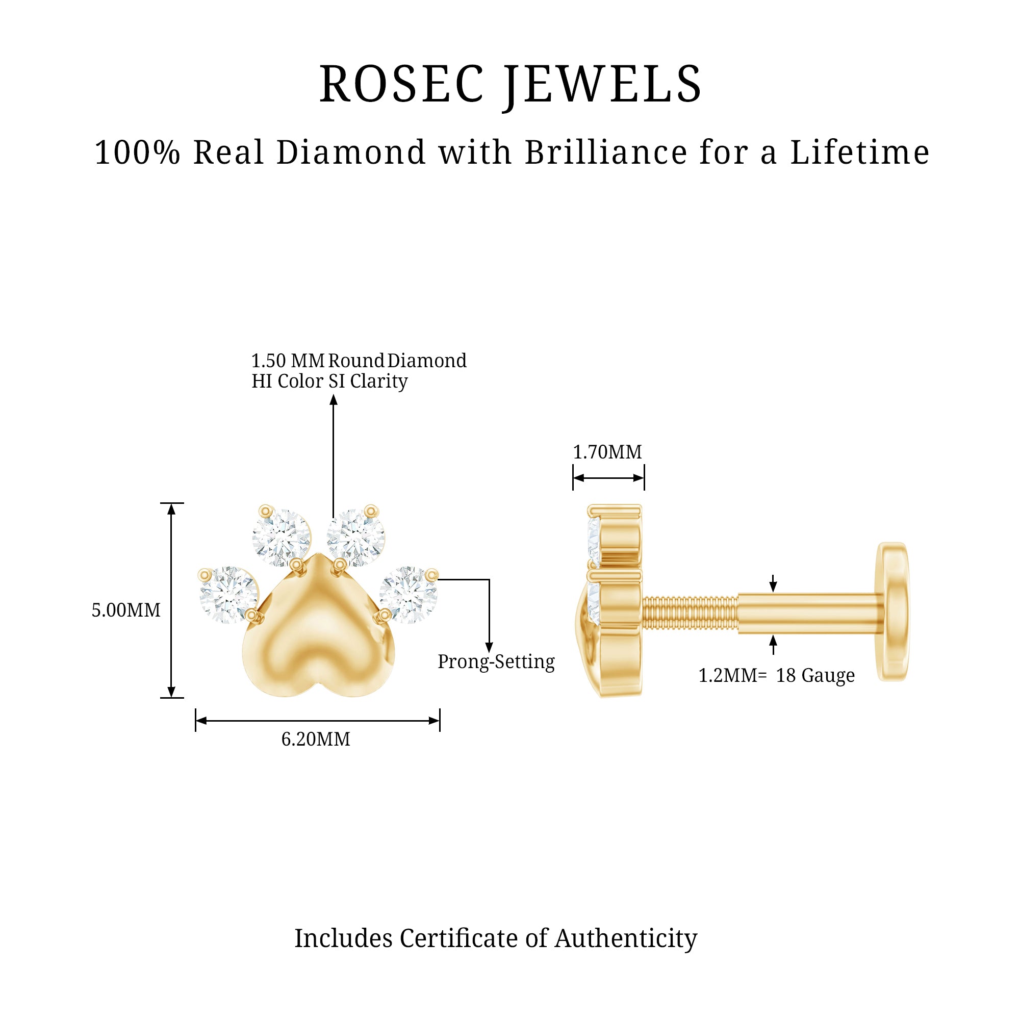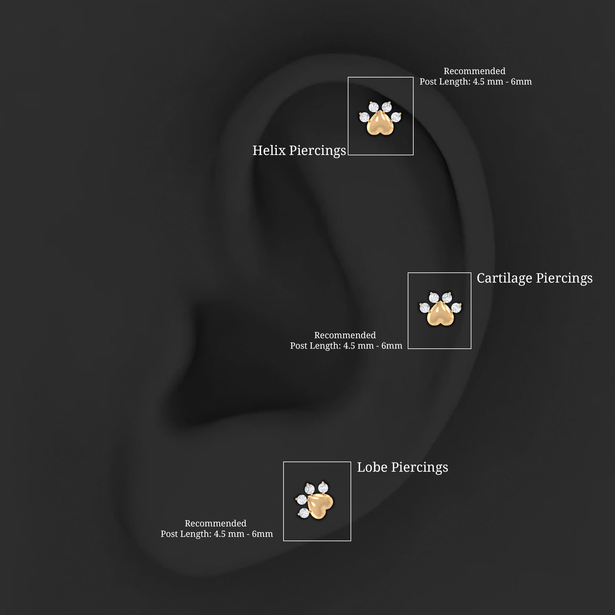 Every ear stack needs a playful piece, so heres our Diamond Paw Print Earring, made for showing off! Embellished with petite Round Brilliant Cut Diamonds set in Prong Setting with a puffed metal heart in the center, its minimal look allows you to stack it with your other ear jewelry collection. This Diamond Paw Earring comes with a flat back closure, ensuring no pokes or jabs disrupt your quick naps or beauty sleep extravaganzas. Perfect for Conch, Cartilage, Helix, or Upper Lobe Piercings. Are you ready to step up your style? This Dog Paw Earring can be paired with any outfit, from a party dress to a casual look, and you are sure to make a statement. Show your love for your furry friend with this Diamond Cartilage Earring, an exquisite symbol of affection and grace. This gorgeous Heart and Paw Earring is crafted with attention to detail, adding a bit of bling to your ensemble stylishly. Also, a perfect feminine accessory to make her feel truly special.