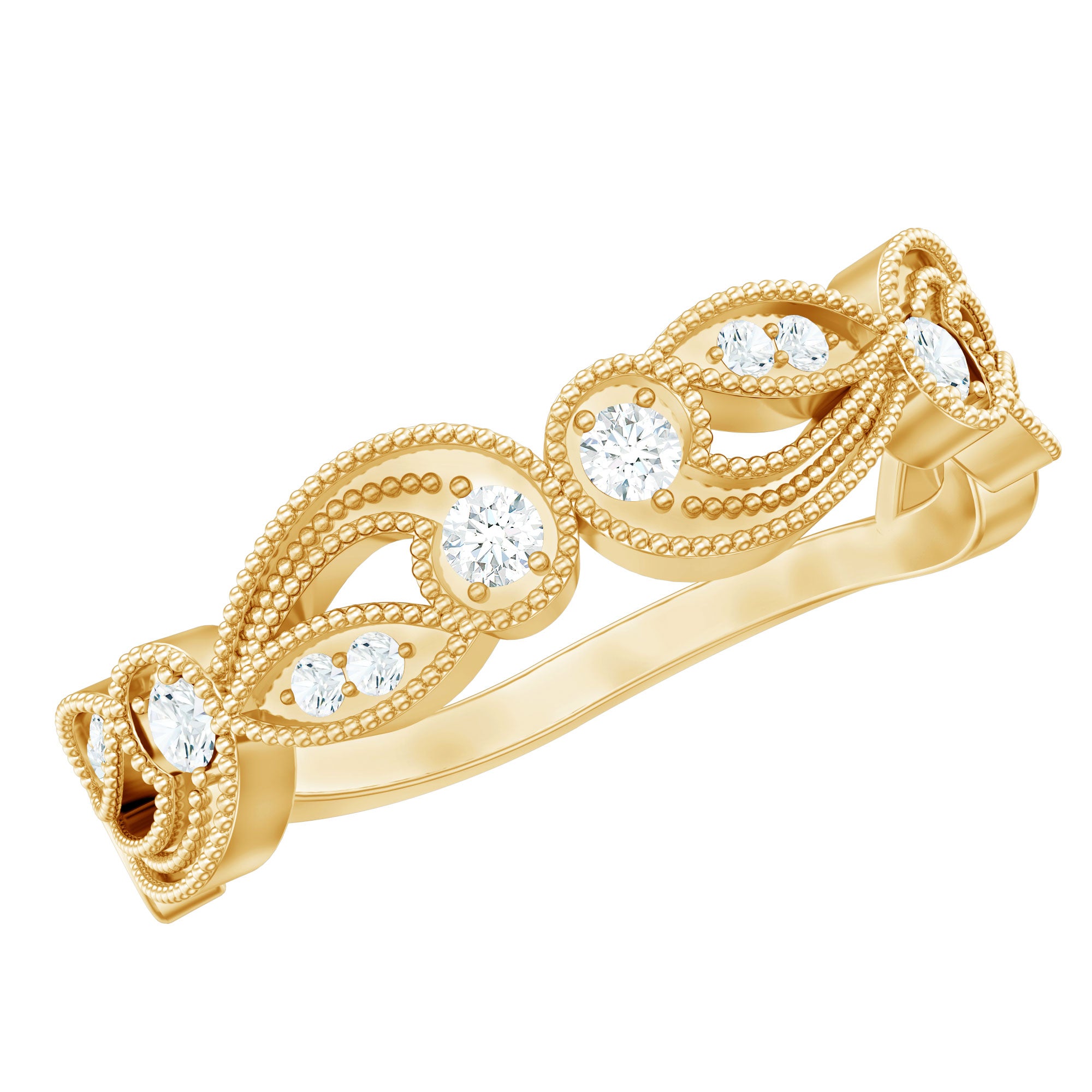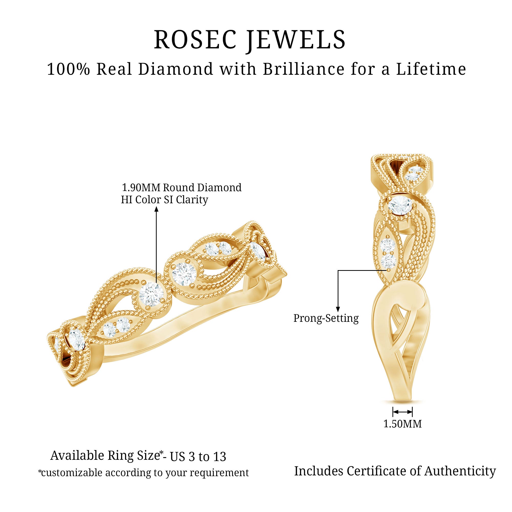 Make a strong promise with a ring that says it all. This Diamond Wedding Band is not just a piece of jewelry; it is a symbol of your everlasting love, striking enough to catch attention and classy enough to treasure for a lifetime. Adorned with dazzling Round Shape Diamond stones of HI-SI Quality set on an Ivy Scroll band with milgrain detailing, each stone shines with brilliance, fire, and clarity. The Vintage Inspired Design, echoing old-world elegance, creates a continuous sparkle that envelops the finger in luxurious refinement. Carefully crafted with stunning sparkle, this Wedding Anniversary Band is a work of art for those who seek both beauty and sophistication. It comes in a signature jewelry box and is available in US ring sizes 3 to 13, making this Art Deco Wedding Ring the perfect gift for anniversaries, milestones, or those unforgettable moments. Its bold and timeless design guarantees it will always be in vogue. This Vintage Diamond Band has a sparkle that lasts forever. Put it on and let your love story shine in every light. Made for someone who deserves only the best.