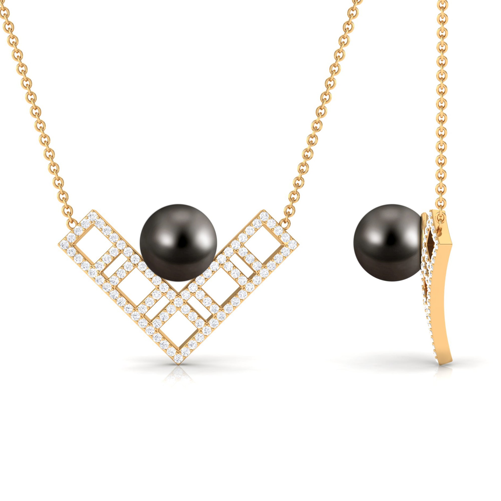 Stay on-trend every day with this stylish Gold V Shape Necklace. Adorned with bead set Tahitian Pearl and sparkling Diamond, this contemporary necklace is the perfect accessory for everyday styling. With its modern design and charming details, this necklace is sure to add a touch of sophistication to any outfit.
