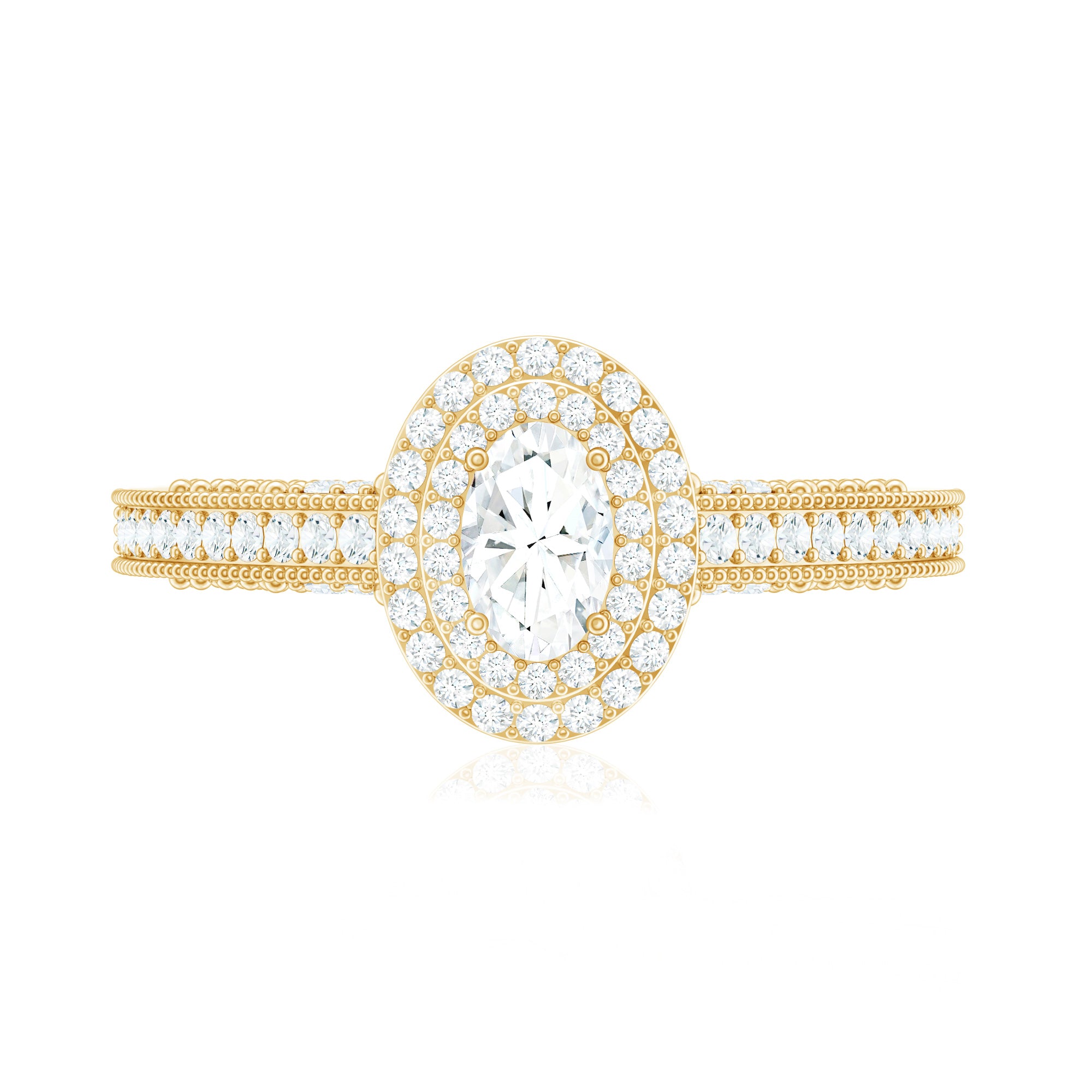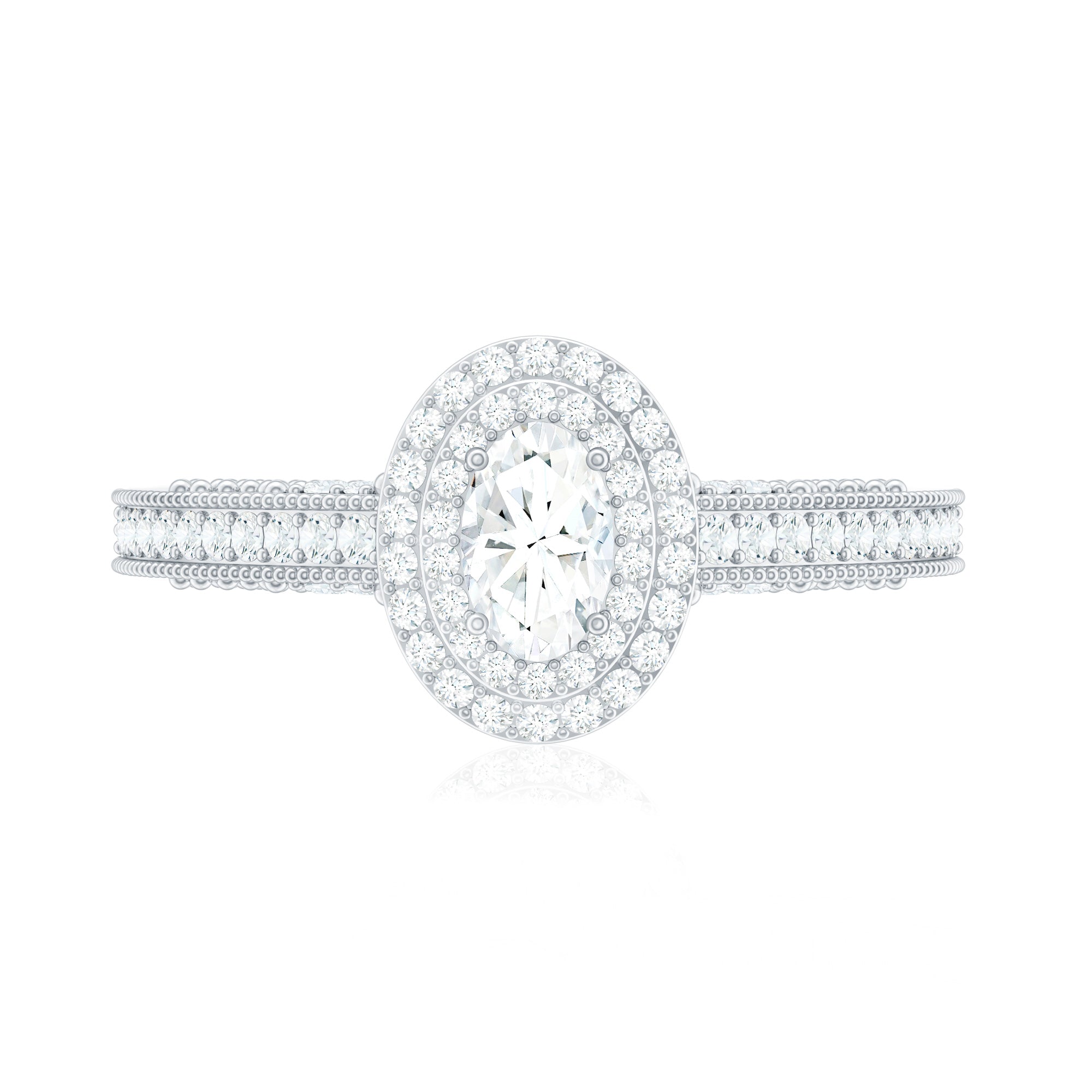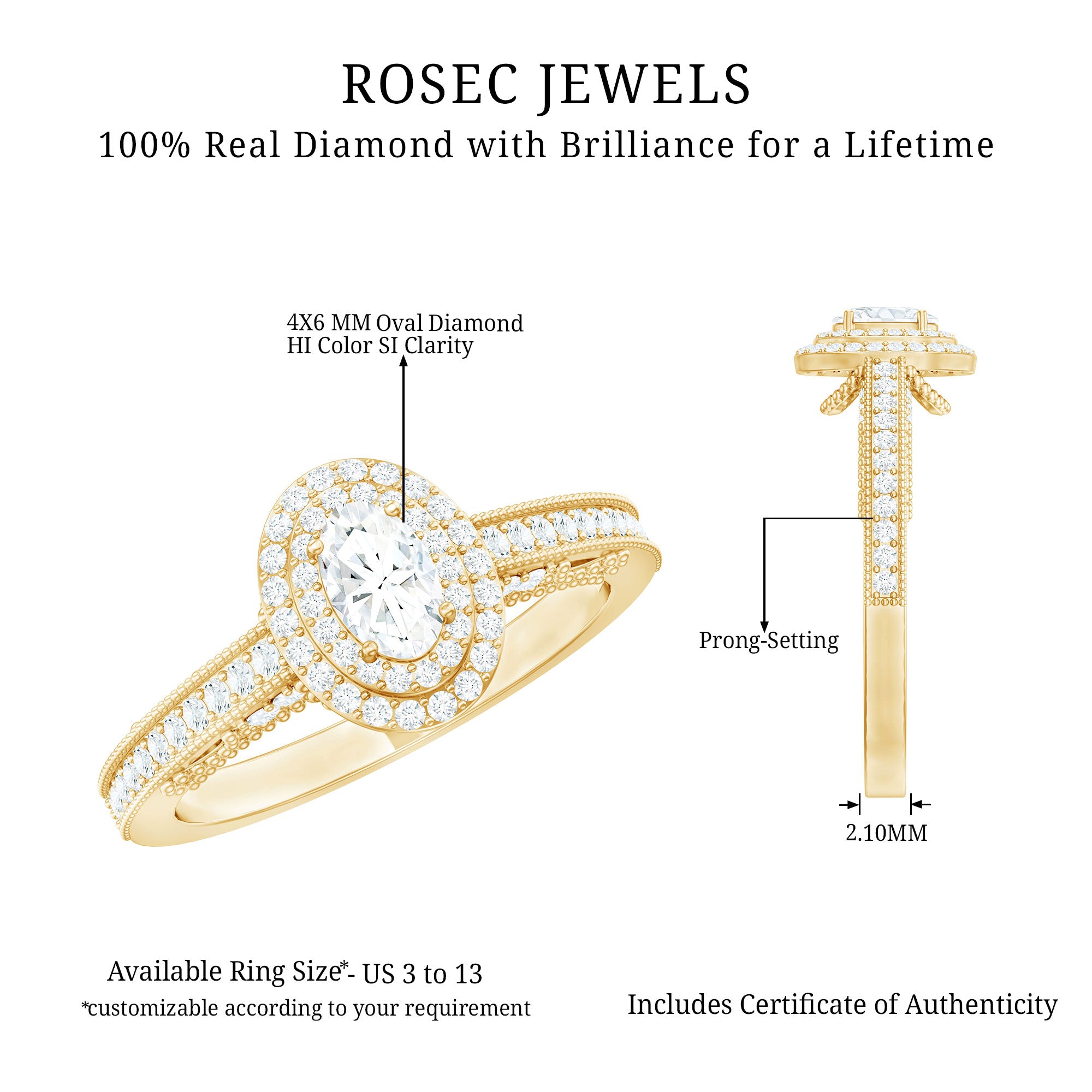 This Vintage Style Engagement Ring captures the essence of a beloved treasure from the past, designed to celebrate your future together. The Vintage design showcases a 4X6 MM oval diamond set in a prong setting. Encircling the central stone is a double halo of diamonds, while the side stones and detailed beading along the band and gallery reflect the elegance of antique craftsmanship, embodying the spirit of timeless design. It is perfect for brides in search of a distinctive piece that represents romance and infuses a hint of old-world charm. This Oval Diamond Engagement Ring stands as a poetic emblem of love that transcends time. Additionally, this Diamond Halo Ring is available in a variety of metal colors, ring sizes, and purity options, enabling you to create a truly customized piece that will be treasured for years to come. Make a bold statement with your style by wearing this Oval Engagement Ring, which sparkles with its everlasting beauty and signifies the promise of forever. Its vintage charm will elevate your look, adding a touch of brilliance.
